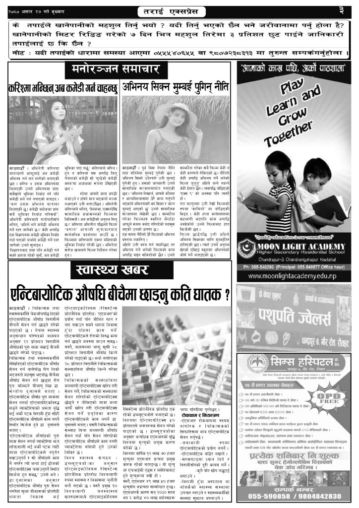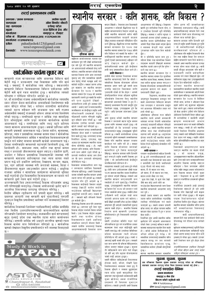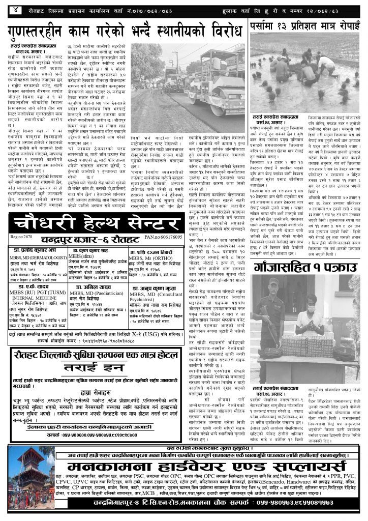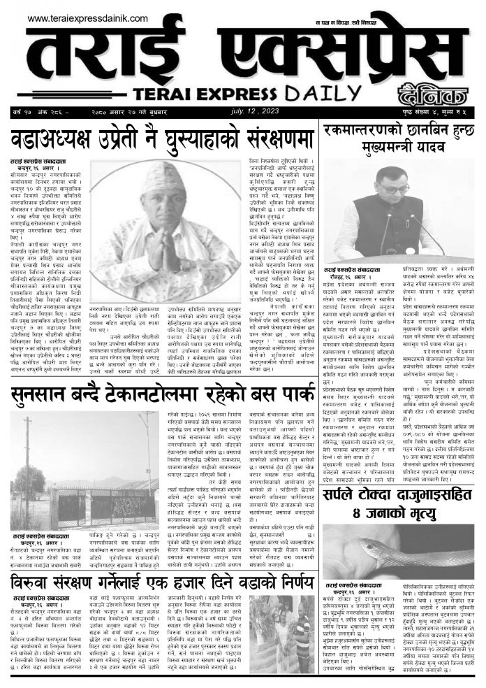 ई पेपरप्रदेशमधेश प्रदेशमुख्य समाचार २०८० असार २७ गतेको तराई एक्सप्रेस दैनिक तराई एक्सप्रेस दैनिक संवाददाता - July 12, 2023 RELATED ARTICLESMORE FROM AUTHOR ४० करोड कागज मिलाएको आरोपले मौलापुर ततायो यातायात व्यवस्था कार्यालय गौरमा सेवाग्राहीलाई ठगी गरेको आरोपमा एक जना पक्राउ २६ दिनमै ढल्यो गृहमन्त्रीको कुर्सी, सुधन गुरुङ ‘लगानी काण्ड’मा आउट! ताजा अपडेट ४० करोड कागज मिलाएको आरोपले मौलापुर ततायो April 23, 2026 ‘सेफ गल्र्स’ परियोजनाअन्तर्गत सेवा प्रदायक लक्षित पाँच दिने तालिम सम्पन्न April 23, 2026 यातायात व्यवस्था कार्यालय गौरमा सेवाग्राहीलाई ठगी गरेको आरोपमा एक जना पक्राउ April 22, 2026 जिल्ला धाउने दिन सकिने दाबी, व्यवहारमा कति सम्भव ? April 22, 2026 २६ दिनमै ढल्यो गृहमन्त्रीको कुर्सी, सुधन गुरुङ ‘लगानी काण्ड’मा आउट! April 22, 2026 धेरैले पढेको ४० करोड कागज मिलाएको आरोपले मौलापुर ततायो April 23, 2026 ‘सेफ गल्र्स’ परियोजनाअन्तर्गत सेवा प्रदायक लक्षित पाँच दिने तालिम सम्पन्न April 23, 2026 यातायात व्यवस्था कार्यालय गौरमा सेवाग्राहीलाई ठगी गरेको आरोपमा एक जना पक्राउ April 22, 2026 जिल्ला धाउने दिन सकिने दाबी, व्यवहारमा कति सम्भव ? April 22, 2026 २६ दिनमै ढल्यो गृहमन्त्रीको कुर्सी, सुधन गुरुङ ‘लगानी काण्ड’मा आउट! April 22, 2026