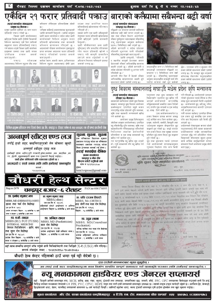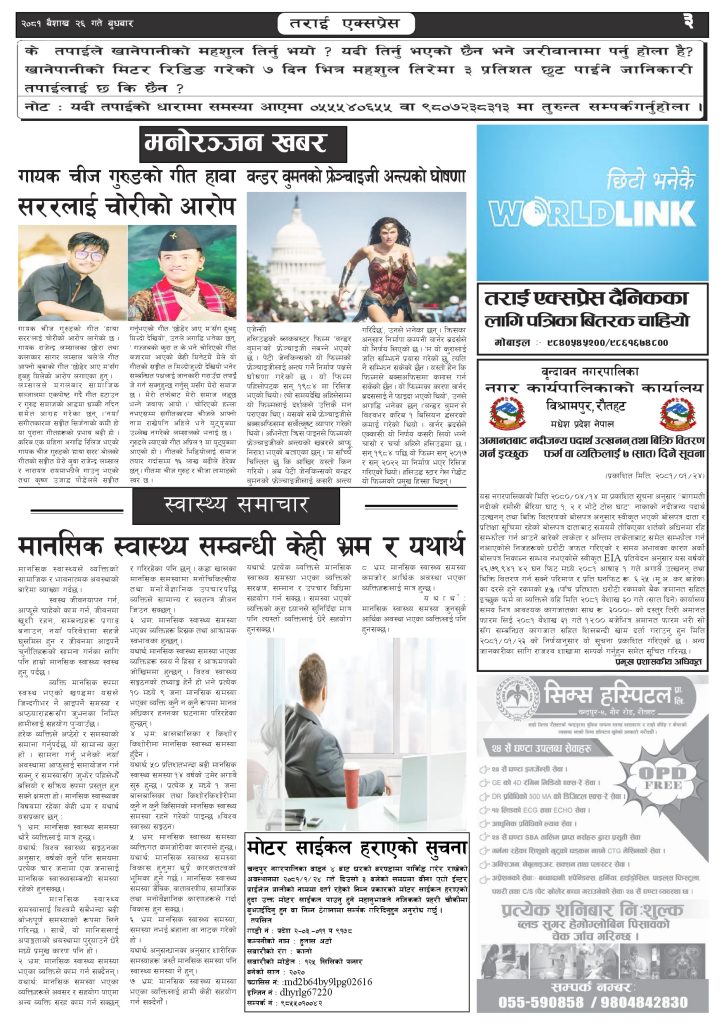 ई पेपरप्रदेशमधेश प्रदेशमुख्य समाचार २०८१ बैशाख २६ गतेको तराई एक्सप्रेस दैनिक तराई एक्सप्रेस दैनिक - May 8, 2024 RELATED ARTICLESMORE FROM AUTHOR ४० करोड कागज मिलाएको आरोपले मौलापुर ततायो यातायात व्यवस्था कार्यालय गौरमा सेवाग्राहीलाई ठगी गरेको आरोपमा एक जना पक्राउ २६ दिनमै ढल्यो गृहमन्त्रीको कुर्सी, सुधन गुरुङ ‘लगानी काण्ड’मा आउट! ताजा अपडेट ४० करोड कागज मिलाएको आरोपले मौलापुर ततायो April 23, 2026 ‘सेफ गल्र्स’ परियोजनाअन्तर्गत सेवा प्रदायक लक्षित पाँच दिने तालिम सम्पन्न April 23, 2026 यातायात व्यवस्था कार्यालय गौरमा सेवाग्राहीलाई ठगी गरेको आरोपमा एक जना पक्राउ April 22, 2026 जिल्ला धाउने दिन सकिने दाबी, व्यवहारमा कति सम्भव ? April 22, 2026 २६ दिनमै ढल्यो गृहमन्त्रीको कुर्सी, सुधन गुरुङ ‘लगानी काण्ड’मा आउट! April 22, 2026 धेरैले पढेको ४० करोड कागज मिलाएको आरोपले मौलापुर ततायो April 23, 2026 ‘सेफ गल्र्स’ परियोजनाअन्तर्गत सेवा प्रदायक लक्षित पाँच दिने तालिम सम्पन्न April 23, 2026 यातायात व्यवस्था कार्यालय गौरमा सेवाग्राहीलाई ठगी गरेको आरोपमा एक जना पक्राउ April 22, 2026 जिल्ला धाउने दिन सकिने दाबी, व्यवहारमा कति सम्भव ? April 22, 2026 २६ दिनमै ढल्यो गृहमन्त्रीको कुर्सी, सुधन गुरुङ ‘लगानी काण्ड’मा आउट! April 22, 2026