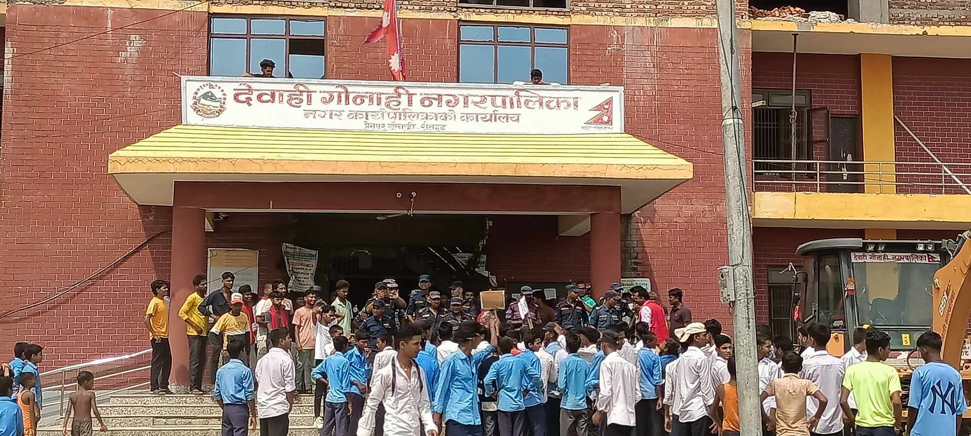 रौतहट, ८ असोज । रौतहटको देवाही गोनाही नगरपालिकाको अवस्था तनावग्रस्त बनेको छ । देवाहीका मेयर प्रेमलाल साहले आफ्ना मनोमानी ढंगले एक विद्यालयको प्रधानाध्यापकको सरुवा गर्न लागेको भन्दै विद्यार्थीहरु आन्दोलनमा उत्रेपछि सो नगरपालिकाको अवस्था तनावग्रस्त बन्न पुगेको हो ।