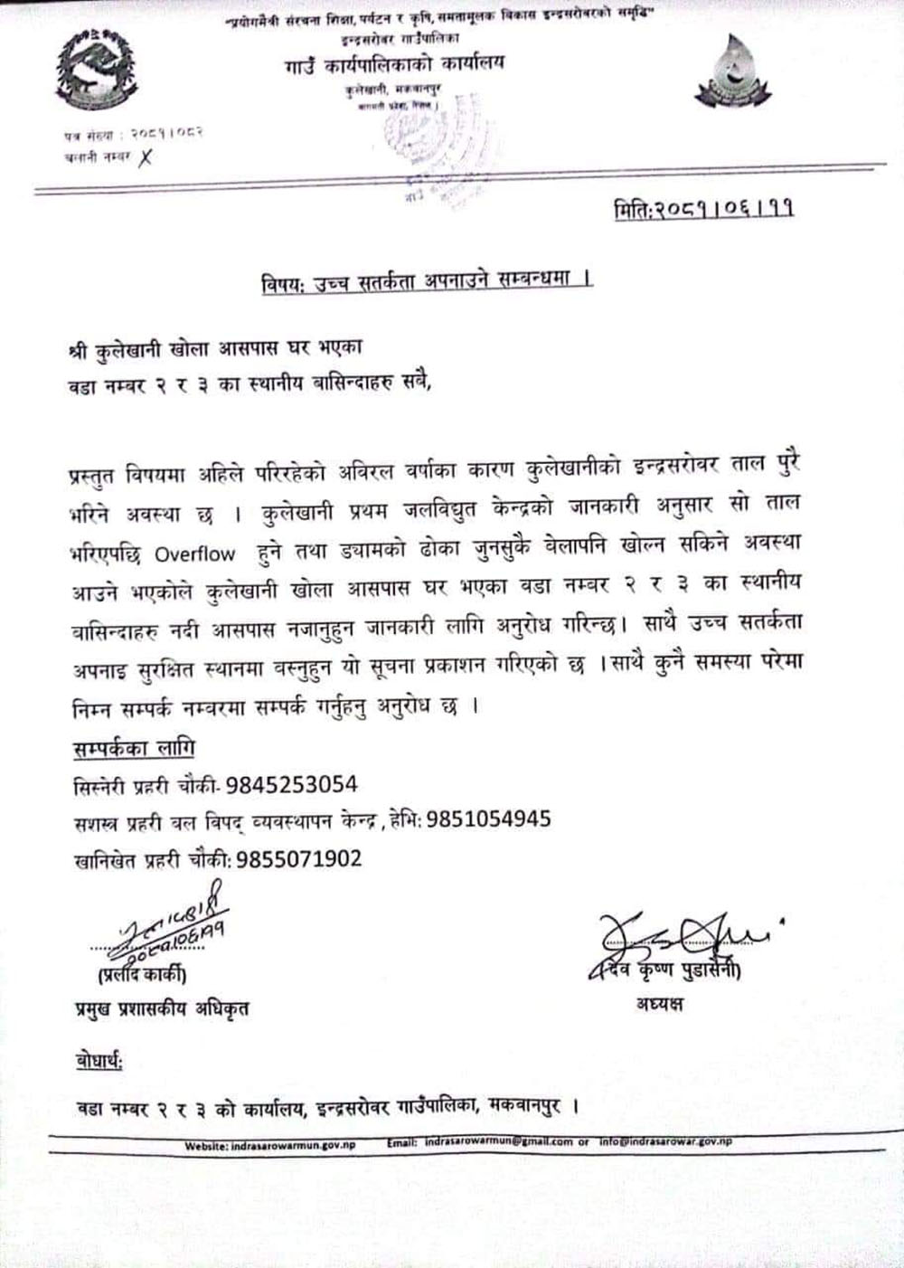 त्यस्तै इन्द्रसरोवर गाउँपालिकाले कुलेखानी आसपास घर भएका वडा नम्बर २ र ३ का स्थानीयलाई सुरक्षित स्थानमा बस्न र नदीको आसपास नजान आग्रह गरेको छ ।