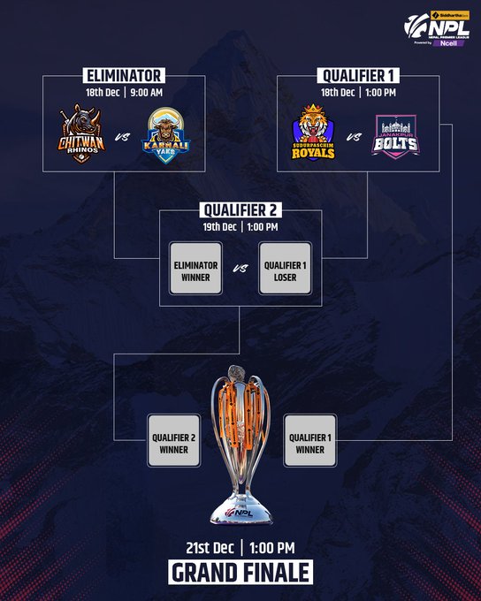 काठमाडौं, ४ पुस । आज जनकपुर बोल्टस र कर्णाली याक्स बिचमा प्रतिस्पर्धा हुदैँछ ।