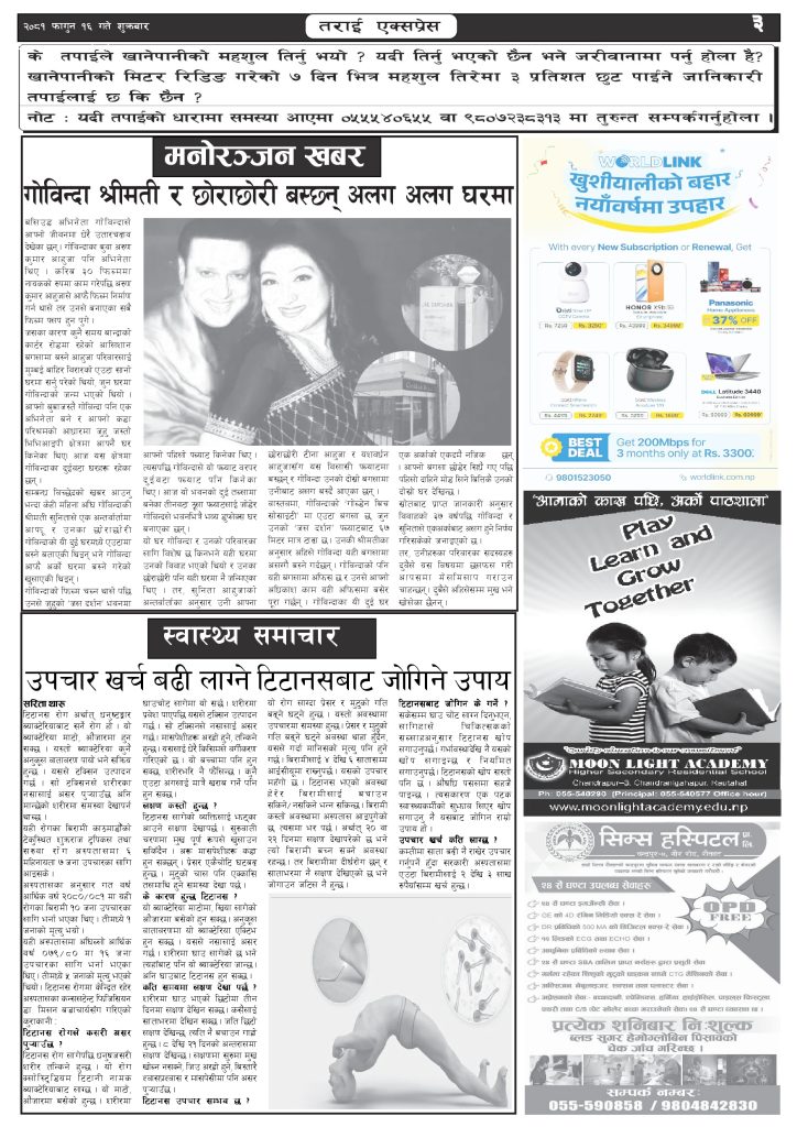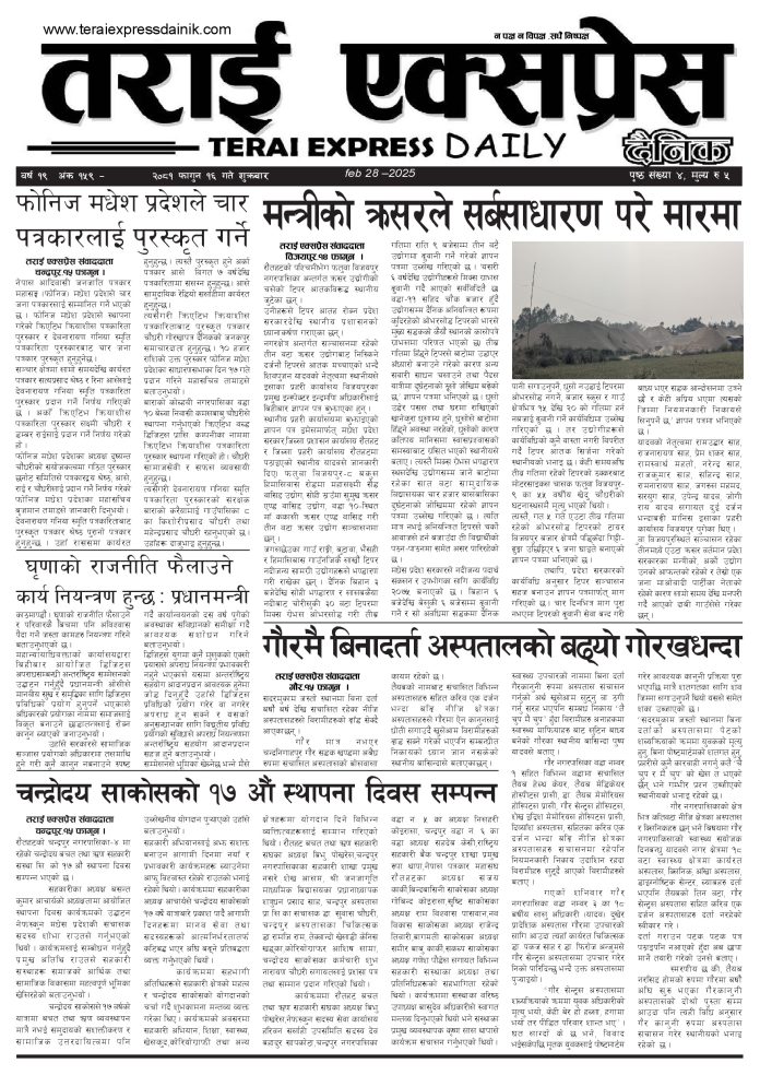 ई पेपर २०८१ फागुन १६ गतेको तराई एक्सप्रेस दैनिक तराई एक्सप्रेस दैनिक - February 28, 2025 RELATED ARTICLESMORE FROM AUTHOR २०७३ वैशाख ९ गतेको तराई एक्सप्रेस दैनिक २०८२ वैशाख ८ गतेको तराई एक्सप्रेस दैनिक २०७३ वैशाख ३ गतेको तराई एक्सप्रेस दैनिक ताजा अपडेट २०७३ वैशाख ९ गतेको तराई एक्सप्रेस दैनिक April 22, 2026 राजमार्ग कब्जा गर्नेको दिन गयो: सरकार ‘एक्सन मोड’मा April 21, 2026 काजको आडमा असुली धन्धा : प्रहरीभित्रै ‘नेटवर्क’ चल्दै April 21, 2026 ओभरसियरले उल्टै थर्काए स्थानीय April 21, 2026 आजको राशिफल April 21, 2026 धेरैले पढेको २०७३ वैशाख ९ गतेको तराई एक्सप्रेस दैनिक April 22, 2026 राजमार्ग कब्जा गर्नेको दिन गयो: सरकार ‘एक्सन मोड’मा April 21, 2026 काजको आडमा असुली धन्धा : प्रहरीभित्रै ‘नेटवर्क’ चल्दै April 21, 2026 ओभरसियरले उल्टै थर्काए स्थानीय April 21, 2026 आजको राशिफल April 21, 2026
