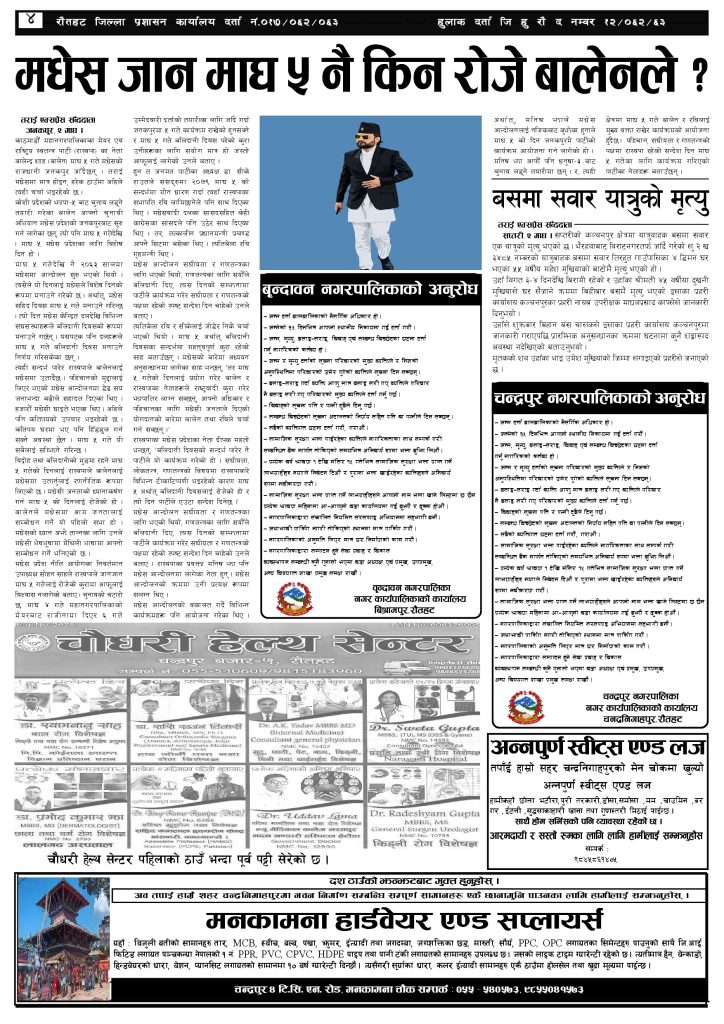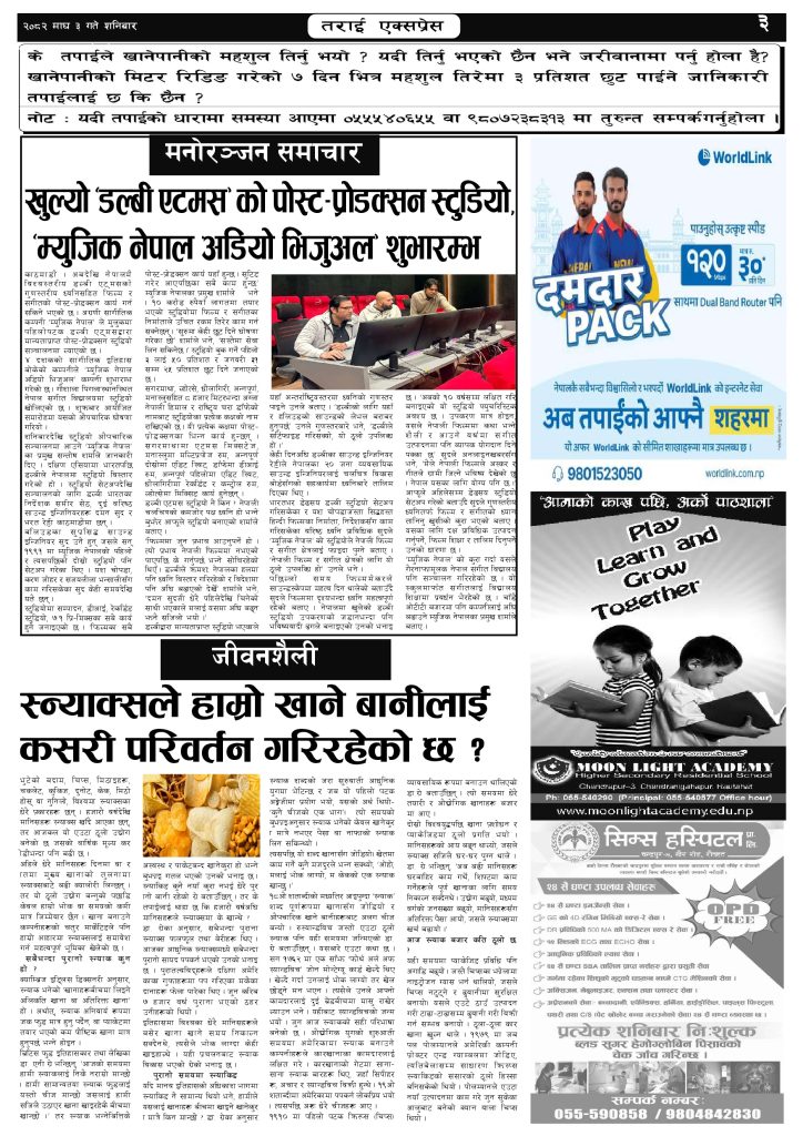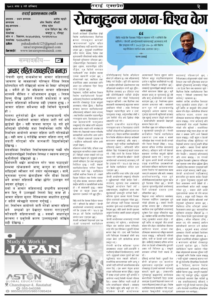 ई पेपर २०८२ माघ ३ गतेको तराई एक्सप्रेस दैनिक तराई एक्सप्रेस दैनिक - January 17, 2026 RELATED ARTICLESMORE FROM AUTHOR २०७३ वैशाख ९ गतेको तराई एक्सप्रेस दैनिक २०८२ वैशाख ८ गतेको तराई एक्सप्रेस दैनिक २०७३ वैशाख ३ गतेको तराई एक्सप्रेस दैनिक ताजा अपडेट यातायात व्यवस्था कार्यालय गौरमा सेवाग्राहीलाई ठगी गरेको आरोपमा एक जना पक्राउ April 22, 2026 जिल्ला धाउने दिन सकिने दाबी, व्यवहारमा कति सम्भव ? April 22, 2026 २६ दिनमै ढल्यो गृहमन्त्रीको कुर्सी, सुधन गुरुङ ‘लगानी काण्ड’मा आउट! April 22, 2026 २०७३ वैशाख ९ गतेको तराई एक्सप्रेस दैनिक April 22, 2026 राजमार्ग कब्जा गर्नेको दिन गयो: सरकार ‘एक्सन मोड’मा April 21, 2026 धेरैले पढेको यातायात व्यवस्था कार्यालय गौरमा सेवाग्राहीलाई ठगी गरेको आरोपमा एक जना पक्राउ April 22, 2026 जिल्ला धाउने दिन सकिने दाबी, व्यवहारमा कति सम्भव ? April 22, 2026 २६ दिनमै ढल्यो गृहमन्त्रीको कुर्सी, सुधन गुरुङ ‘लगानी काण्ड’मा आउट! April 22, 2026 २०७३ वैशाख ९ गतेको तराई एक्सप्रेस दैनिक April 22, 2026 राजमार्ग कब्जा गर्नेको दिन गयो: सरकार ‘एक्सन मोड’मा April 21, 2026