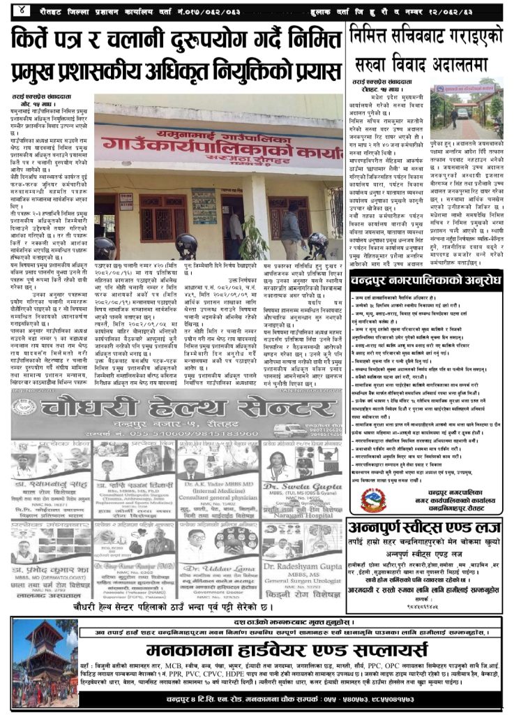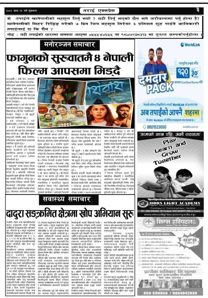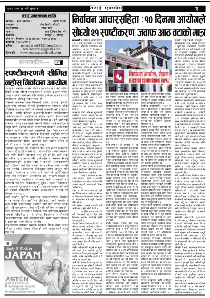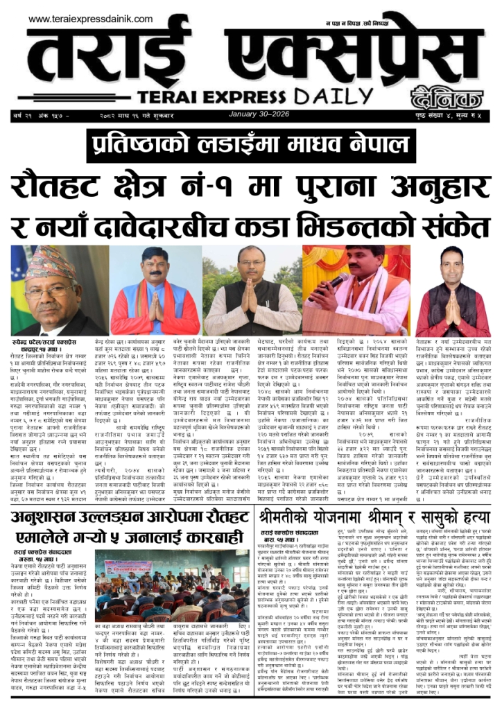 ई पेपर २०८२ माघ १६ गतेको तराई एक्सप्रेस दैनिक तराई एक्सप्रेस दैनिक - January 31, 2026 RELATED ARTICLESMORE FROM AUTHOR २०७३ वैशाख ३ गतेको तराई एक्सप्रेस दैनिक २०८२ चैत ३० गतेको तराई एक्सप्रेस दैनिक २०८२ चैत २९ गतेको तराई एक्सप्रेस दैनिक ताजा अपडेट चन्द्रपुर १० का परियार पोखराबाट पक्राउ April 17, 2026 २०७३ वैशाख ३ गतेको तराई एक्सप्रेस दैनिक April 16, 2026 शिवशक्ति सामुदायिक वनको सयौं रुख सफाया April 16, 2026 ऋषि धमलाको रिपोर्टर क्लबमा समाज कल्याण परिषद्को हमला April 13, 2026 मधेसको कडाइको ‘रिटर्न गिफ्ट’ : भारतमा नेपालीलाई पेट्रोल बन्द April 13, 2026 धेरैले पढेको चन्द्रपुर १० का परियार पोखराबाट पक्राउ April 17, 2026 २०७३ वैशाख ३ गतेको तराई एक्सप्रेस दैनिक April 16, 2026 शिवशक्ति सामुदायिक वनको सयौं रुख सफाया April 16, 2026 ऋषि धमलाको रिपोर्टर क्लबमा समाज कल्याण परिषद्को हमला April 13, 2026 मधेसको कडाइको ‘रिटर्न गिफ्ट’ : भारतमा नेपालीलाई पेट्रोल बन्द April 13, 2026