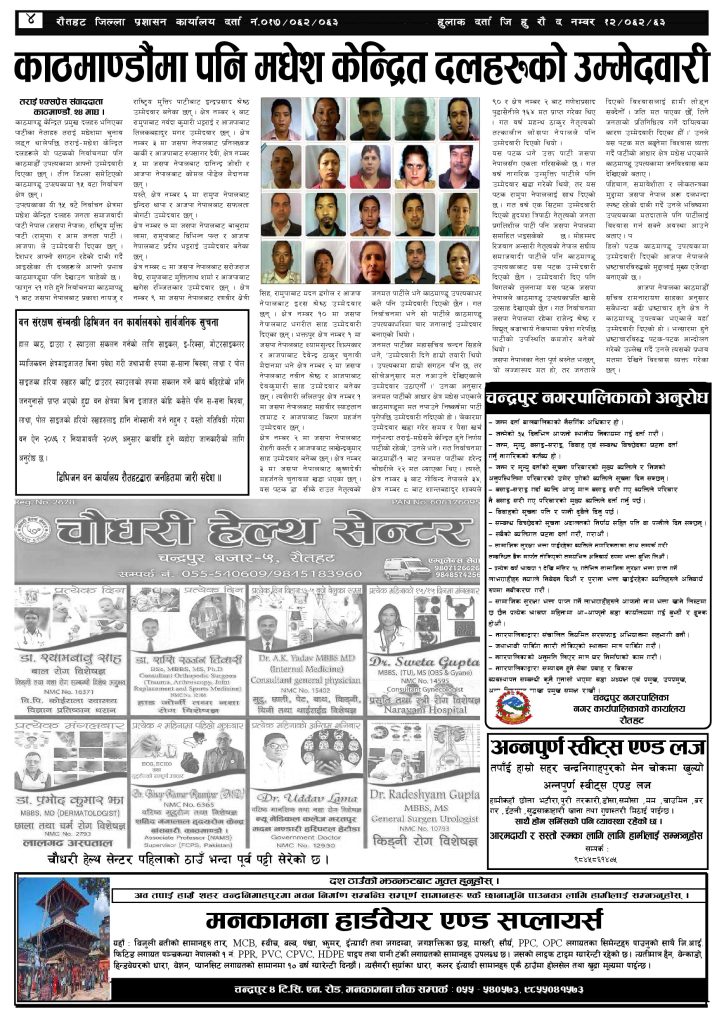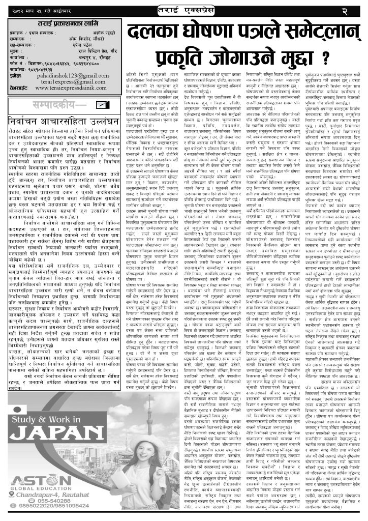 ई पेपर २०८२ माघ २५ गतेको तराई एक्सप्रेस दैनिक तराई एक्सप्रेस दैनिक - February 8, 2026 RELATED ARTICLESMORE FROM AUTHOR २०७३ वैशाख ३ गतेको तराई एक्सप्रेस दैनिक २०८२ चैत ३० गतेको तराई एक्सप्रेस दैनिक २०८२ चैत २९ गतेको तराई एक्सप्रेस दैनिक ताजा अपडेट चन्द्रपुर १० का परियार पोखराबाट पक्राउ April 17, 2026 २०७३ वैशाख ३ गतेको तराई एक्सप्रेस दैनिक April 16, 2026 शिवशक्ति सामुदायिक वनको सयौं रुख सफाया April 16, 2026 ऋषि धमलाको रिपोर्टर क्लबमा समाज कल्याण परिषद्को हमला April 13, 2026 मधेसको कडाइको ‘रिटर्न गिफ्ट’ : भारतमा नेपालीलाई पेट्रोल बन्द April 13, 2026 धेरैले पढेको चन्द्रपुर १० का परियार पोखराबाट पक्राउ April 17, 2026 २०७३ वैशाख ३ गतेको तराई एक्सप्रेस दैनिक April 16, 2026 शिवशक्ति सामुदायिक वनको सयौं रुख सफाया April 16, 2026 ऋषि धमलाको रिपोर्टर क्लबमा समाज कल्याण परिषद्को हमला April 13, 2026 मधेसको कडाइको ‘रिटर्न गिफ्ट’ : भारतमा नेपालीलाई पेट्रोल बन्द April 13, 2026
