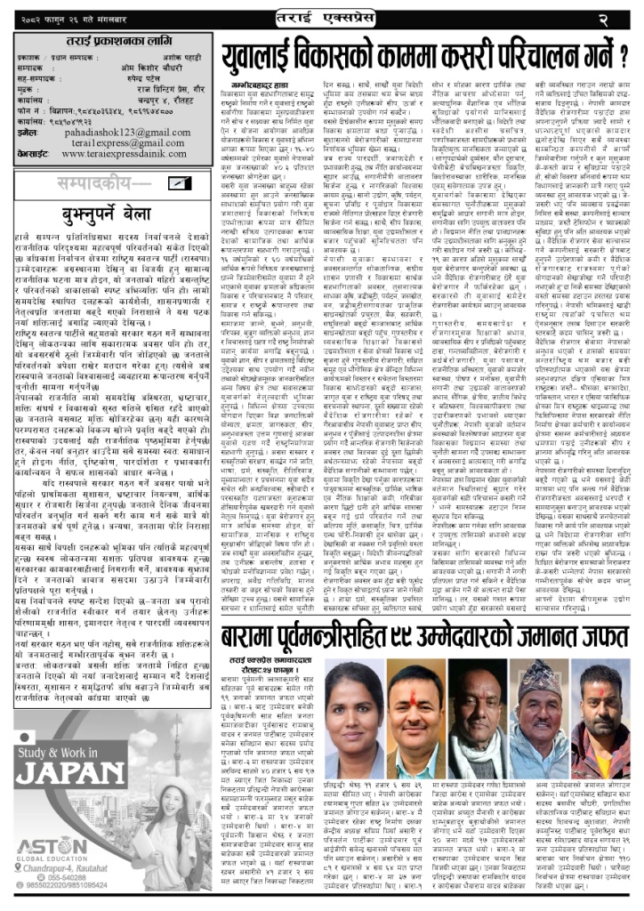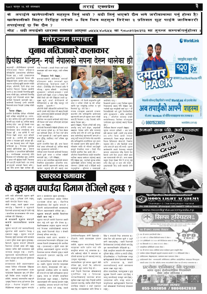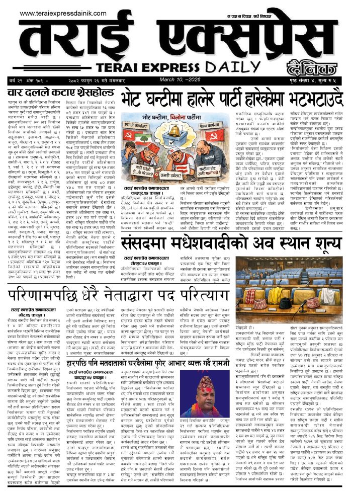 ई पेपर २०८२ फागुन २६ गतेको तराई एक्सप्रेस दैनिक तराई एक्सप्रेस दैनिक - March 10, 2026 RELATED ARTICLESMORE FROM AUTHOR २०७३ वैशाख ३ गतेको तराई एक्सप्रेस दैनिक २०८२ चैत ३० गतेको तराई एक्सप्रेस दैनिक २०८२ चैत २९ गतेको तराई एक्सप्रेस दैनिक ताजा अपडेट सिमारक्षकलाई नै सास्ती, सरकारको नीतिप्रति आलमको चिन्ता April 18, 2026 चन्द्रपुरबाट बोकाचोर पक्राउ April 18, 2026 चन्द्रपुर १० का परियार पोखराबाट पक्राउ April 17, 2026 २०७३ वैशाख ३ गतेको तराई एक्सप्रेस दैनिक April 16, 2026 शिवशक्ति सामुदायिक वनको सयौं रुख सफाया April 16, 2026 धेरैले पढेको सिमारक्षकलाई नै सास्ती, सरकारको नीतिप्रति आलमको चिन्ता April 18, 2026 चन्द्रपुरबाट बोकाचोर पक्राउ April 18, 2026 चन्द्रपुर १० का परियार पोखराबाट पक्राउ April 17, 2026 २०७३ वैशाख ३ गतेको तराई एक्सप्रेस दैनिक April 16, 2026 शिवशक्ति सामुदायिक वनको सयौं रुख सफाया April 16, 2026
