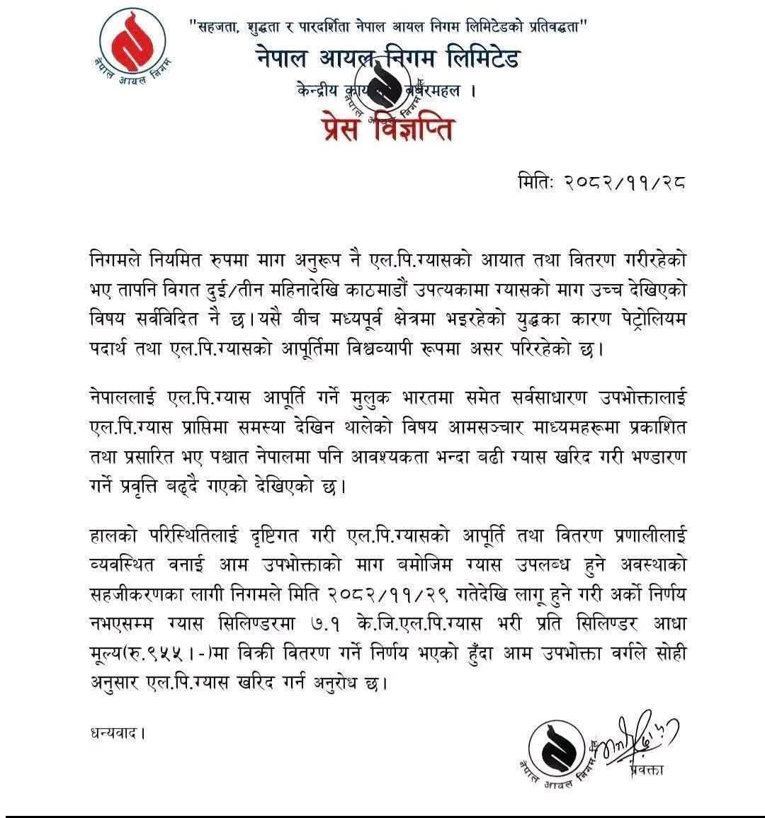 निगमले बिहीबार जारी गरेको प्रेस विज्ञप्तिमा पछिल्ला दुई–तीन महिनादेखि काठमाडौँ उपत्यकामा एलपी ग्यासको माग बढेको उल्लेख गर्दै मध्यपूर्व क्षेत्रमा भइरहेको युद्धका कारण पेट्रोलियम पदार्थ तथा एलपी ग्यासको आपूर्तिमा अन्तर्राष्ट्रिय रूपमा असर परेको जनाएको छ।