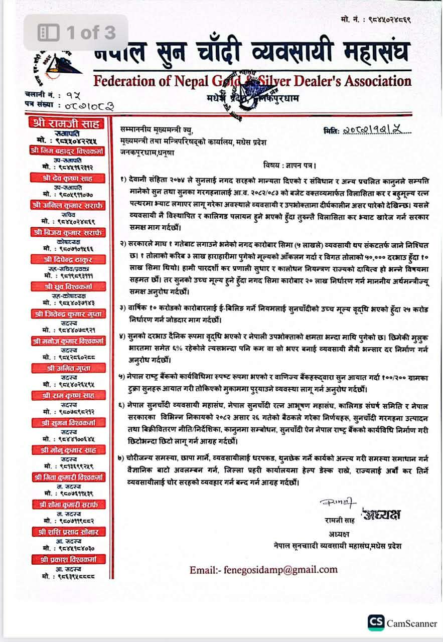 महासंघले मुख्यमन्त्री तथा मन्त्रिपरिषद् कार्यालय, मधेश प्रदेशलाई पठाएको ज्ञापनपत्रमार्फत हालको कर संरचना र नीतिगत असन्तुलनका कारण वैधानिक व्यवसाय नै संकटमा परेको दाबी गरेको हो। उनीहरूले अव्यवहारिक कर दरका कारण सुनचाँदी कारोबार कालोबजारतर्फ धकेलिँदै गएको गम्भीर आरोप लगाएका छन्।