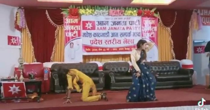 आँम जनता पार्टी मधेश काठमाण्डौ सम्पर्क मञ्च प्रदेश स्तरिय भेला लेखिएको व्यानर अगाडि दुई युवतीले उश्रृखल नृत्य गरेको भिडियोले यतीबेला सामाजिक संजाल तताएको छ । कयौले आँम जनता पार्टीका अध्यक्ष साहले आफ्नो अगाडि साहले यस्तो नृत्य गर्न लगाएको कमेण्ड गरेकाछन् ।