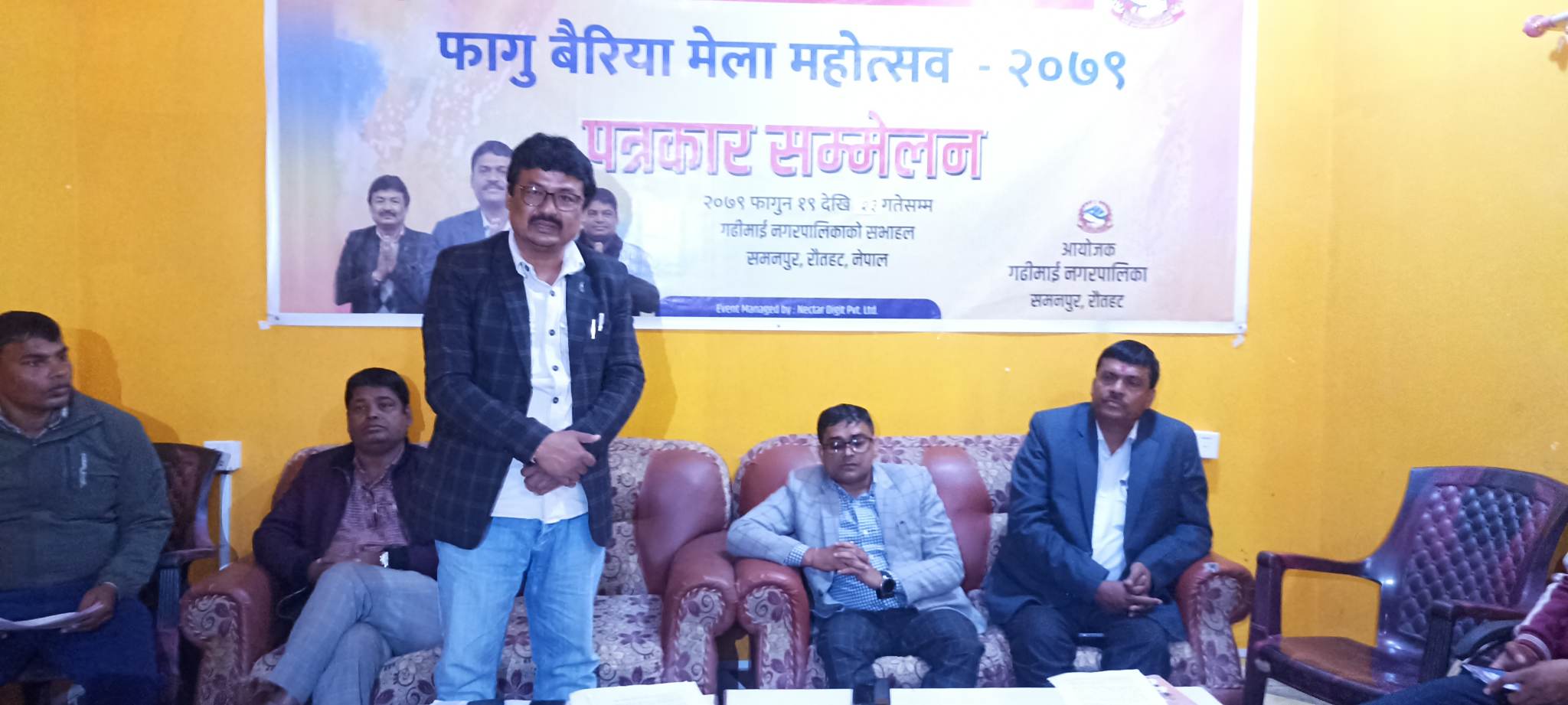 रौतहटको गढिमाइमा फागुन १९ गतेदेखि फागु बैरिया मेला महोत्सव २०७९ लाई भव्य बनाउने तयारी थालिएको छ । गढिमाइ नगरपालिकाले आइतवार समनपुर स्थित नगरपालिकाको सभाहलमा पत्रकार सम्मेलन गर्दै महोत्सव बारे जानकारी दिएको हो ।