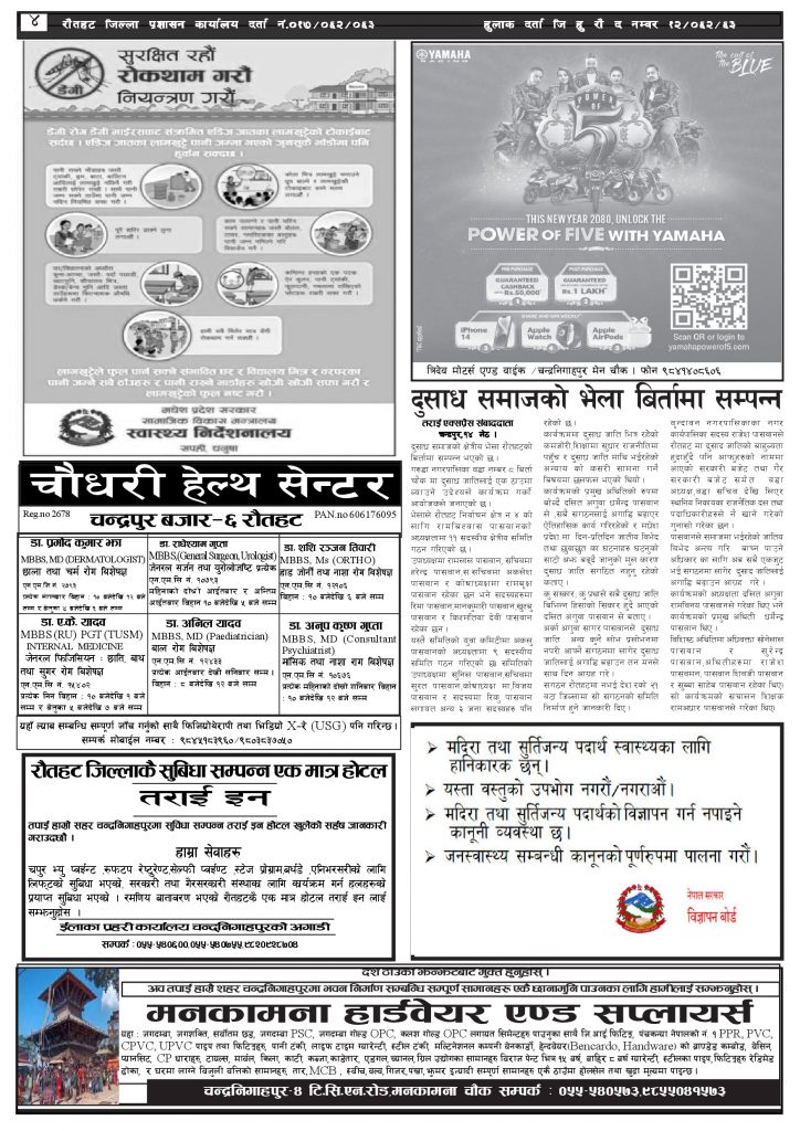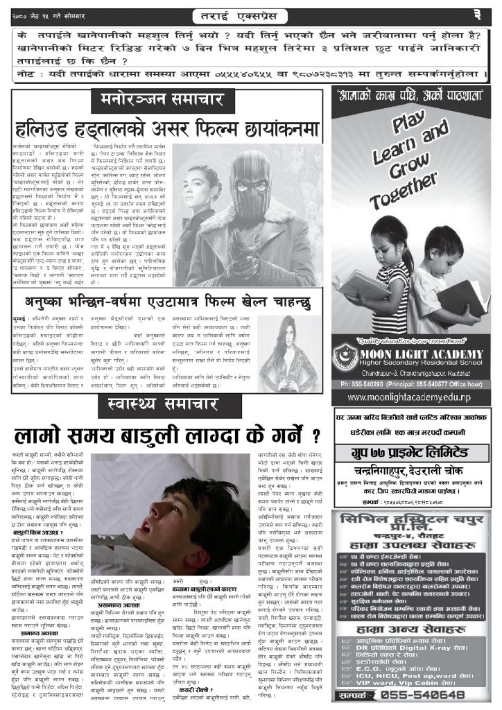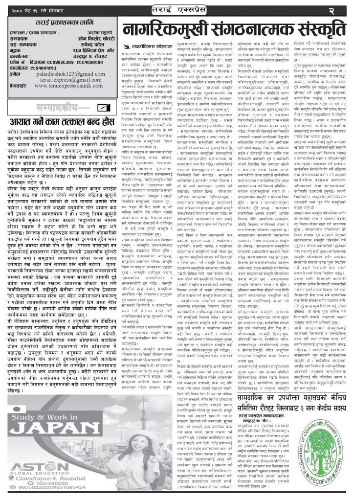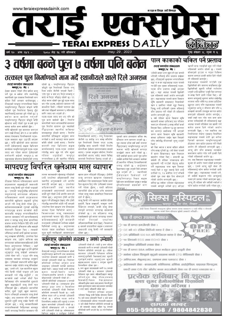 Uncategorized २०८० जेठ १५ गतेको तराई एक्सप्रेस दैनिक तराई एक्सप्रेस दैनिक संवाददाता - May 29, 2023 RELATED ARTICLESMORE FROM AUTHOR ‘सेफ गल्र्स’ परियोजनाअन्तर्गत सेवा प्रदायक लक्षित पाँच दिने तालिम सम्पन्न राजमार्ग कब्जा गर्नेको दिन गयो: सरकार ‘एक्सन मोड’मा चन्द्रपुर १० का परियार पोखराबाट पक्राउ ताजा अपडेट ४० करोड कागज मिलाएको आरोपले मौलापुर ततायो April 23, 2026 ‘सेफ गल्र्स’ परियोजनाअन्तर्गत सेवा प्रदायक लक्षित पाँच दिने तालिम सम्पन्न April 23, 2026 यातायात व्यवस्था कार्यालय गौरमा सेवाग्राहीलाई ठगी गरेको आरोपमा एक जना पक्राउ April 22, 2026 जिल्ला धाउने दिन सकिने दाबी, व्यवहारमा कति सम्भव ? April 22, 2026 २६ दिनमै ढल्यो गृहमन्त्रीको कुर्सी, सुधन गुरुङ ‘लगानी काण्ड’मा आउट! April 22, 2026 धेरैले पढेको ४० करोड कागज मिलाएको आरोपले मौलापुर ततायो April 23, 2026 ‘सेफ गल्र्स’ परियोजनाअन्तर्गत सेवा प्रदायक लक्षित पाँच दिने तालिम सम्पन्न April 23, 2026 यातायात व्यवस्था कार्यालय गौरमा सेवाग्राहीलाई ठगी गरेको आरोपमा एक जना पक्राउ April 22, 2026 जिल्ला धाउने दिन सकिने दाबी, व्यवहारमा कति सम्भव ? April 22, 2026 २६ दिनमै ढल्यो गृहमन्त्रीको कुर्सी, सुधन गुरुङ ‘लगानी काण्ड’मा आउट! April 22, 2026