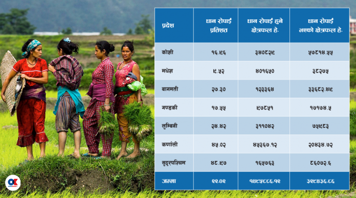 यो वर्ष सरकारले १४ लाख ९५ हजार ८८६ हेक्टर क्षेत्रफलमा धान रोपाइँ हुने अनुमान गरेको छ । तर, १७ असारसम्म देशभर कुल ३ लाख २९ हजार ४३६ हेक्टर क्षेत्रफलमा रोपाइँ सकिएको छ । जुन २२।०२ प्रतिशत मात्रै हो । गतवर्ष यस अवधिमा ४० प्रतिशत भन्दा धेरै क्षेत्रफलमा रोपाइ भइसकेको थियो ।