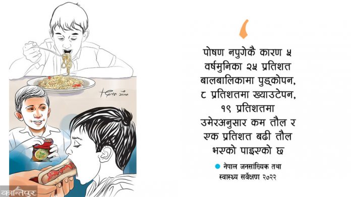पोषण नपुगेकै कारण ५ वर्षमुनिका २५ प्रतिशत बालबालिकामा पुड्कोपन, ८ प्रतिशतमा ख्याउटेपन, १९ प्रतिशतमा उमेरअनुसार कम तौल र एक प्रतिशत बढी तौल भएको पाइएको छ ।(नेपाल जनसांख्यिक तथा स्वास्थ्य सर्वेक्षण, २०२२