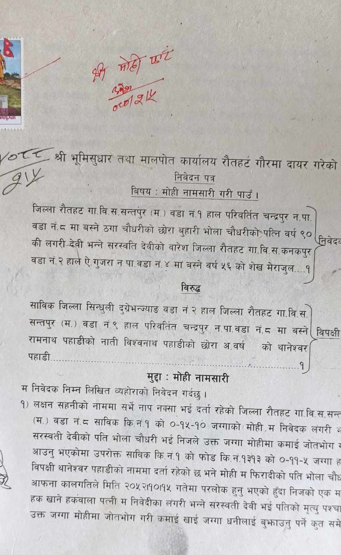 चन्द्रपुर ८ घर भएकी ९० बर्षकी लगरीदेवी भन्ने सरस्वती देवीको वारेसमा गुजरा ४ का शेख मेराजुल सहितको भु माफिया गिरोहले १० जना सर्वसाधारणको जमिनमा मोही हक दावी गर्दै मुद्धा दर्ता गराएका हुन ।