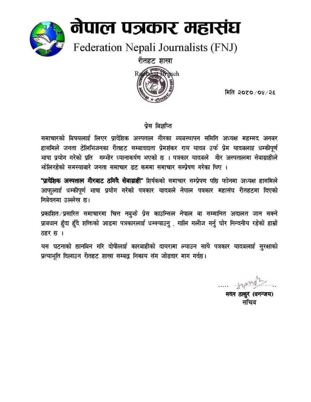 नेपाल पत्रकार महासघ रौतहटका सचिव धनन्जय ठाकुर उर्फ मदनले समाचारको बिषयमा चित्त नबुझे नियमनकारी निकाय प्रेस काउन्सिल ,सम्मानित अदालतमा जानुको साटो पत्रकार लाई फोनमा धम्की दिने कार्य निन्दनीय भएको र पत्रकारको सुरक्षाको ग्यारेन्टी गर्न समेत सुरक्षा निकायसंग आग्रह गरेकाछन ।