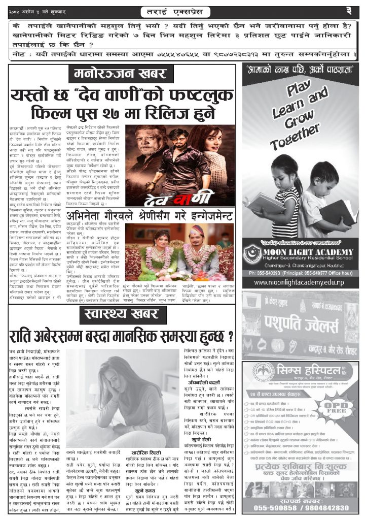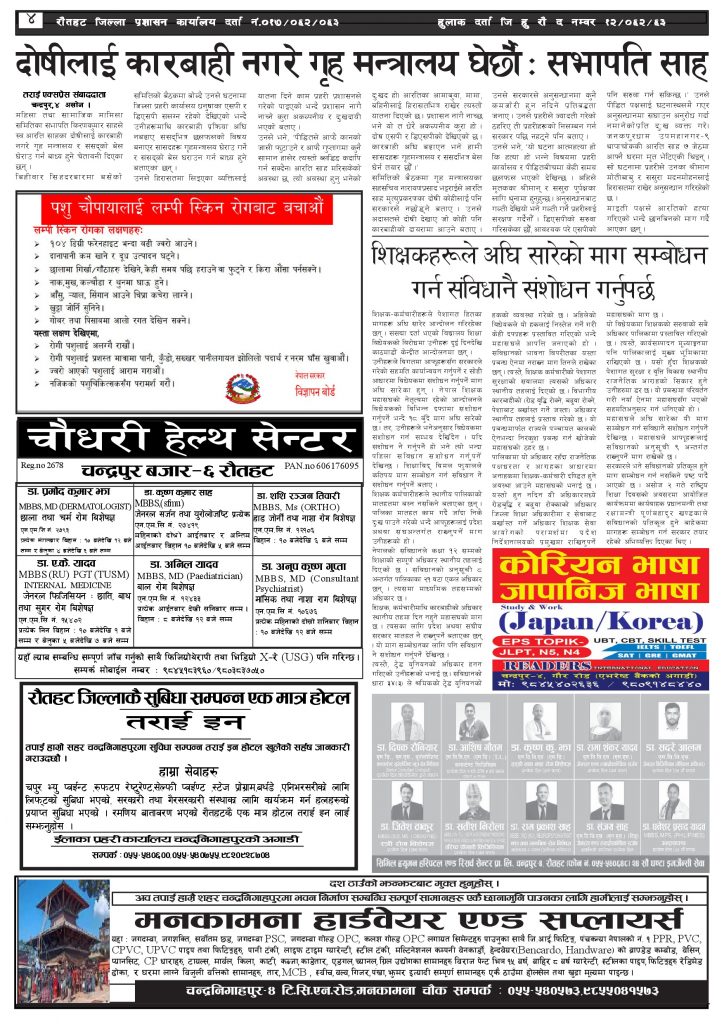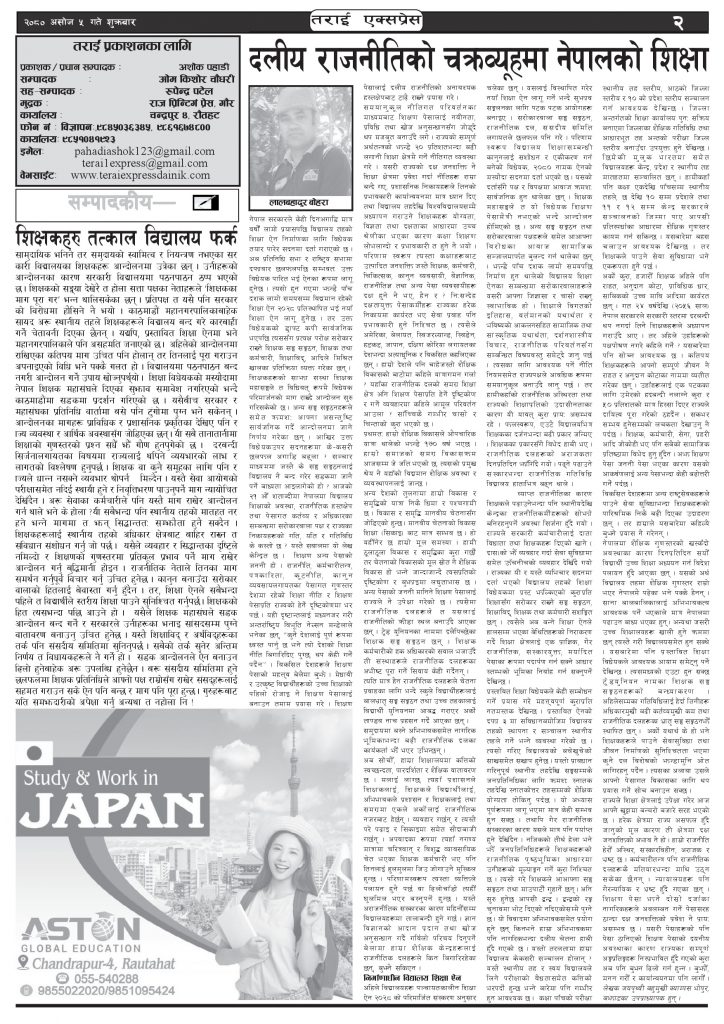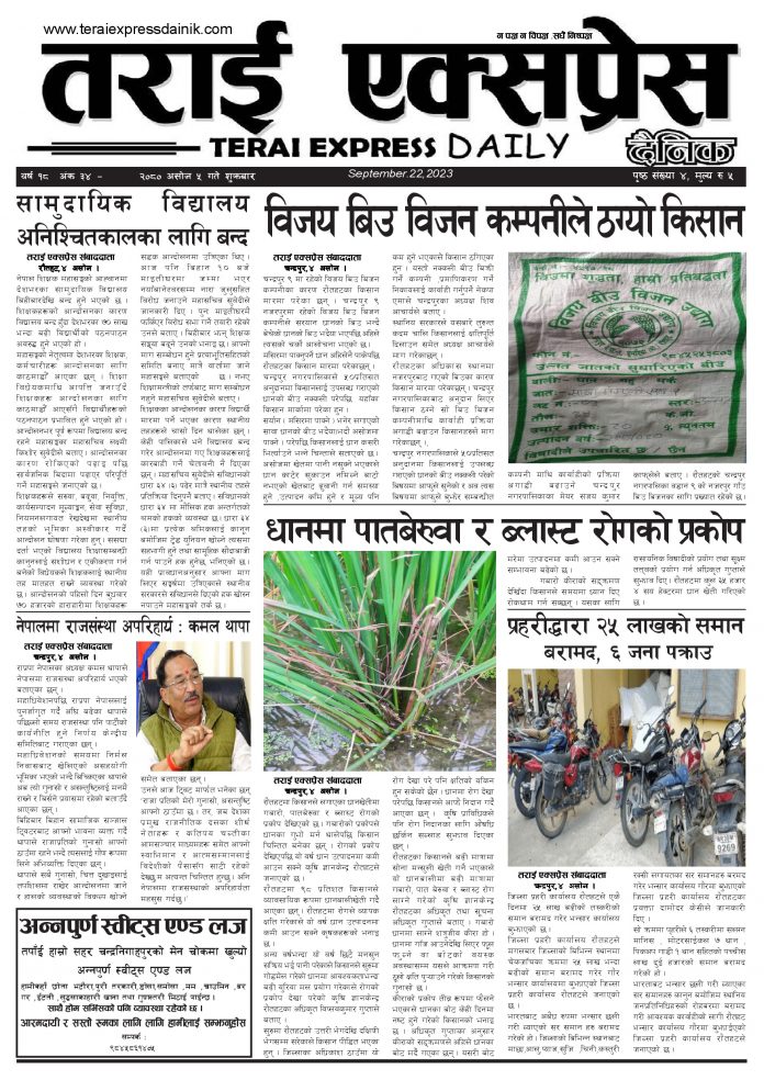 ई पेपरप्रदेशमधेश प्रदेशमुख्य समाचार २०८० असोज ५ गतेको तराई एक्सप्रेस दैनिक तराई एक्सप्रेस दैनिक संवाददाता - September 22, 2023 RELATED ARTICLESMORE FROM AUTHOR चट्याङको कहर : एकै झट्कामा गोठ खरानी, १४ पशुको दर्दनाक अन्त २०८३ वैशाख १३ गतेको तराई एक्सप्रेस दैनिक ४० करोड कागज मिलाएको आरोपले मौलापुर ततायो ताजा अपडेट चट्याङको कहर : एकै झट्कामा गोठ खरानी, १४ पशुको दर्दनाक अन्त April 26, 2026 २०८३ वैशाख १३ गतेको तराई एक्सप्रेस दैनिक April 26, 2026 ४० करोड कागज मिलाएको आरोपले मौलापुर ततायो April 23, 2026 ‘सेफ गल्र्स’ परियोजनाअन्तर्गत सेवा प्रदायक लक्षित पाँच दिने तालिम सम्पन्न April 23, 2026 यातायात व्यवस्था कार्यालय गौरमा सेवाग्राहीलाई ठगी गरेको आरोपमा एक जना पक्राउ April 22, 2026 धेरैले पढेको चट्याङको कहर : एकै झट्कामा गोठ खरानी, १४ पशुको दर्दनाक अन्त April 26, 2026 २०८३ वैशाख १३ गतेको तराई एक्सप्रेस दैनिक April 26, 2026 ४० करोड कागज मिलाएको आरोपले मौलापुर ततायो April 23, 2026 ‘सेफ गल्र्स’ परियोजनाअन्तर्गत सेवा प्रदायक लक्षित पाँच दिने तालिम सम्पन्न April 23, 2026 यातायात व्यवस्था कार्यालय गौरमा सेवाग्राहीलाई ठगी गरेको आरोपमा एक जना पक्राउ April 22, 2026