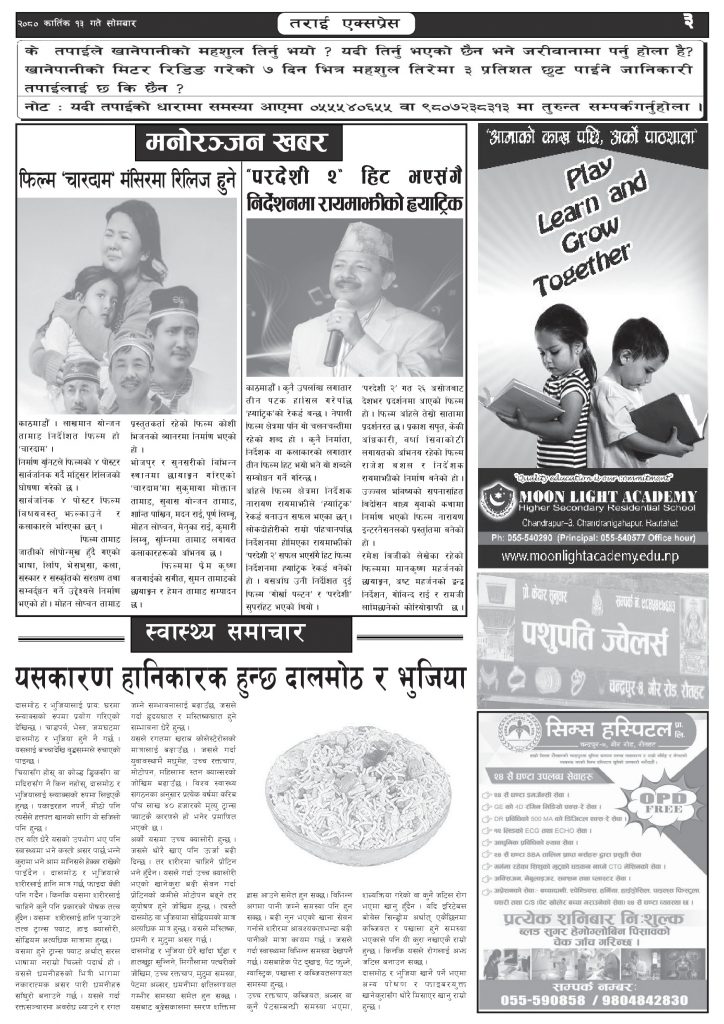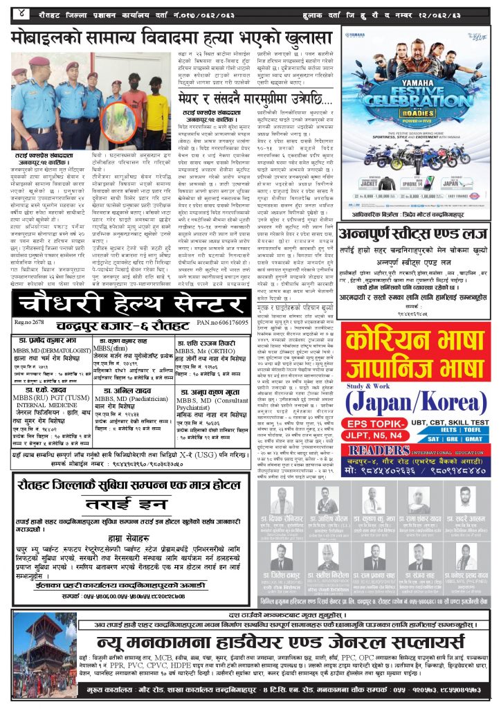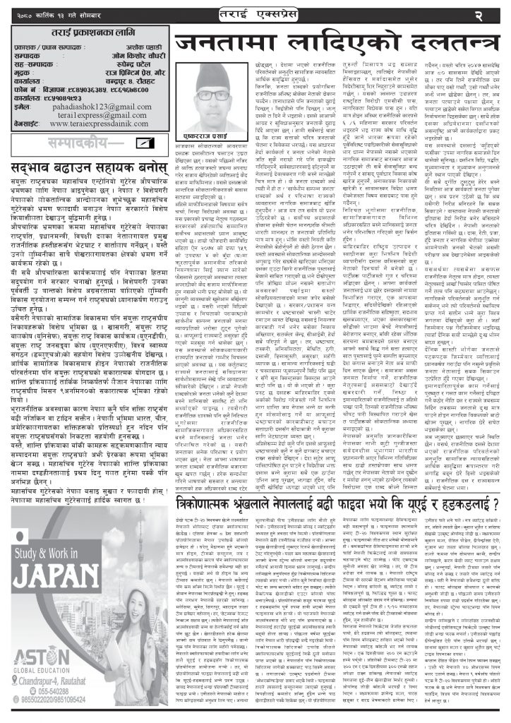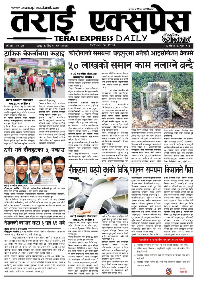 ई पेपरप्रदेशमधेश प्रदेशमुख्य समाचार २०८० कार्तिक १३ गतेको तराई एक्सप्रेस दैनिक तराई एक्सप्रेस दैनिक संवाददाता - October 30, 2023 RELATED ARTICLESMORE FROM AUTHOR ४० करोड कागज मिलाएको आरोपले मौलापुर ततायो यातायात व्यवस्था कार्यालय गौरमा सेवाग्राहीलाई ठगी गरेको आरोपमा एक जना पक्राउ २६ दिनमै ढल्यो गृहमन्त्रीको कुर्सी, सुधन गुरुङ ‘लगानी काण्ड’मा आउट! ताजा अपडेट ४० करोड कागज मिलाएको आरोपले मौलापुर ततायो April 23, 2026 ‘सेफ गल्र्स’ परियोजनाअन्तर्गत सेवा प्रदायक लक्षित पाँच दिने तालिम सम्पन्न April 23, 2026 यातायात व्यवस्था कार्यालय गौरमा सेवाग्राहीलाई ठगी गरेको आरोपमा एक जना पक्राउ April 22, 2026 जिल्ला धाउने दिन सकिने दाबी, व्यवहारमा कति सम्भव ? April 22, 2026 २६ दिनमै ढल्यो गृहमन्त्रीको कुर्सी, सुधन गुरुङ ‘लगानी काण्ड’मा आउट! April 22, 2026 धेरैले पढेको ४० करोड कागज मिलाएको आरोपले मौलापुर ततायो April 23, 2026 ‘सेफ गल्र्स’ परियोजनाअन्तर्गत सेवा प्रदायक लक्षित पाँच दिने तालिम सम्पन्न April 23, 2026 यातायात व्यवस्था कार्यालय गौरमा सेवाग्राहीलाई ठगी गरेको आरोपमा एक जना पक्राउ April 22, 2026 जिल्ला धाउने दिन सकिने दाबी, व्यवहारमा कति सम्भव ? April 22, 2026 २६ दिनमै ढल्यो गृहमन्त्रीको कुर्सी, सुधन गुरुङ ‘लगानी काण्ड’मा आउट! April 22, 2026