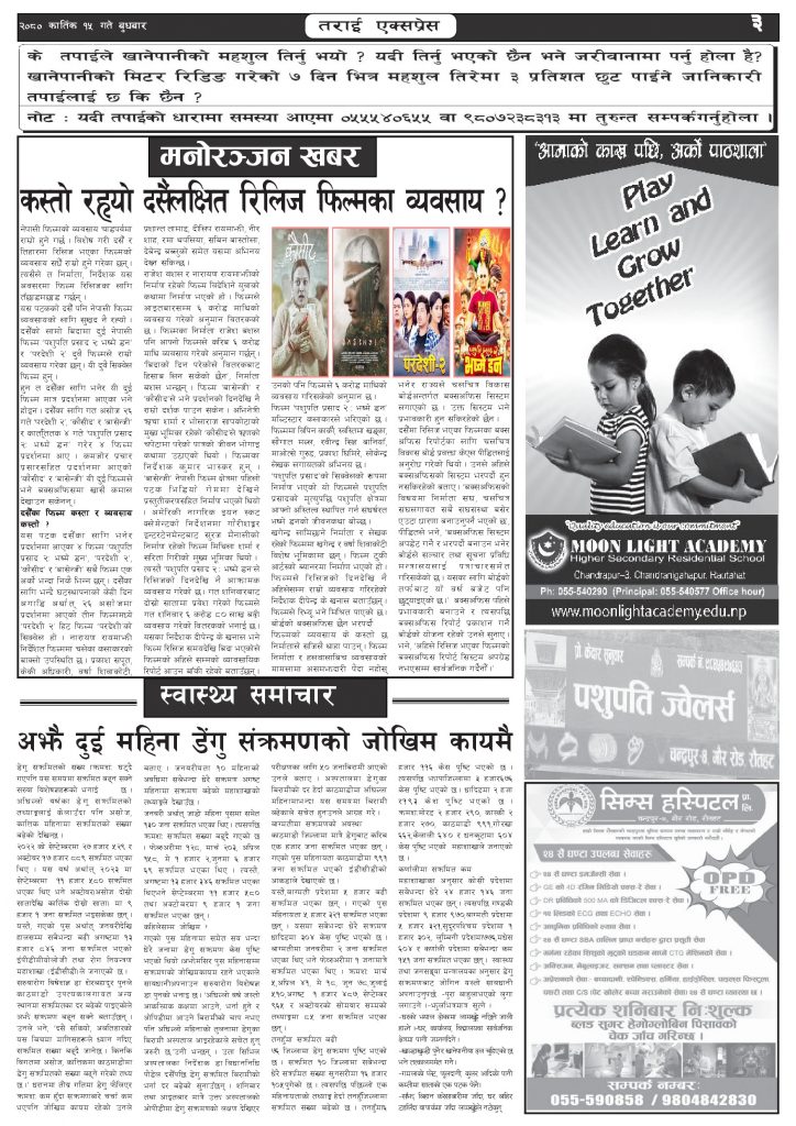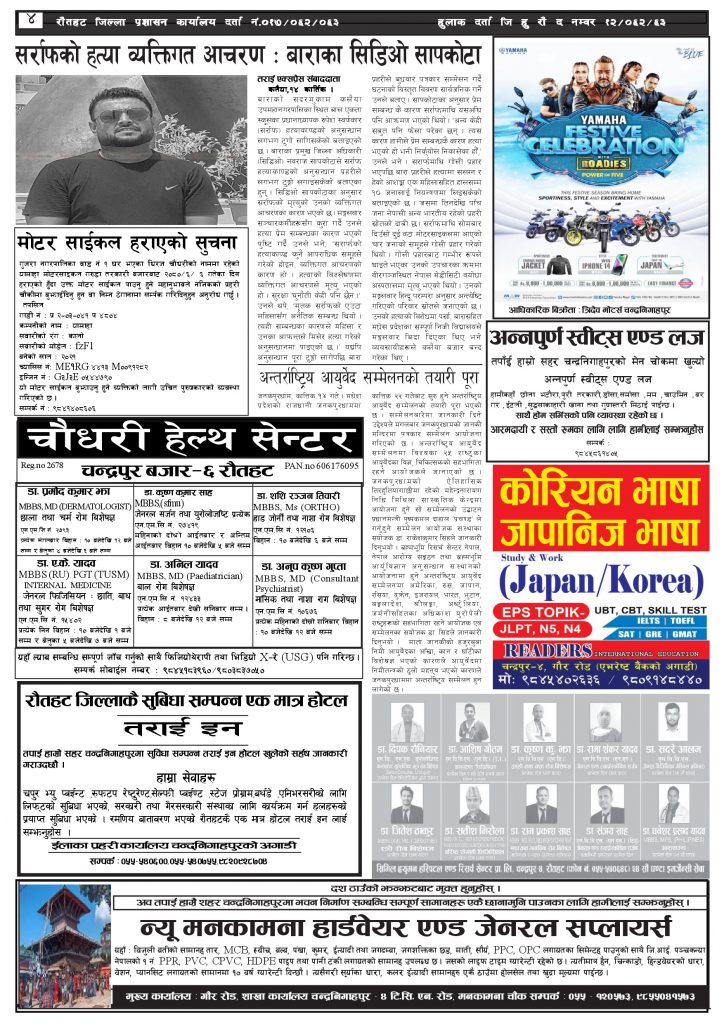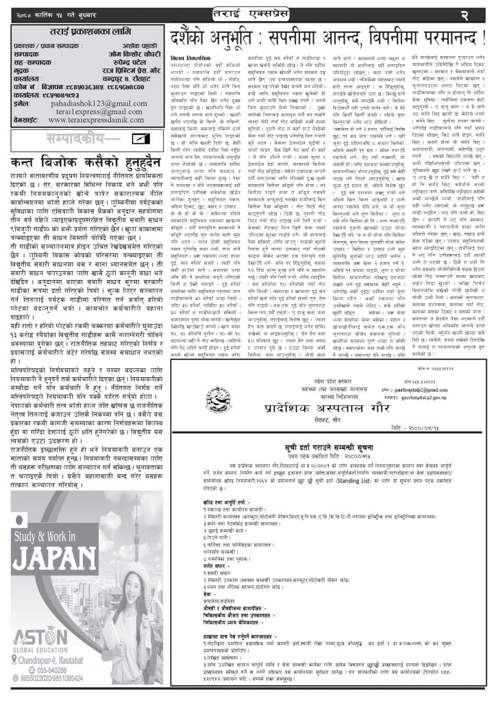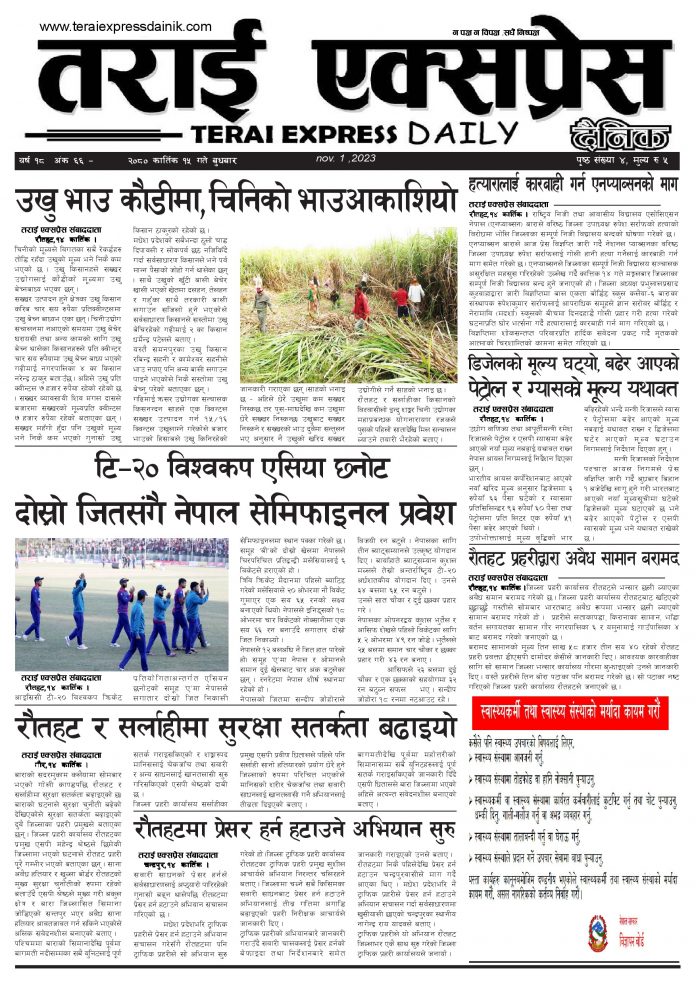ई पेपरप्रदेशमधेश प्रदेशमुख्य समाचार २०८० कार्तिक १५ गतेको तराई एक्सप्रेस दैनिक तराई एक्सप्रेस दैनिक संवाददाता - November 1, 2023 RELATED ARTICLESMORE FROM AUTHOR ४० करोड कागज मिलाएको आरोपले मौलापुर ततायो यातायात व्यवस्था कार्यालय गौरमा सेवाग्राहीलाई ठगी गरेको आरोपमा एक जना पक्राउ २६ दिनमै ढल्यो गृहमन्त्रीको कुर्सी, सुधन गुरुङ ‘लगानी काण्ड’मा आउट! ताजा अपडेट ४० करोड कागज मिलाएको आरोपले मौलापुर ततायो April 23, 2026 ‘सेफ गल्र्स’ परियोजनाअन्तर्गत सेवा प्रदायक लक्षित पाँच दिने तालिम सम्पन्न April 23, 2026 यातायात व्यवस्था कार्यालय गौरमा सेवाग्राहीलाई ठगी गरेको आरोपमा एक जना पक्राउ April 22, 2026 जिल्ला धाउने दिन सकिने दाबी, व्यवहारमा कति सम्भव ? April 22, 2026 २६ दिनमै ढल्यो गृहमन्त्रीको कुर्सी, सुधन गुरुङ ‘लगानी काण्ड’मा आउट! April 22, 2026 धेरैले पढेको ४० करोड कागज मिलाएको आरोपले मौलापुर ततायो April 23, 2026 ‘सेफ गल्र्स’ परियोजनाअन्तर्गत सेवा प्रदायक लक्षित पाँच दिने तालिम सम्पन्न April 23, 2026 यातायात व्यवस्था कार्यालय गौरमा सेवाग्राहीलाई ठगी गरेको आरोपमा एक जना पक्राउ April 22, 2026 जिल्ला धाउने दिन सकिने दाबी, व्यवहारमा कति सम्भव ? April 22, 2026 २६ दिनमै ढल्यो गृहमन्त्रीको कुर्सी, सुधन गुरुङ ‘लगानी काण्ड’मा आउट! April 22, 2026