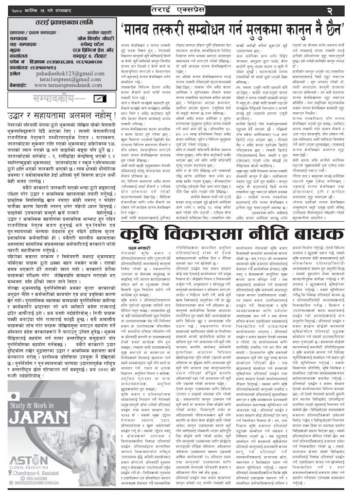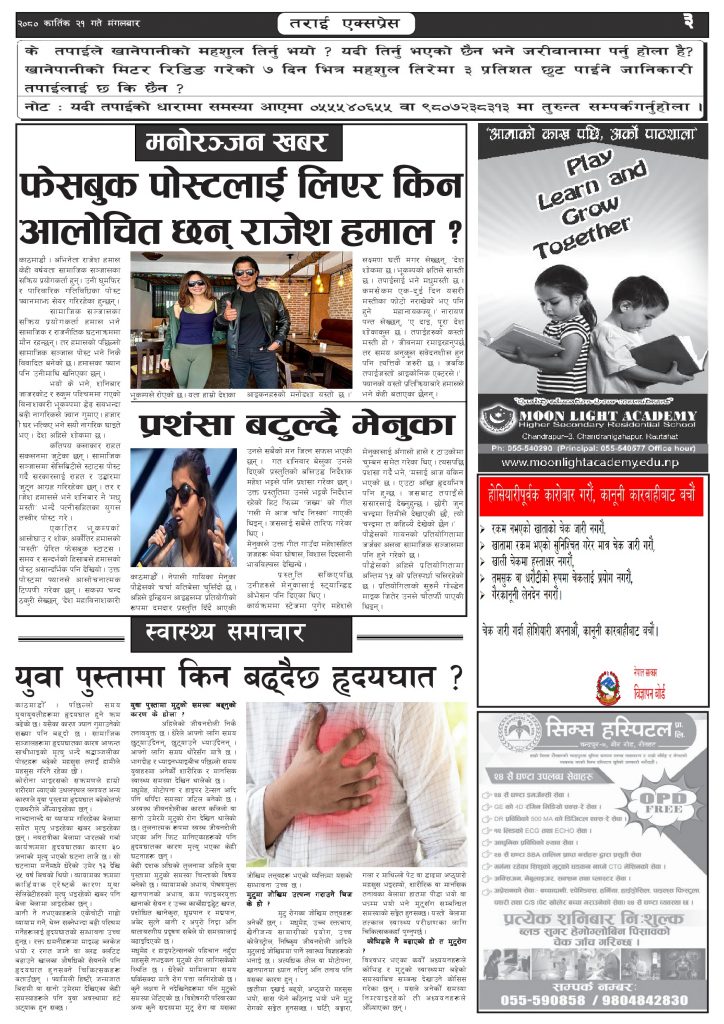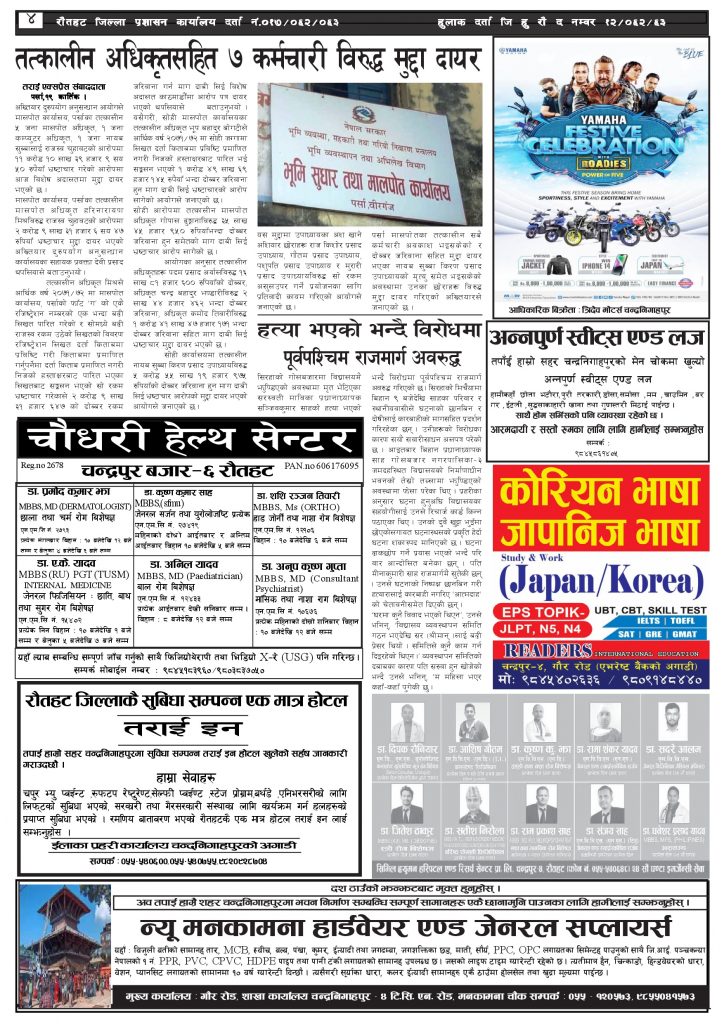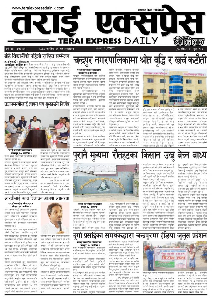 ई पेपरप्रदेशमधेश प्रदेशमुख्य समाचार २०८० कार्तिक २१ गतेको तराई एक्सप्रेस दैनिक तराई एक्सप्रेस दैनिक संवाददाता - November 7, 2023 RELATED ARTICLESMORE FROM AUTHOR ४० करोड कागज मिलाएको आरोपले मौलापुर ततायो यातायात व्यवस्था कार्यालय गौरमा सेवाग्राहीलाई ठगी गरेको आरोपमा एक जना पक्राउ २६ दिनमै ढल्यो गृहमन्त्रीको कुर्सी, सुधन गुरुङ ‘लगानी काण्ड’मा आउट! ताजा अपडेट ४० करोड कागज मिलाएको आरोपले मौलापुर ततायो April 23, 2026 ‘सेफ गल्र्स’ परियोजनाअन्तर्गत सेवा प्रदायक लक्षित पाँच दिने तालिम सम्पन्न April 23, 2026 यातायात व्यवस्था कार्यालय गौरमा सेवाग्राहीलाई ठगी गरेको आरोपमा एक जना पक्राउ April 22, 2026 जिल्ला धाउने दिन सकिने दाबी, व्यवहारमा कति सम्भव ? April 22, 2026 २६ दिनमै ढल्यो गृहमन्त्रीको कुर्सी, सुधन गुरुङ ‘लगानी काण्ड’मा आउट! April 22, 2026 धेरैले पढेको ४० करोड कागज मिलाएको आरोपले मौलापुर ततायो April 23, 2026 ‘सेफ गल्र्स’ परियोजनाअन्तर्गत सेवा प्रदायक लक्षित पाँच दिने तालिम सम्पन्न April 23, 2026 यातायात व्यवस्था कार्यालय गौरमा सेवाग्राहीलाई ठगी गरेको आरोपमा एक जना पक्राउ April 22, 2026 जिल्ला धाउने दिन सकिने दाबी, व्यवहारमा कति सम्भव ? April 22, 2026 २६ दिनमै ढल्यो गृहमन्त्रीको कुर्सी, सुधन गुरुङ ‘लगानी काण्ड’मा आउट! April 22, 2026