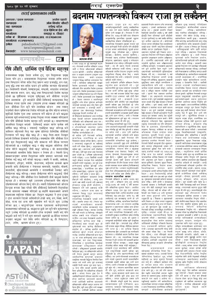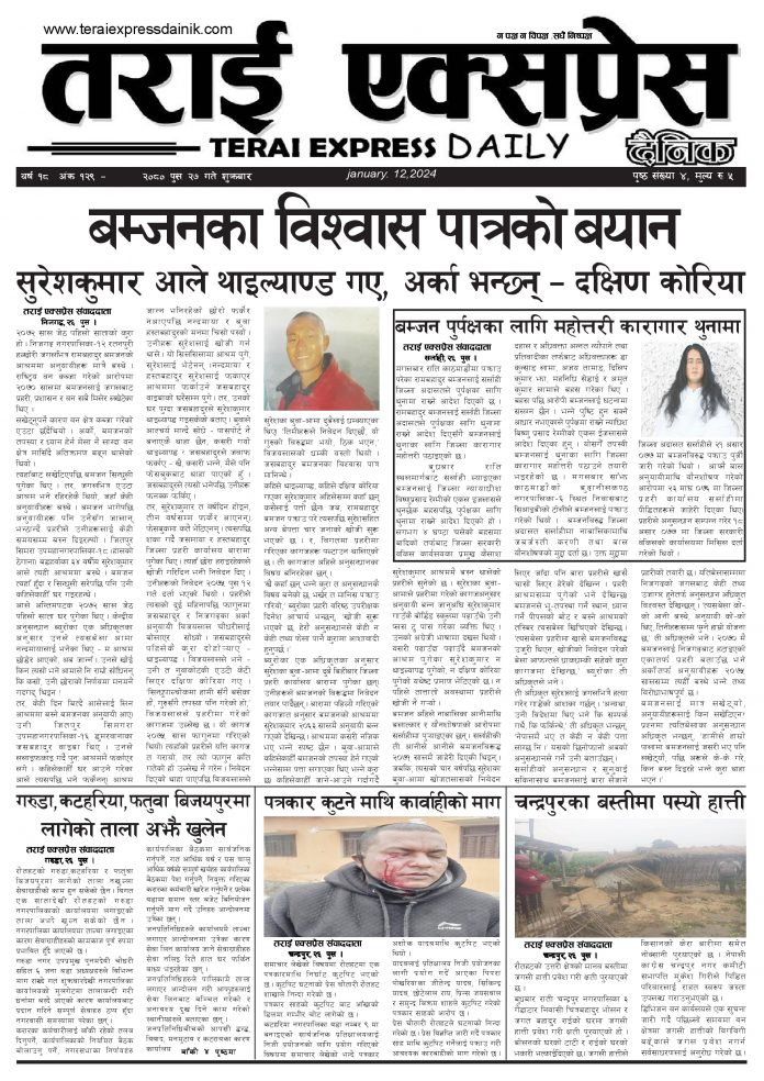 ई पेपरप्रदेशमधेश प्रदेश २०८० पुस २७ गतेको तराई एक्सप्रेस दैनिक तराई एक्सप्रेस दैनिक संवाददाता - January 12, 2024 RELATED ARTICLESMORE FROM AUTHOR ४० करोड कागज मिलाएको आरोपले मौलापुर ततायो यातायात व्यवस्था कार्यालय गौरमा सेवाग्राहीलाई ठगी गरेको आरोपमा एक जना पक्राउ २०७३ वैशाख ९ गतेको तराई एक्सप्रेस दैनिक ताजा अपडेट ४० करोड कागज मिलाएको आरोपले मौलापुर ततायो April 23, 2026 ‘सेफ गल्र्स’ परियोजनाअन्तर्गत सेवा प्रदायक लक्षित पाँच दिने तालिम सम्पन्न April 23, 2026 यातायात व्यवस्था कार्यालय गौरमा सेवाग्राहीलाई ठगी गरेको आरोपमा एक जना पक्राउ April 22, 2026 जिल्ला धाउने दिन सकिने दाबी, व्यवहारमा कति सम्भव ? April 22, 2026 २६ दिनमै ढल्यो गृहमन्त्रीको कुर्सी, सुधन गुरुङ ‘लगानी काण्ड’मा आउट! April 22, 2026 धेरैले पढेको ४० करोड कागज मिलाएको आरोपले मौलापुर ततायो April 23, 2026 ‘सेफ गल्र्स’ परियोजनाअन्तर्गत सेवा प्रदायक लक्षित पाँच दिने तालिम सम्पन्न April 23, 2026 यातायात व्यवस्था कार्यालय गौरमा सेवाग्राहीलाई ठगी गरेको आरोपमा एक जना पक्राउ April 22, 2026 जिल्ला धाउने दिन सकिने दाबी, व्यवहारमा कति सम्भव ? April 22, 2026 २६ दिनमै ढल्यो गृहमन्त्रीको कुर्सी, सुधन गुरुङ ‘लगानी काण्ड’मा आउट! April 22, 2026