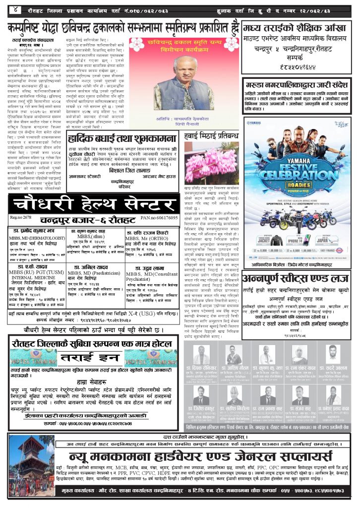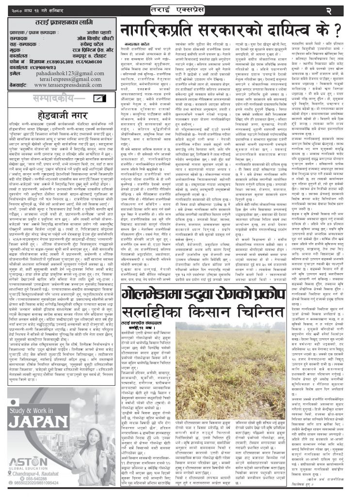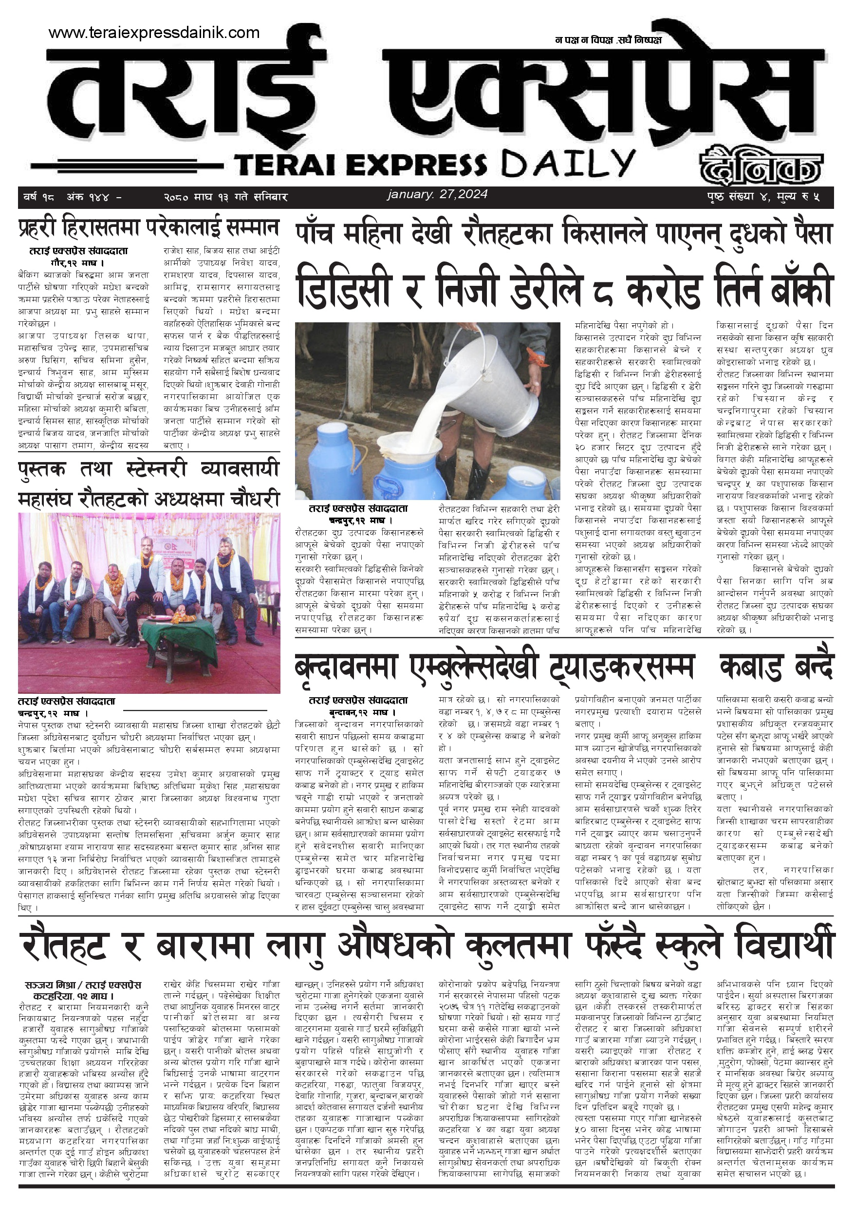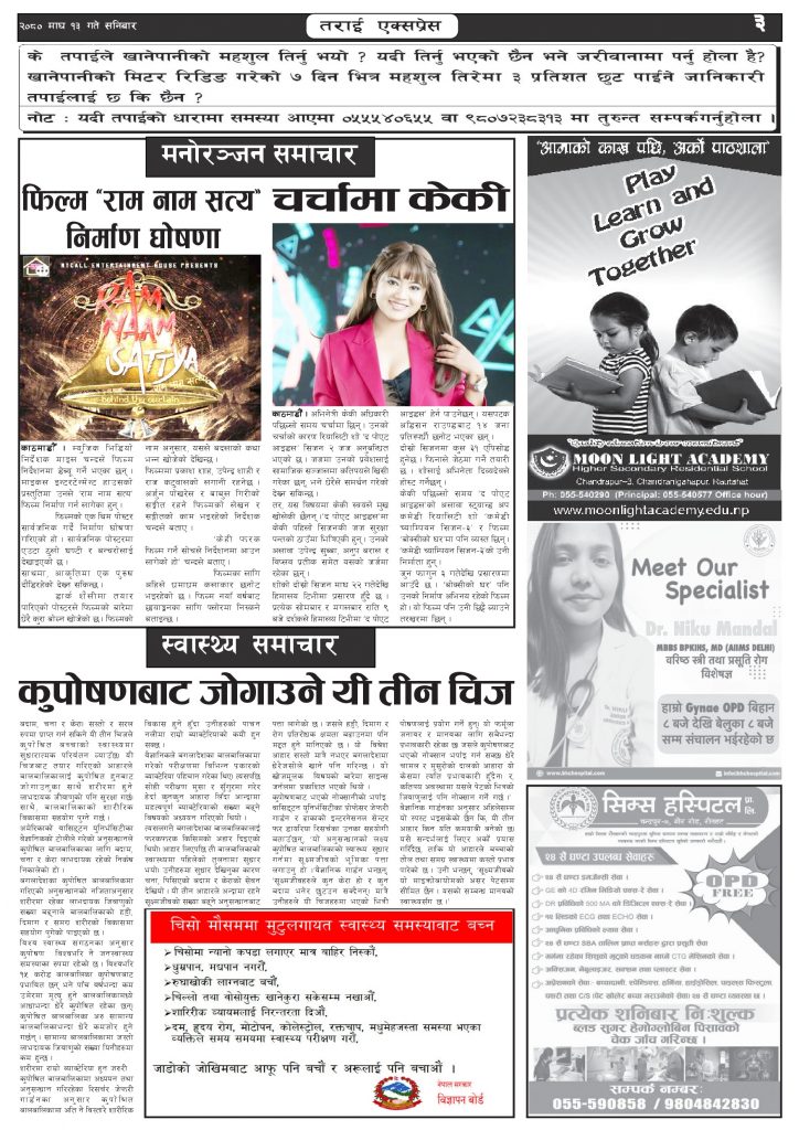 ई पेपरप्रदेशमधेश प्रदेशमुख्य समाचार २०८० माघ १३ गतेको तराई एक्सप्रेस दैनिक तराई एक्सप्रेस दैनिक संवाददाता - January 27, 2024 RELATED ARTICLESMORE FROM AUTHOR ४० करोड कागज मिलाएको आरोपले मौलापुर ततायो यातायात व्यवस्था कार्यालय गौरमा सेवाग्राहीलाई ठगी गरेको आरोपमा एक जना पक्राउ २६ दिनमै ढल्यो गृहमन्त्रीको कुर्सी, सुधन गुरुङ ‘लगानी काण्ड’मा आउट! ताजा अपडेट ४० करोड कागज मिलाएको आरोपले मौलापुर ततायो April 23, 2026 ‘सेफ गल्र्स’ परियोजनाअन्तर्गत सेवा प्रदायक लक्षित पाँच दिने तालिम सम्पन्न April 23, 2026 यातायात व्यवस्था कार्यालय गौरमा सेवाग्राहीलाई ठगी गरेको आरोपमा एक जना पक्राउ April 22, 2026 जिल्ला धाउने दिन सकिने दाबी, व्यवहारमा कति सम्भव ? April 22, 2026 २६ दिनमै ढल्यो गृहमन्त्रीको कुर्सी, सुधन गुरुङ ‘लगानी काण्ड’मा आउट! April 22, 2026 धेरैले पढेको ४० करोड कागज मिलाएको आरोपले मौलापुर ततायो April 23, 2026 ‘सेफ गल्र्स’ परियोजनाअन्तर्गत सेवा प्रदायक लक्षित पाँच दिने तालिम सम्पन्न April 23, 2026 यातायात व्यवस्था कार्यालय गौरमा सेवाग्राहीलाई ठगी गरेको आरोपमा एक जना पक्राउ April 22, 2026 जिल्ला धाउने दिन सकिने दाबी, व्यवहारमा कति सम्भव ? April 22, 2026 २६ दिनमै ढल्यो गृहमन्त्रीको कुर्सी, सुधन गुरुङ ‘लगानी काण्ड’मा आउट! April 22, 2026