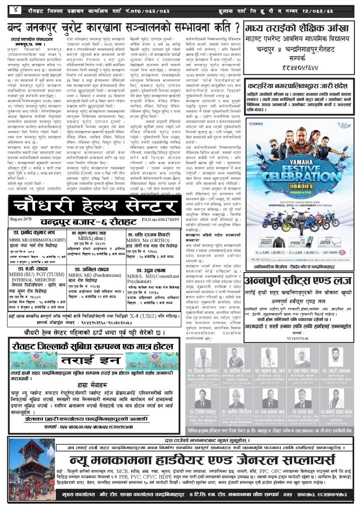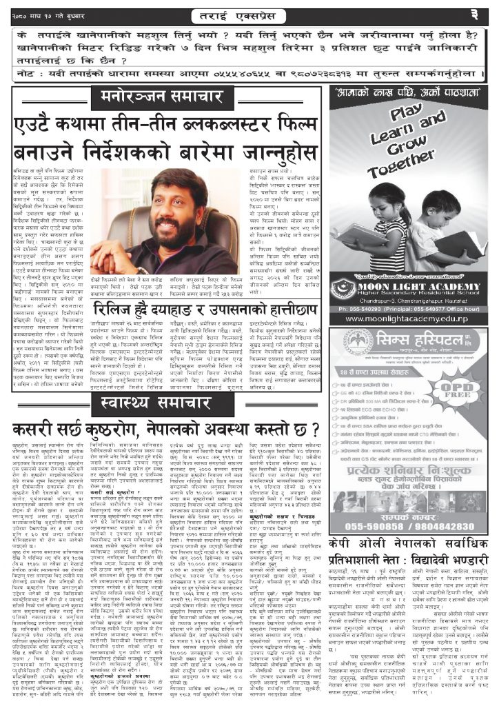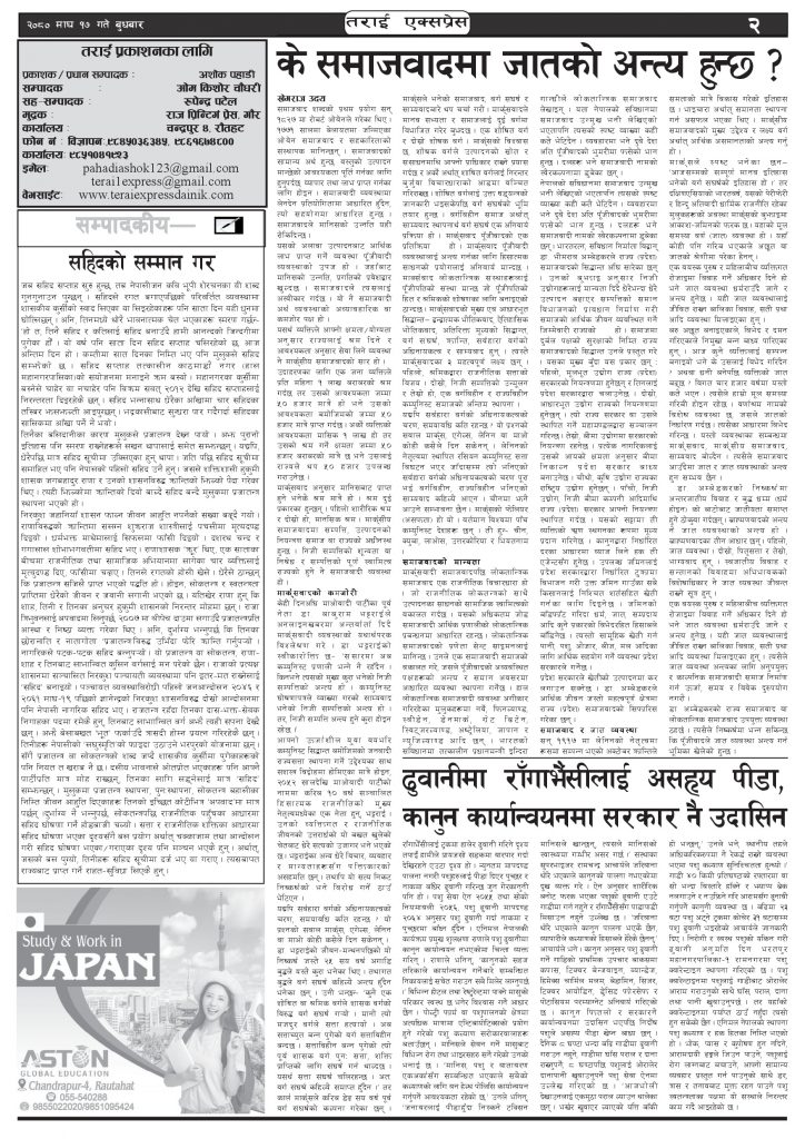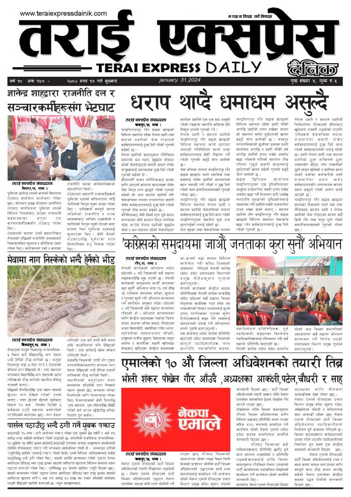ई पेपरप्रदेशमधेश प्रदेशमुख्य समाचार २०८० माघ १७ गतेको तराई एक्सप्रेस दैनिक तराई एक्सप्रेस दैनिक संवाददाता - January 31, 2024 RELATED ARTICLESMORE FROM AUTHOR ४० करोड कागज मिलाएको आरोपले मौलापुर ततायो यातायात व्यवस्था कार्यालय गौरमा सेवाग्राहीलाई ठगी गरेको आरोपमा एक जना पक्राउ २६ दिनमै ढल्यो गृहमन्त्रीको कुर्सी, सुधन गुरुङ ‘लगानी काण्ड’मा आउट! ताजा अपडेट ४० करोड कागज मिलाएको आरोपले मौलापुर ततायो April 23, 2026 ‘सेफ गल्र्स’ परियोजनाअन्तर्गत सेवा प्रदायक लक्षित पाँच दिने तालिम सम्पन्न April 23, 2026 यातायात व्यवस्था कार्यालय गौरमा सेवाग्राहीलाई ठगी गरेको आरोपमा एक जना पक्राउ April 22, 2026 जिल्ला धाउने दिन सकिने दाबी, व्यवहारमा कति सम्भव ? April 22, 2026 २६ दिनमै ढल्यो गृहमन्त्रीको कुर्सी, सुधन गुरुङ ‘लगानी काण्ड’मा आउट! April 22, 2026 धेरैले पढेको ४० करोड कागज मिलाएको आरोपले मौलापुर ततायो April 23, 2026 ‘सेफ गल्र्स’ परियोजनाअन्तर्गत सेवा प्रदायक लक्षित पाँच दिने तालिम सम्पन्न April 23, 2026 यातायात व्यवस्था कार्यालय गौरमा सेवाग्राहीलाई ठगी गरेको आरोपमा एक जना पक्राउ April 22, 2026 जिल्ला धाउने दिन सकिने दाबी, व्यवहारमा कति सम्भव ? April 22, 2026 २६ दिनमै ढल्यो गृहमन्त्रीको कुर्सी, सुधन गुरुङ ‘लगानी काण्ड’मा आउट! April 22, 2026