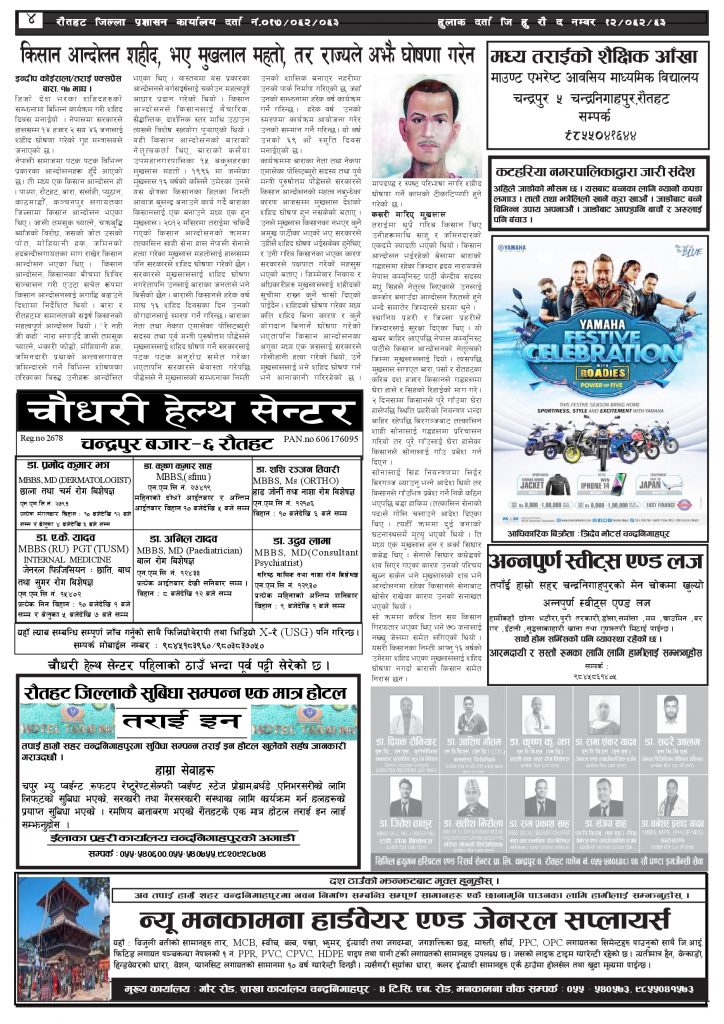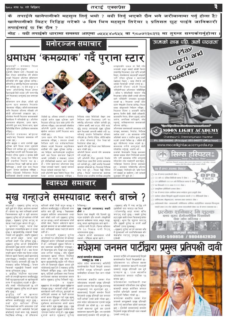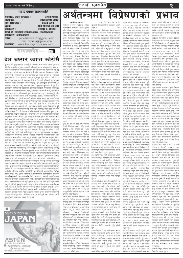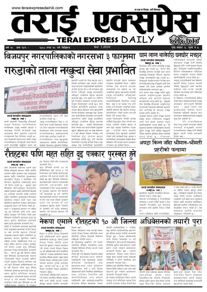 ई पेपरप्रदेशमधेश प्रदेशमुख्य समाचार २०८० माघ १८ गतेको तराई एक्सप्रेस दैनिक तराई एक्सप्रेस दैनिक संवाददाता - February 1, 2024 RELATED ARTICLESMORE FROM AUTHOR २६ दिनमै ढल्यो गृहमन्त्रीको कुर्सी, सुधन गुरुङ ‘लगानी काण्ड’मा आउट! २०७३ वैशाख ९ गतेको तराई एक्सप्रेस दैनिक राजमार्ग कब्जा गर्नेको दिन गयो: सरकार ‘एक्सन मोड’मा ताजा अपडेट जिल्ला धाउने दिन सकिने दाबी, व्यवहारमा कति सम्भव ? April 22, 2026 २६ दिनमै ढल्यो गृहमन्त्रीको कुर्सी, सुधन गुरुङ ‘लगानी काण्ड’मा आउट! April 22, 2026 २०७३ वैशाख ९ गतेको तराई एक्सप्रेस दैनिक April 22, 2026 राजमार्ग कब्जा गर्नेको दिन गयो: सरकार ‘एक्सन मोड’मा April 21, 2026 काजको आडमा असुली धन्धा : प्रहरीभित्रै ‘नेटवर्क’ चल्दै April 21, 2026 धेरैले पढेको जिल्ला धाउने दिन सकिने दाबी, व्यवहारमा कति सम्भव ? April 22, 2026 २६ दिनमै ढल्यो गृहमन्त्रीको कुर्सी, सुधन गुरुङ ‘लगानी काण्ड’मा आउट! April 22, 2026 २०७३ वैशाख ९ गतेको तराई एक्सप्रेस दैनिक April 22, 2026 राजमार्ग कब्जा गर्नेको दिन गयो: सरकार ‘एक्सन मोड’मा April 21, 2026 काजको आडमा असुली धन्धा : प्रहरीभित्रै ‘नेटवर्क’ चल्दै April 21, 2026