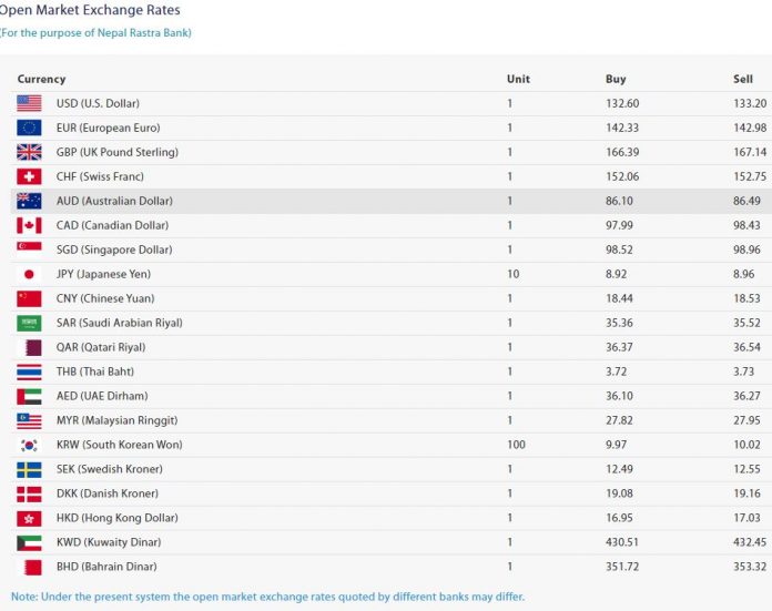 आज अमेरिकी डलरको खरिद दर १३२ रुपैयाँ ६० पैसा र बिक्री दर १३३ रुपैयाँ २० पैसामा कारोबार हुदाँ युरोपियन युरो एकको खरिद दर १४२ रुपैयाँ ३३ पैसा र बिक्री दर १४२ रुपैयाँ ९८ पैसा कायम भएको छ ।