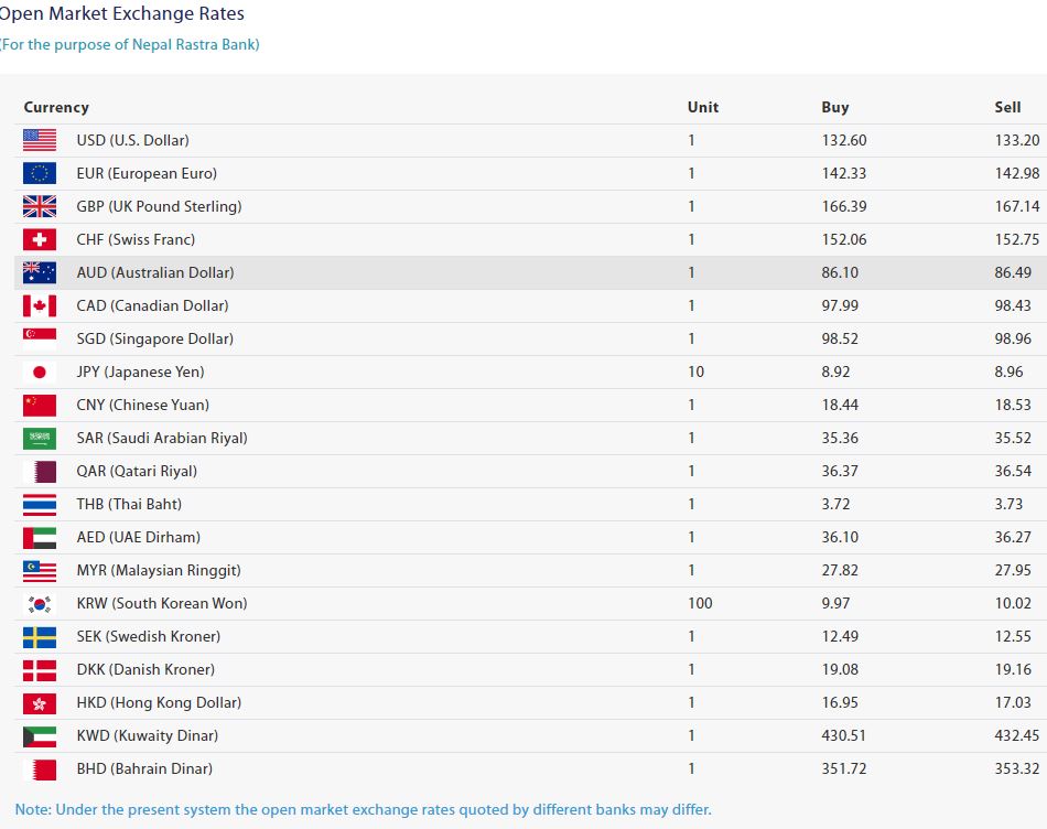 बेलायती पाउण्ड एकको खरिद दर १६६ रुपैयाँ ३९ पैसा र बिक्री दर १६७ रुपैयाँ १४ पैसा, अष्ट्रेलियन डलर १ को खरिद दर ८६ रूपैयाँ १० पैसा तथा बिक्री दर ८६ रूपैयाँ ४९ पैसा, क्यानेडियन डलर १ को खरिद दर ९७ रूपैयाँ ९९ पैसा तथा बिक्री दर ९८.४३ पैसा कायम भएको छ ।