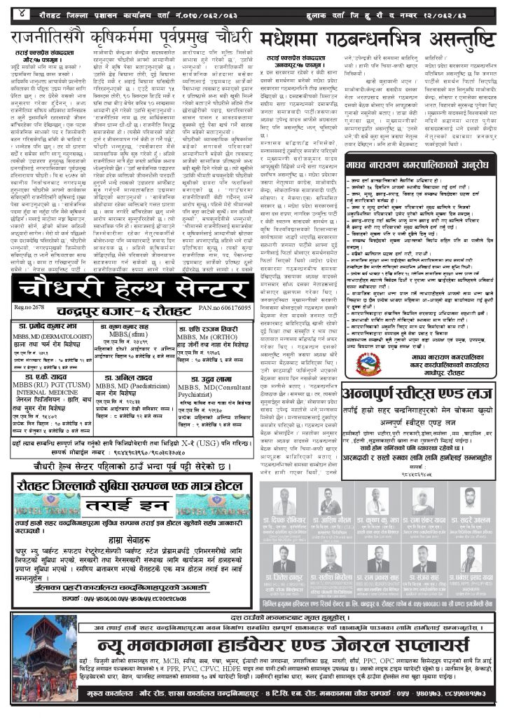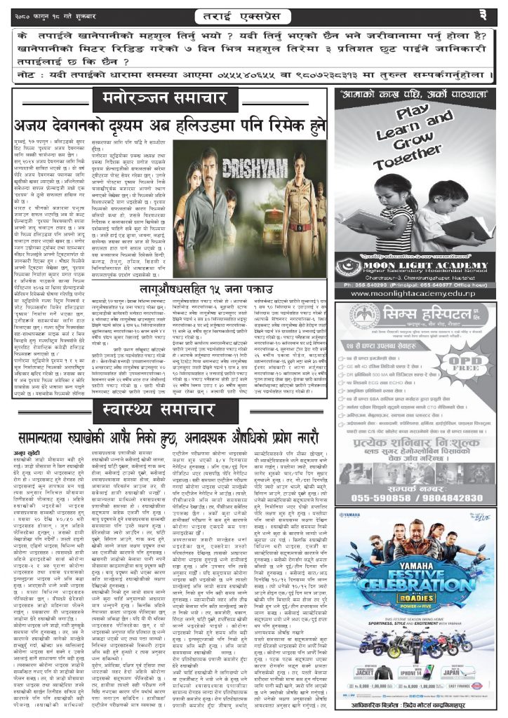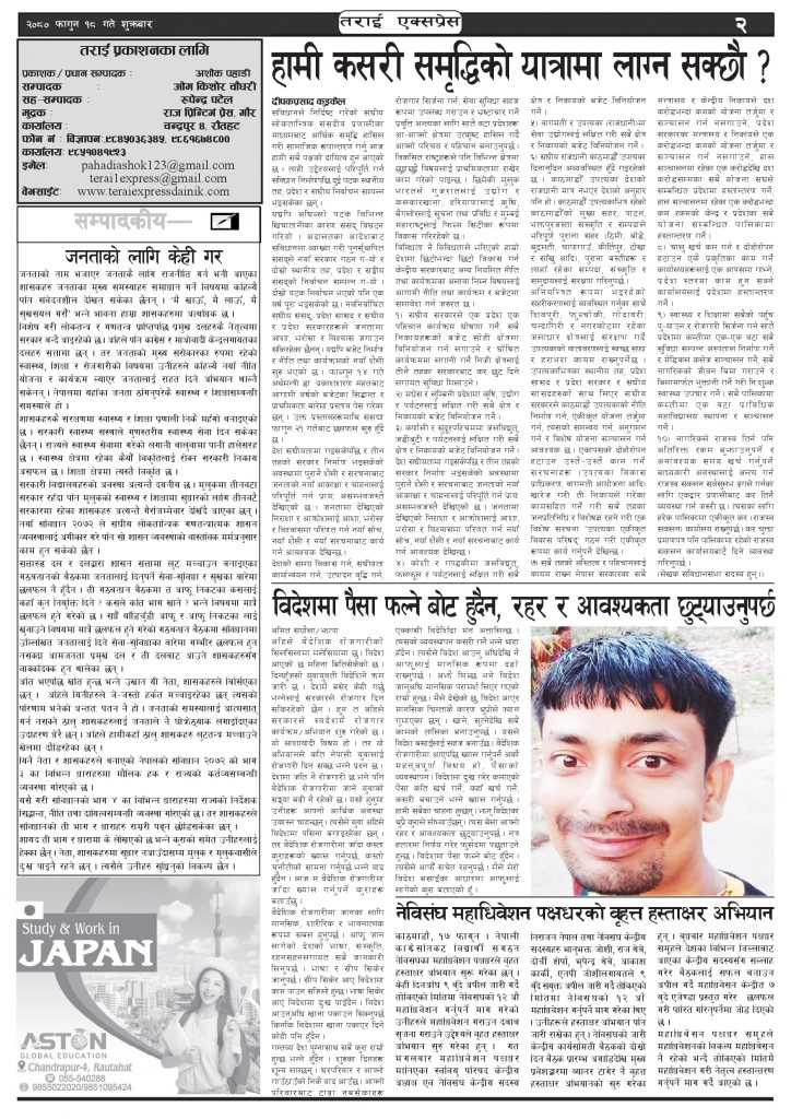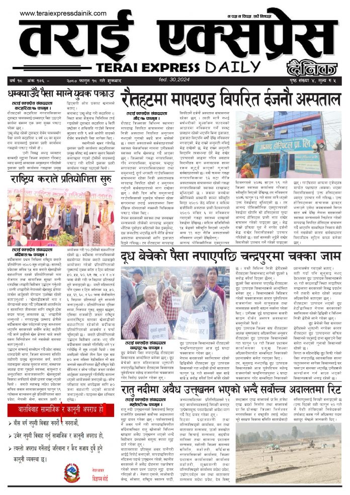 ई पेपरप्रदेशमधेश प्रदेशमुख्य समाचार २०८० फागुन १८ गतेको तराई एक्सप्रेस दैनिक तराई एक्सप्रेस दैनिक संवाददाता - March 1, 2024 RELATED ARTICLESMORE FROM AUTHOR ४० करोड कागज मिलाएको आरोपले मौलापुर ततायो यातायात व्यवस्था कार्यालय गौरमा सेवाग्राहीलाई ठगी गरेको आरोपमा एक जना पक्राउ २६ दिनमै ढल्यो गृहमन्त्रीको कुर्सी, सुधन गुरुङ ‘लगानी काण्ड’मा आउट! ताजा अपडेट ४० करोड कागज मिलाएको आरोपले मौलापुर ततायो April 23, 2026 ‘सेफ गल्र्स’ परियोजनाअन्तर्गत सेवा प्रदायक लक्षित पाँच दिने तालिम सम्पन्न April 23, 2026 यातायात व्यवस्था कार्यालय गौरमा सेवाग्राहीलाई ठगी गरेको आरोपमा एक जना पक्राउ April 22, 2026 जिल्ला धाउने दिन सकिने दाबी, व्यवहारमा कति सम्भव ? April 22, 2026 २६ दिनमै ढल्यो गृहमन्त्रीको कुर्सी, सुधन गुरुङ ‘लगानी काण्ड’मा आउट! April 22, 2026 धेरैले पढेको ४० करोड कागज मिलाएको आरोपले मौलापुर ततायो April 23, 2026 ‘सेफ गल्र्स’ परियोजनाअन्तर्गत सेवा प्रदायक लक्षित पाँच दिने तालिम सम्पन्न April 23, 2026 यातायात व्यवस्था कार्यालय गौरमा सेवाग्राहीलाई ठगी गरेको आरोपमा एक जना पक्राउ April 22, 2026 जिल्ला धाउने दिन सकिने दाबी, व्यवहारमा कति सम्भव ? April 22, 2026 २६ दिनमै ढल्यो गृहमन्त्रीको कुर्सी, सुधन गुरुङ ‘लगानी काण्ड’मा आउट! April 22, 2026