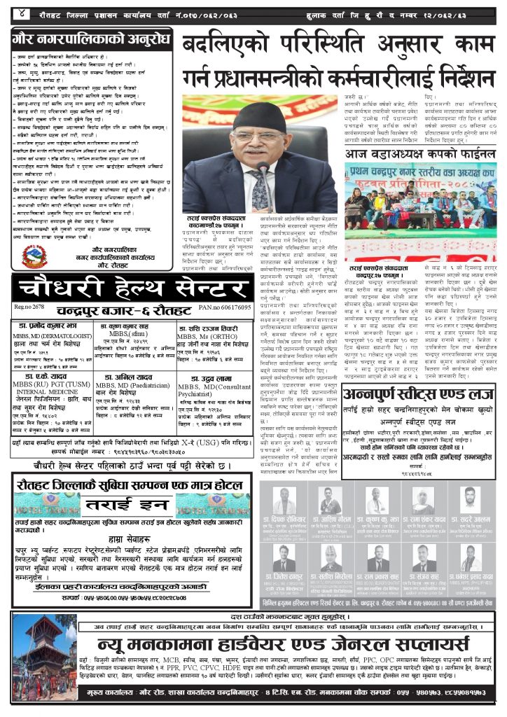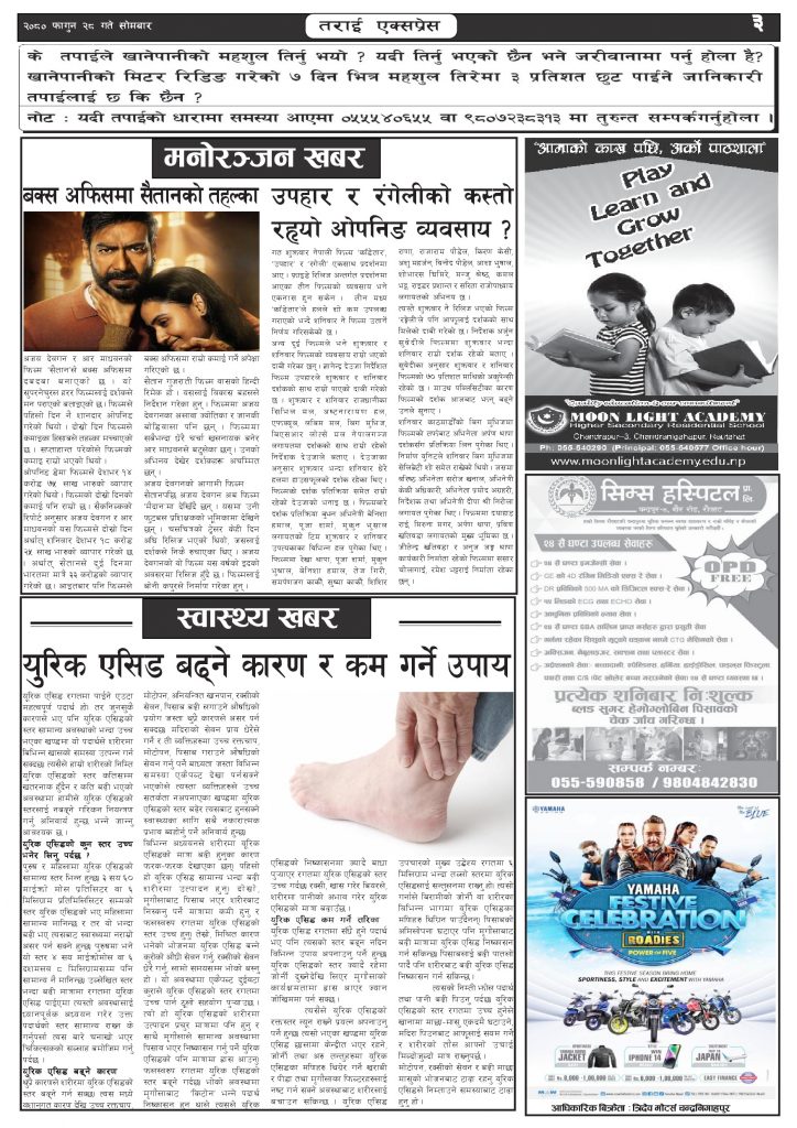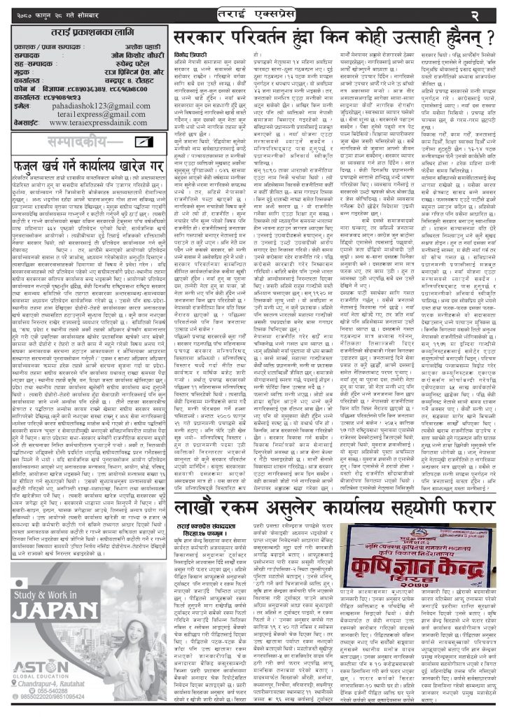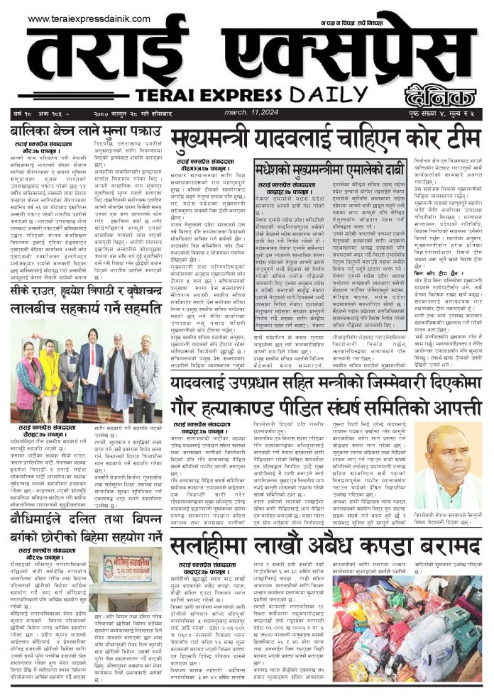 ई पेपरप्रदेशमधेश प्रदेशमुख्य समाचार २०८० फागुन २८ गतेको तराई एक्सप्रेस दैनिक तराई एक्सप्रेस दैनिक संवाददाता - March 11, 2024 RELATED ARTICLESMORE FROM AUTHOR चट्याङको कहर : एकै झट्कामा गोठ खरानी, १४ पशुको दर्दनाक अन्त २०८३ वैशाख १३ गतेको तराई एक्सप्रेस दैनिक ४० करोड कागज मिलाएको आरोपले मौलापुर ततायो ताजा अपडेट चट्याङको कहर : एकै झट्कामा गोठ खरानी, १४ पशुको दर्दनाक अन्त April 26, 2026 २०८३ वैशाख १३ गतेको तराई एक्सप्रेस दैनिक April 26, 2026 ४० करोड कागज मिलाएको आरोपले मौलापुर ततायो April 23, 2026 ‘सेफ गल्र्स’ परियोजनाअन्तर्गत सेवा प्रदायक लक्षित पाँच दिने तालिम सम्पन्न April 23, 2026 यातायात व्यवस्था कार्यालय गौरमा सेवाग्राहीलाई ठगी गरेको आरोपमा एक जना पक्राउ April 22, 2026 धेरैले पढेको चट्याङको कहर : एकै झट्कामा गोठ खरानी, १४ पशुको दर्दनाक अन्त April 26, 2026 २०८३ वैशाख १३ गतेको तराई एक्सप्रेस दैनिक April 26, 2026 ४० करोड कागज मिलाएको आरोपले मौलापुर ततायो April 23, 2026 ‘सेफ गल्र्स’ परियोजनाअन्तर्गत सेवा प्रदायक लक्षित पाँच दिने तालिम सम्पन्न April 23, 2026 यातायात व्यवस्था कार्यालय गौरमा सेवाग्राहीलाई ठगी गरेको आरोपमा एक जना पक्राउ April 22, 2026