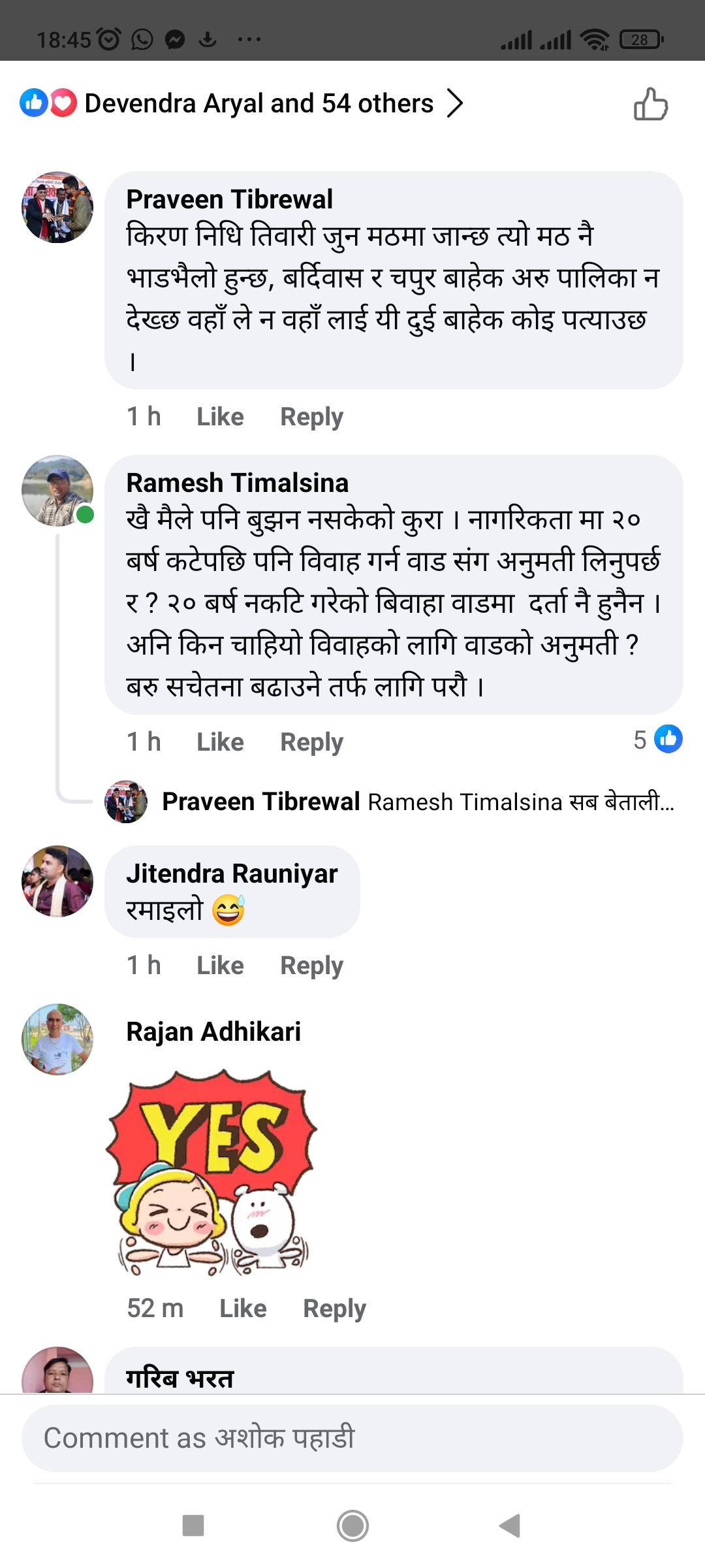 सो फेसबुक स्टाट स्टाटसमा कमेन्ट गर्नेहरूले यो नगरपालिकाको केटाकेटीपन भएको बताएका छन् । नगरपालिकाको यो उर्दीसँगै अब चन्द्रपुर नगरपालिकाका विवाह गर्ने उमेरका युवा युवतीले सम्बन्धित वडाबाट विवाह गर्नु पहिलै विवाह गर्नका लागि अनुमति लिनुपर्ने बाध्यता आइपरेको छ।