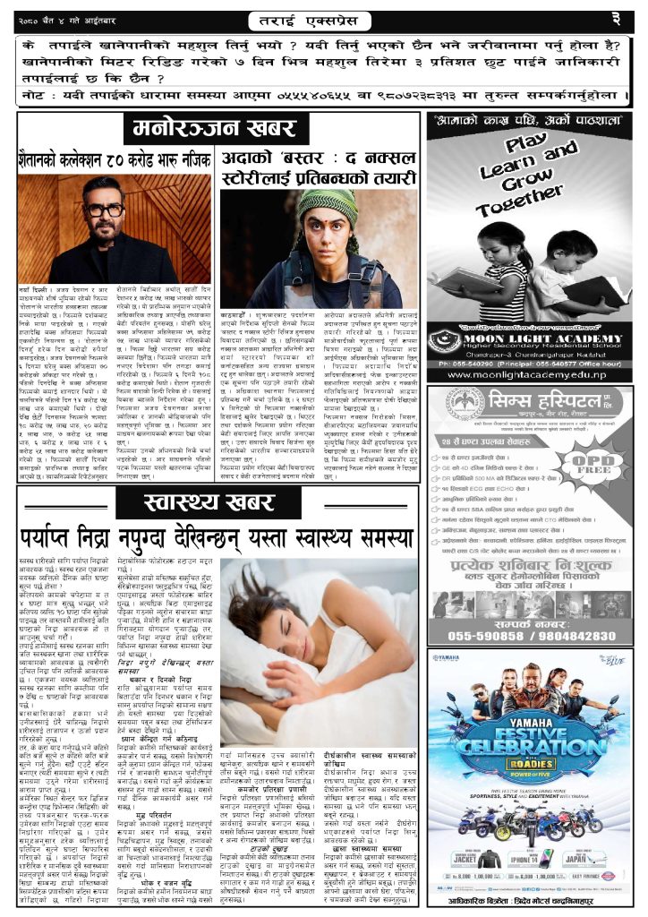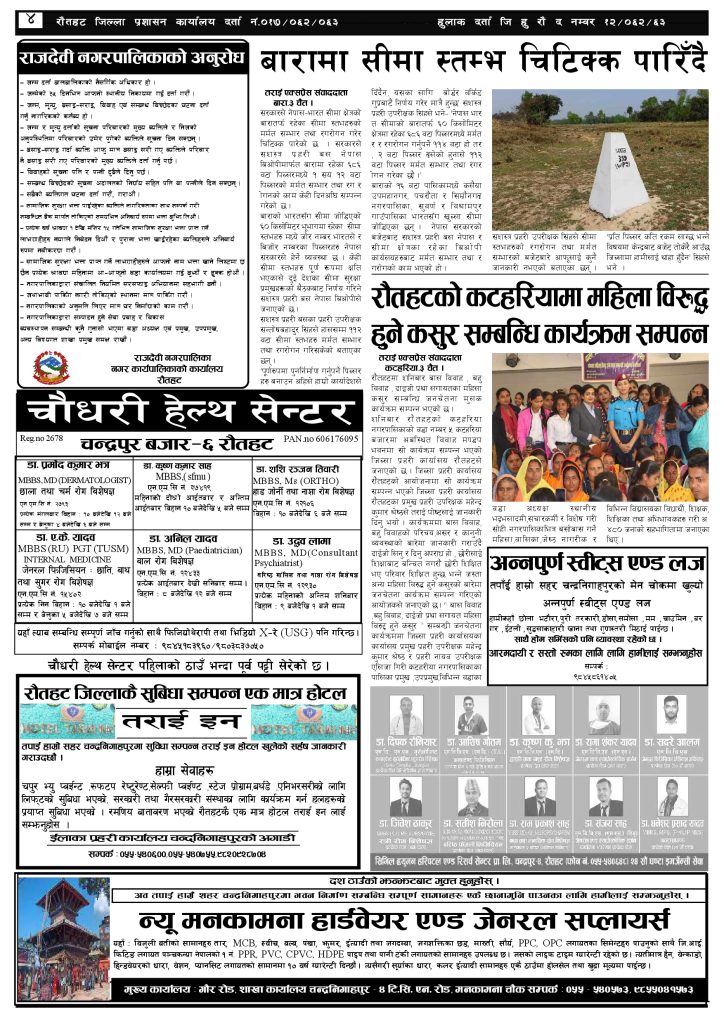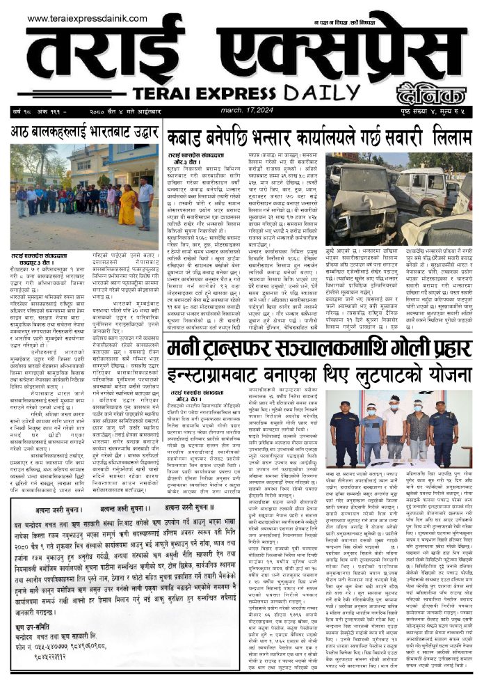 ई पेपरप्रदेशमधेश प्रदेशमुख्य समाचार २०८० फागुन ४ गतेको तराई एक्सप्रेस दैनिक तराई एक्सप्रेस दैनिक संवाददाता - March 17, 2024 RELATED ARTICLESMORE FROM AUTHOR ४० करोड कागज मिलाएको आरोपले मौलापुर ततायो यातायात व्यवस्था कार्यालय गौरमा सेवाग्राहीलाई ठगी गरेको आरोपमा एक जना पक्राउ २६ दिनमै ढल्यो गृहमन्त्रीको कुर्सी, सुधन गुरुङ ‘लगानी काण्ड’मा आउट! ताजा अपडेट ४० करोड कागज मिलाएको आरोपले मौलापुर ततायो April 23, 2026 ‘सेफ गल्र्स’ परियोजनाअन्तर्गत सेवा प्रदायक लक्षित पाँच दिने तालिम सम्पन्न April 23, 2026 यातायात व्यवस्था कार्यालय गौरमा सेवाग्राहीलाई ठगी गरेको आरोपमा एक जना पक्राउ April 22, 2026 जिल्ला धाउने दिन सकिने दाबी, व्यवहारमा कति सम्भव ? April 22, 2026 २६ दिनमै ढल्यो गृहमन्त्रीको कुर्सी, सुधन गुरुङ ‘लगानी काण्ड’मा आउट! April 22, 2026 धेरैले पढेको ४० करोड कागज मिलाएको आरोपले मौलापुर ततायो April 23, 2026 ‘सेफ गल्र्स’ परियोजनाअन्तर्गत सेवा प्रदायक लक्षित पाँच दिने तालिम सम्पन्न April 23, 2026 यातायात व्यवस्था कार्यालय गौरमा सेवाग्राहीलाई ठगी गरेको आरोपमा एक जना पक्राउ April 22, 2026 जिल्ला धाउने दिन सकिने दाबी, व्यवहारमा कति सम्भव ? April 22, 2026 २६ दिनमै ढल्यो गृहमन्त्रीको कुर्सी, सुधन गुरुङ ‘लगानी काण्ड’मा आउट! April 22, 2026