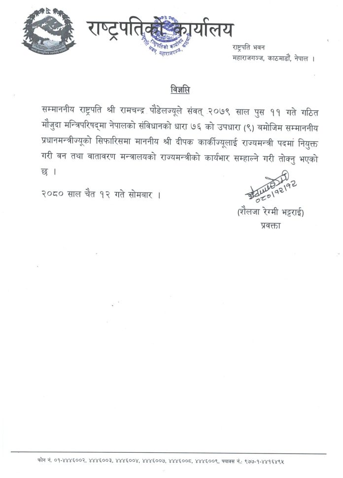 नवनियुक्त राज्यमन्त्री कार्कीको शपथ ३ बजे प्रधानमन्त्री तथा मन्त्रीपरिषद्को कार्यालय, सिंहदबारमा हुँदैछ ।