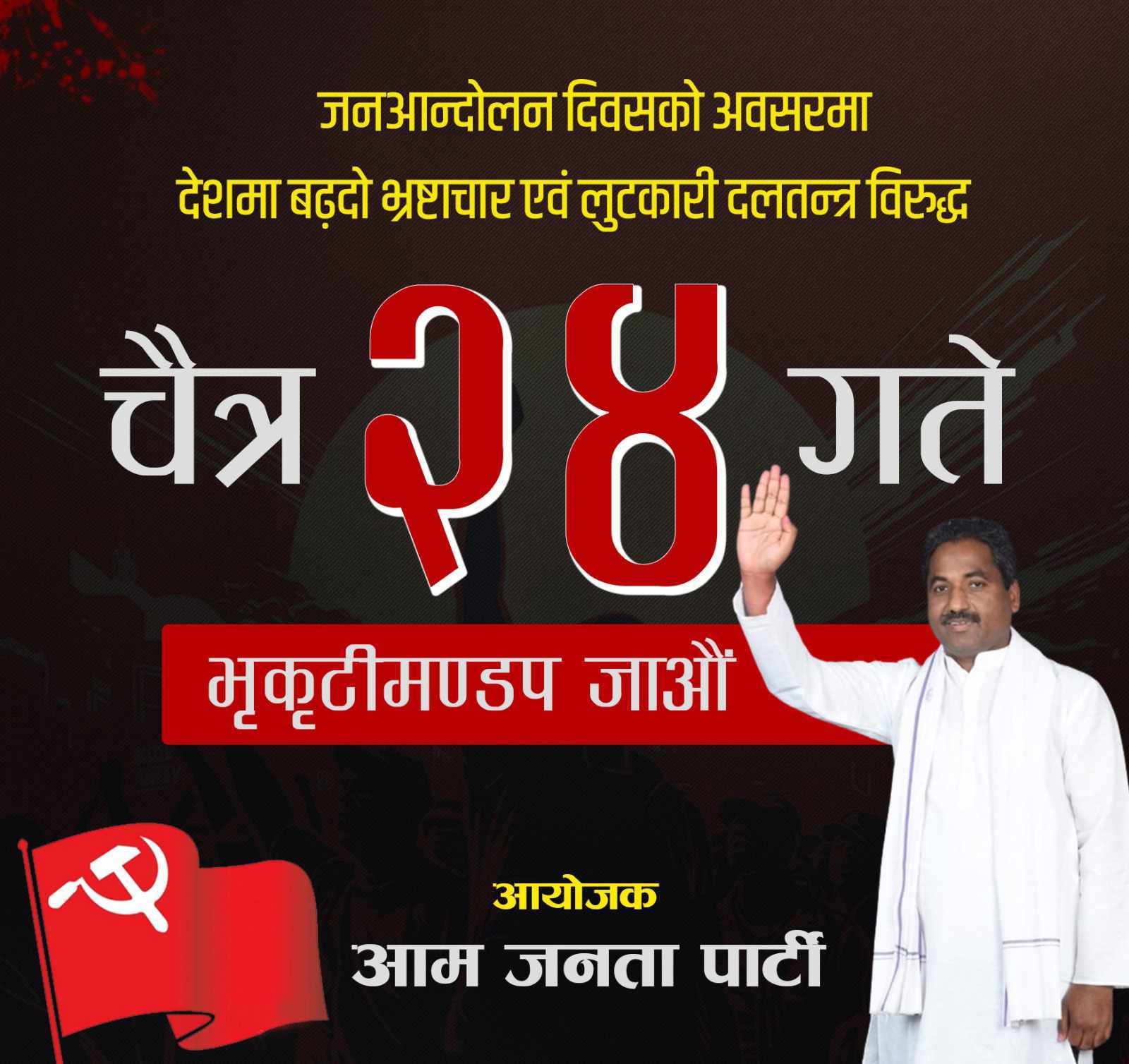 काठमाडौं, २४ चैत। आम जनता पार्टी (आजपा) ले दलतन्त्र र भ्रष्टाचारको विरुद्धमा आज शनिबार काठमाडौंमा जनप्रदर्शन गर्दैछ ।