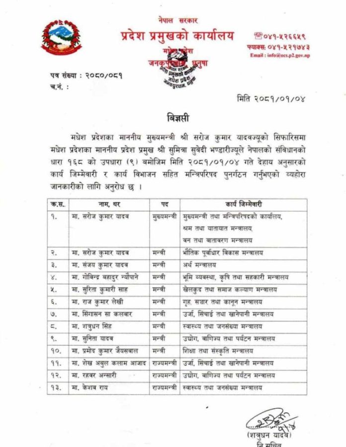 जनकपुरधाम । मधेस प्रदेशमा मुख्यमन्त्री सरोजकुमार यादवले मन्त्रीपरिषद् पुनर्गठन गरेका छन् ।