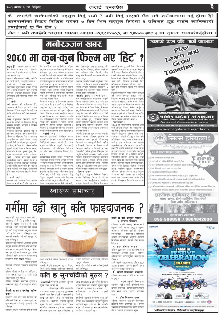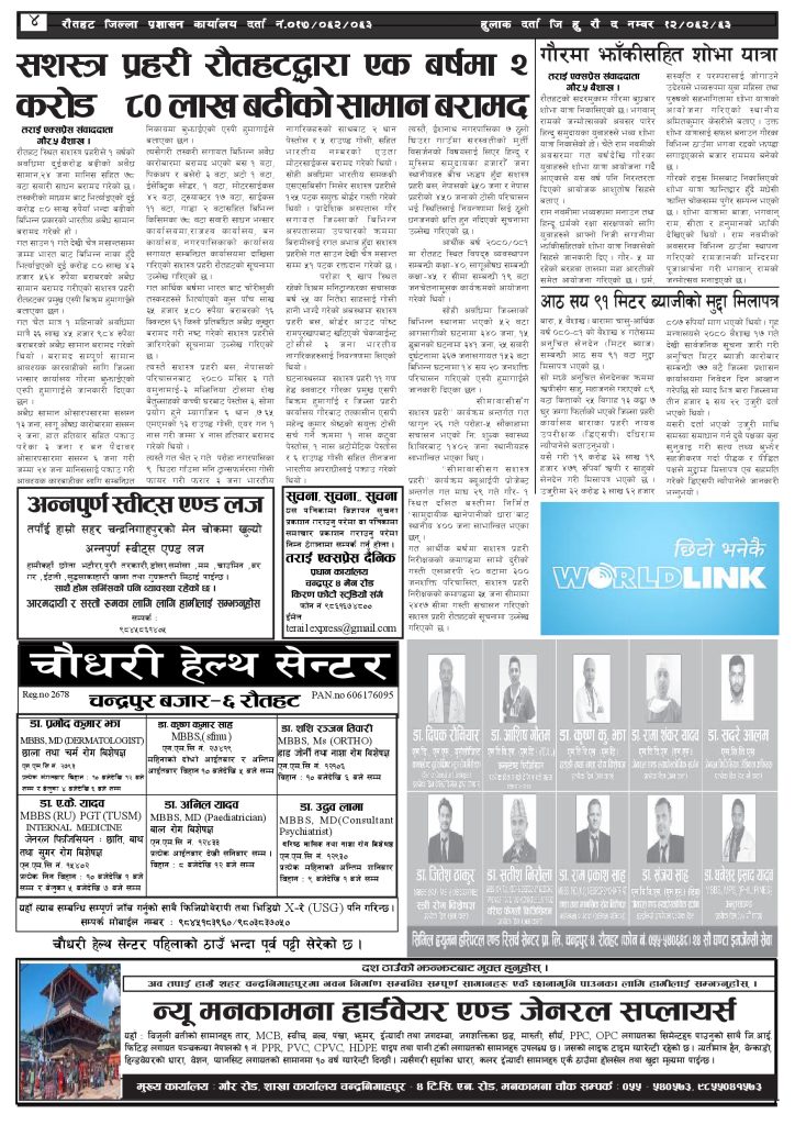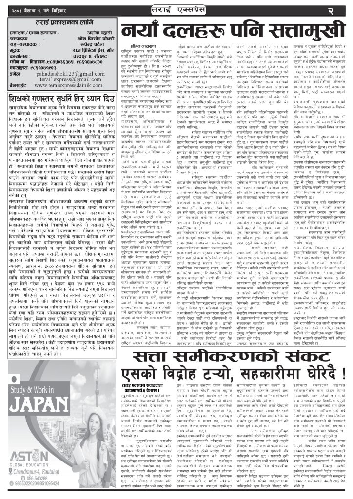 ई पेपरप्रदेशबागमती प्रदेशमुख्य समाचार २०८१ बैशाख ६ गतेको तराई एक्सप्रेस दैनिक तराई एक्सप्रेस दैनिक - April 18, 2024 RELATED ARTICLESMORE FROM AUTHOR ४० करोड कागज मिलाएको आरोपले मौलापुर ततायो २६ दिनमै ढल्यो गृहमन्त्रीको कुर्सी, सुधन गुरुङ ‘लगानी काण्ड’मा आउट! २०७३ वैशाख ९ गतेको तराई एक्सप्रेस दैनिक ताजा अपडेट ४० करोड कागज मिलाएको आरोपले मौलापुर ततायो April 23, 2026 ‘सेफ गल्र्स’ परियोजनाअन्तर्गत सेवा प्रदायक लक्षित पाँच दिने तालिम सम्पन्न April 23, 2026 यातायात व्यवस्था कार्यालय गौरमा सेवाग्राहीलाई ठगी गरेको आरोपमा एक जना पक्राउ April 22, 2026 जिल्ला धाउने दिन सकिने दाबी, व्यवहारमा कति सम्भव ? April 22, 2026 २६ दिनमै ढल्यो गृहमन्त्रीको कुर्सी, सुधन गुरुङ ‘लगानी काण्ड’मा आउट! April 22, 2026 धेरैले पढेको ४० करोड कागज मिलाएको आरोपले मौलापुर ततायो April 23, 2026 ‘सेफ गल्र्स’ परियोजनाअन्तर्गत सेवा प्रदायक लक्षित पाँच दिने तालिम सम्पन्न April 23, 2026 यातायात व्यवस्था कार्यालय गौरमा सेवाग्राहीलाई ठगी गरेको आरोपमा एक जना पक्राउ April 22, 2026 जिल्ला धाउने दिन सकिने दाबी, व्यवहारमा कति सम्भव ? April 22, 2026 २६ दिनमै ढल्यो गृहमन्त्रीको कुर्सी, सुधन गुरुङ ‘लगानी काण्ड’मा आउट! April 22, 2026
