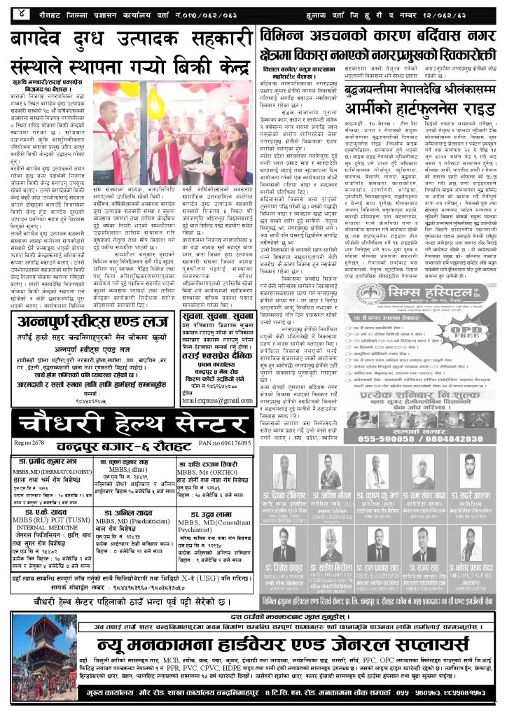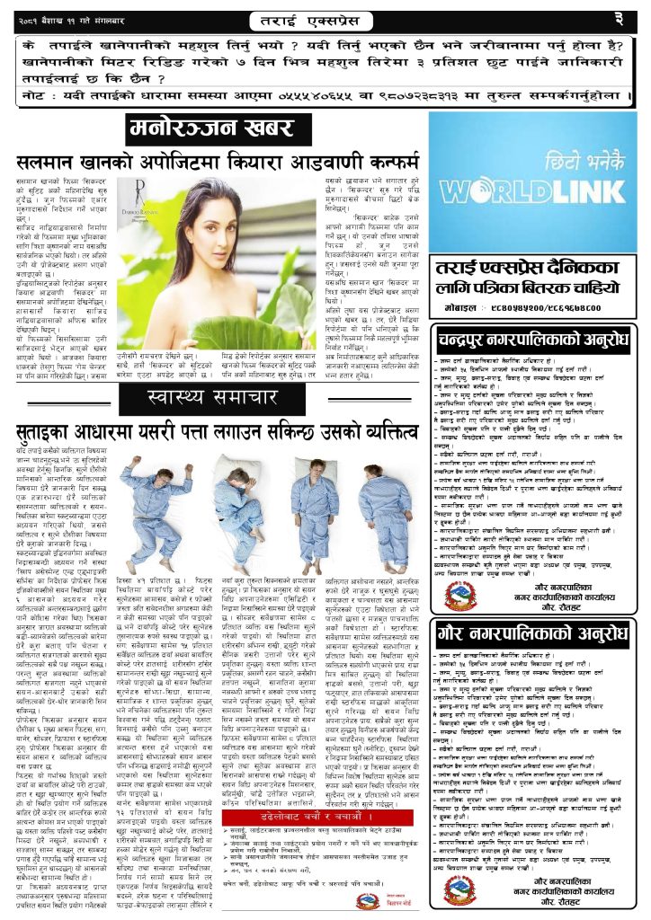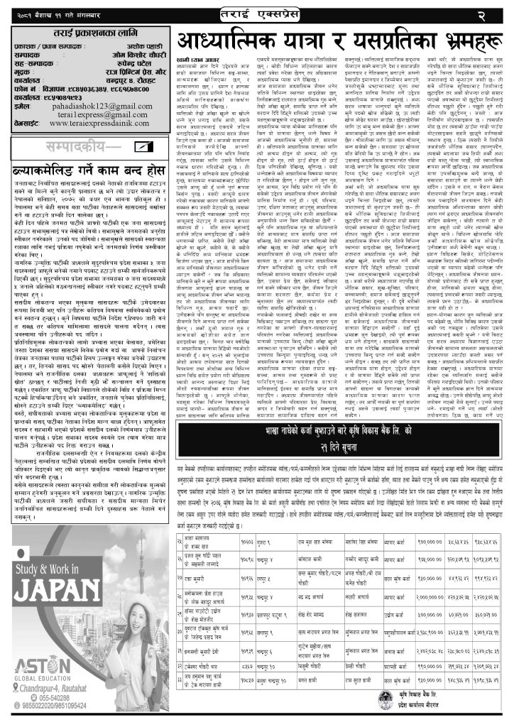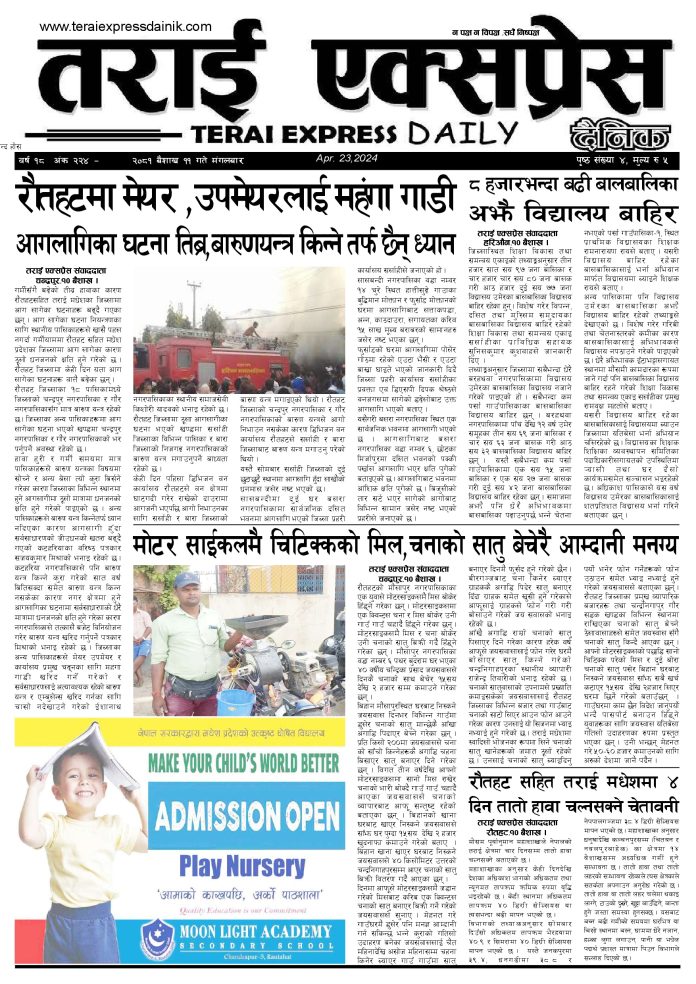 ई पेपरप्रदेशमधेश प्रदेशमुख्य समाचार २०८१ बैशाख ११ गतेको तराई एक्सप्रेस दैनिक तराई एक्सप्रेस दैनिक - April 23, 2024 RELATED ARTICLESMORE FROM AUTHOR २६ दिनमै ढल्यो गृहमन्त्रीको कुर्सी, सुधन गुरुङ ‘लगानी काण्ड’मा आउट! २०७३ वैशाख ९ गतेको तराई एक्सप्रेस दैनिक राजमार्ग कब्जा गर्नेको दिन गयो: सरकार ‘एक्सन मोड’मा ताजा अपडेट जिल्ला धाउने दिन सकिने दाबी, व्यवहारमा कति सम्भव ? April 22, 2026 २६ दिनमै ढल्यो गृहमन्त्रीको कुर्सी, सुधन गुरुङ ‘लगानी काण्ड’मा आउट! April 22, 2026 २०७३ वैशाख ९ गतेको तराई एक्सप्रेस दैनिक April 22, 2026 राजमार्ग कब्जा गर्नेको दिन गयो: सरकार ‘एक्सन मोड’मा April 21, 2026 काजको आडमा असुली धन्धा : प्रहरीभित्रै ‘नेटवर्क’ चल्दै April 21, 2026 धेरैले पढेको जिल्ला धाउने दिन सकिने दाबी, व्यवहारमा कति सम्भव ? April 22, 2026 २६ दिनमै ढल्यो गृहमन्त्रीको कुर्सी, सुधन गुरुङ ‘लगानी काण्ड’मा आउट! April 22, 2026 २०७३ वैशाख ९ गतेको तराई एक्सप्रेस दैनिक April 22, 2026 राजमार्ग कब्जा गर्नेको दिन गयो: सरकार ‘एक्सन मोड’मा April 21, 2026 काजको आडमा असुली धन्धा : प्रहरीभित्रै ‘नेटवर्क’ चल्दै April 21, 2026