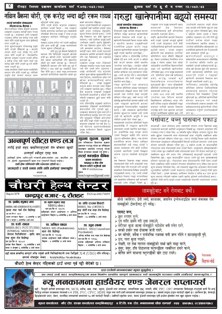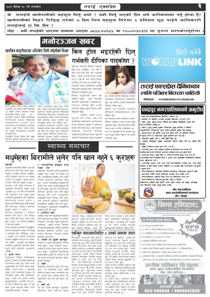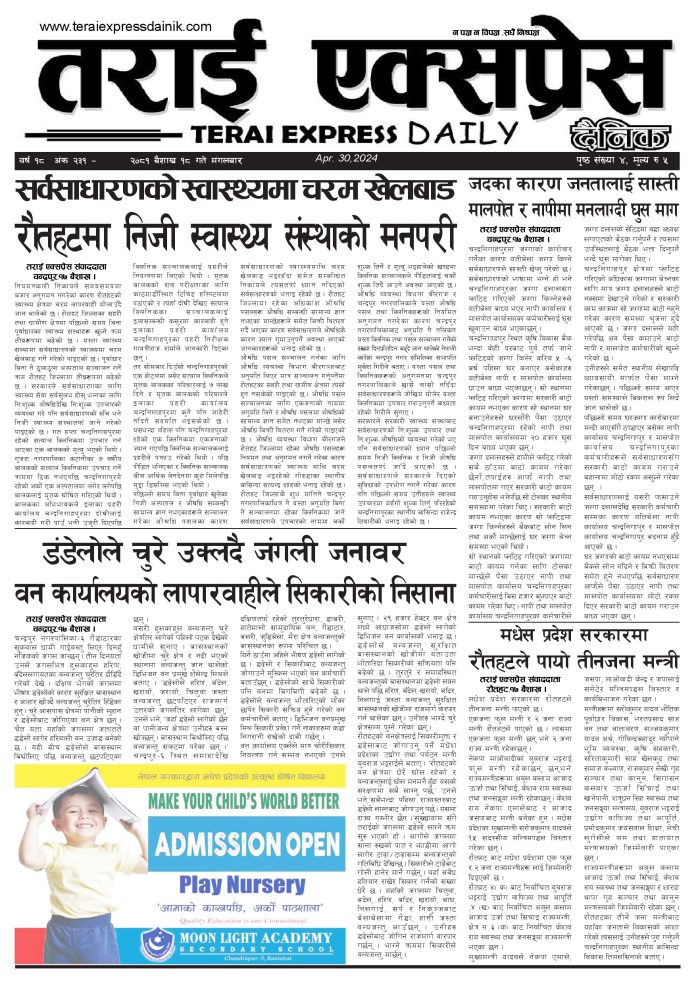 ई पेपरप्रदेशमधेश प्रदेशमुख्य समाचार २०८१ बैशाख १८ गतेको तराई एक्सप्रेस दैनिक तराई एक्सप्रेस दैनिक - April 30, 2024 RELATED ARTICLESMORE FROM AUTHOR २०७३ वैशाख ९ गतेको तराई एक्सप्रेस दैनिक राजमार्ग कब्जा गर्नेको दिन गयो: सरकार ‘एक्सन मोड’मा काजको आडमा असुली धन्धा : प्रहरीभित्रै ‘नेटवर्क’ चल्दै ताजा अपडेट २०७३ वैशाख ९ गतेको तराई एक्सप्रेस दैनिक April 22, 2026 राजमार्ग कब्जा गर्नेको दिन गयो: सरकार ‘एक्सन मोड’मा April 21, 2026 काजको आडमा असुली धन्धा : प्रहरीभित्रै ‘नेटवर्क’ चल्दै April 21, 2026 ओभरसियरले उल्टै थर्काए स्थानीय April 21, 2026 आजको राशिफल April 21, 2026 धेरैले पढेको २०७३ वैशाख ९ गतेको तराई एक्सप्रेस दैनिक April 22, 2026 राजमार्ग कब्जा गर्नेको दिन गयो: सरकार ‘एक्सन मोड’मा April 21, 2026 काजको आडमा असुली धन्धा : प्रहरीभित्रै ‘नेटवर्क’ चल्दै April 21, 2026 ओभरसियरले उल्टै थर्काए स्थानीय April 21, 2026 आजको राशिफल April 21, 2026