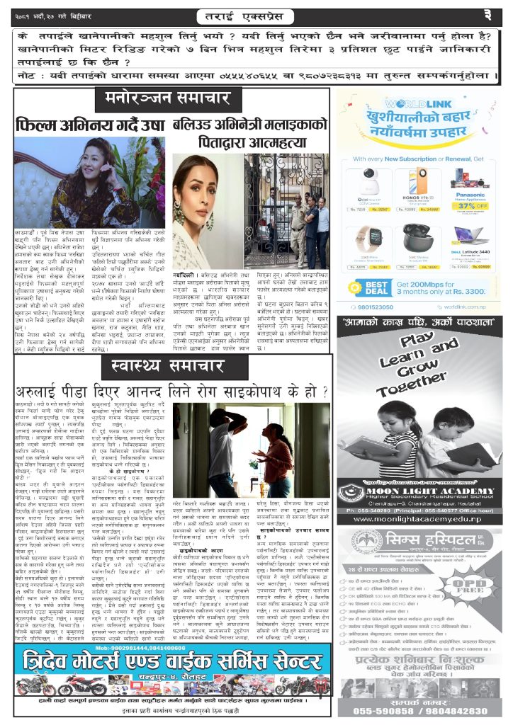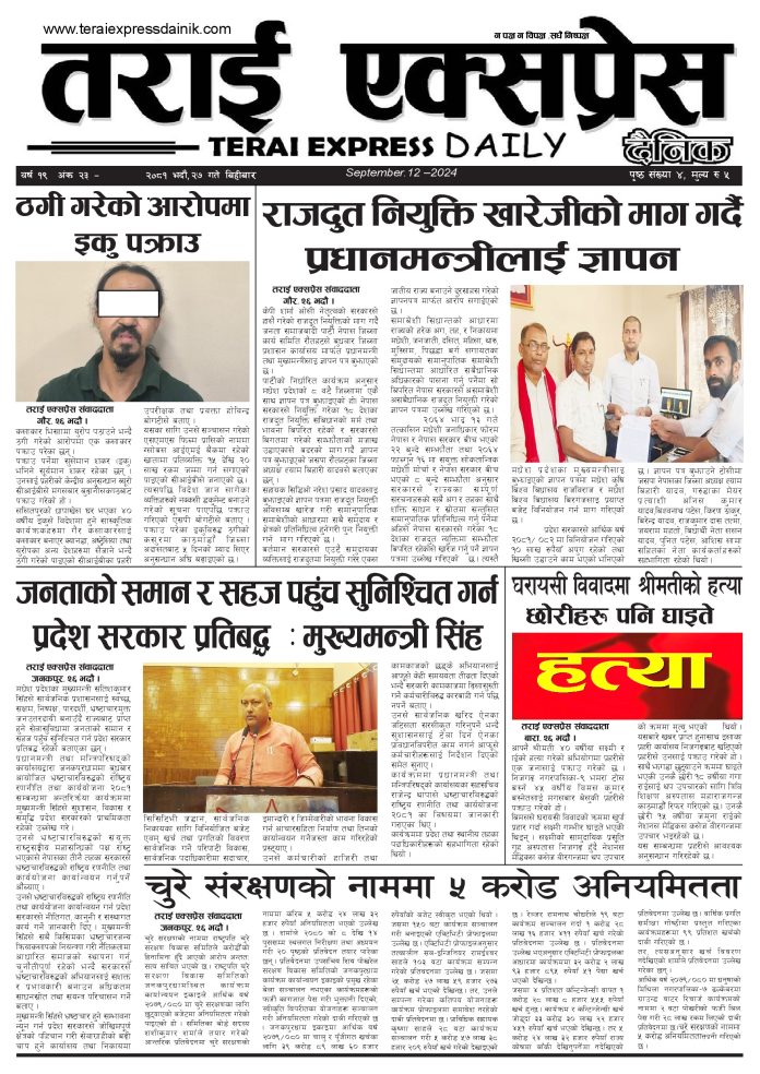 ई पेपरमुख्य समाचार २०८१ भदौ २७ गतेको तराई एक्सप्रेस दैनिक तराई एक्सप्रेस दैनिक - September 12, 2024 RELATED ARTICLESMORE FROM AUTHOR ४० करोड कागज मिलाएको आरोपले मौलापुर ततायो २६ दिनमै ढल्यो गृहमन्त्रीको कुर्सी, सुधन गुरुङ ‘लगानी काण्ड’मा आउट! २०७३ वैशाख ९ गतेको तराई एक्सप्रेस दैनिक ताजा अपडेट ४० करोड कागज मिलाएको आरोपले मौलापुर ततायो April 23, 2026 ‘सेफ गल्र्स’ परियोजनाअन्तर्गत सेवा प्रदायक लक्षित पाँच दिने तालिम सम्पन्न April 23, 2026 यातायात व्यवस्था कार्यालय गौरमा सेवाग्राहीलाई ठगी गरेको आरोपमा एक जना पक्राउ April 22, 2026 जिल्ला धाउने दिन सकिने दाबी, व्यवहारमा कति सम्भव ? April 22, 2026 २६ दिनमै ढल्यो गृहमन्त्रीको कुर्सी, सुधन गुरुङ ‘लगानी काण्ड’मा आउट! April 22, 2026 धेरैले पढेको ४० करोड कागज मिलाएको आरोपले मौलापुर ततायो April 23, 2026 ‘सेफ गल्र्स’ परियोजनाअन्तर्गत सेवा प्रदायक लक्षित पाँच दिने तालिम सम्पन्न April 23, 2026 यातायात व्यवस्था कार्यालय गौरमा सेवाग्राहीलाई ठगी गरेको आरोपमा एक जना पक्राउ April 22, 2026 जिल्ला धाउने दिन सकिने दाबी, व्यवहारमा कति सम्भव ? April 22, 2026 २६ दिनमै ढल्यो गृहमन्त्रीको कुर्सी, सुधन गुरुङ ‘लगानी काण्ड’मा आउट! April 22, 2026
