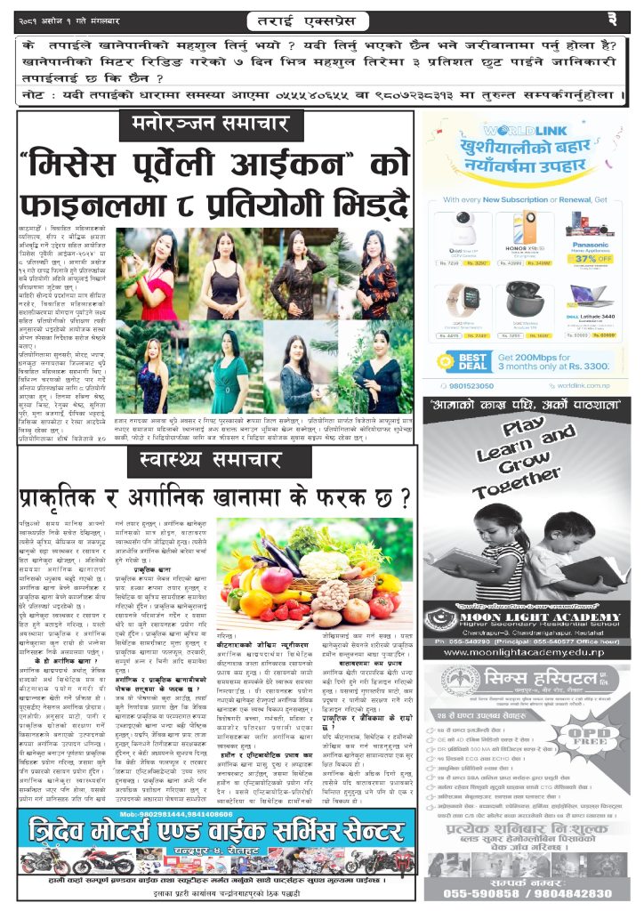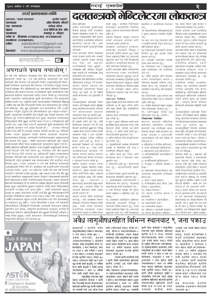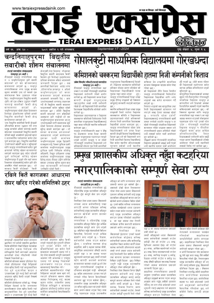 ई पेपरप्रदेशमधेश प्रदेशमुख्य समाचार २०८१ असोज २१ गतेको तराई एक्सप्रेस दैनिक तराई एक्सप्रेस दैनिक - September 17, 2024 RELATED ARTICLESMORE FROM AUTHOR यातायात व्यवस्था कार्यालय गौरमा सेवाग्राहीलाई ठगी गरेको आरोपमा एक जना पक्राउ २६ दिनमै ढल्यो गृहमन्त्रीको कुर्सी, सुधन गुरुङ ‘लगानी काण्ड’मा आउट! २०७३ वैशाख ९ गतेको तराई एक्सप्रेस दैनिक ताजा अपडेट यातायात व्यवस्था कार्यालय गौरमा सेवाग्राहीलाई ठगी गरेको आरोपमा एक जना पक्राउ April 22, 2026 जिल्ला धाउने दिन सकिने दाबी, व्यवहारमा कति सम्भव ? April 22, 2026 २६ दिनमै ढल्यो गृहमन्त्रीको कुर्सी, सुधन गुरुङ ‘लगानी काण्ड’मा आउट! April 22, 2026 २०७३ वैशाख ९ गतेको तराई एक्सप्रेस दैनिक April 22, 2026 राजमार्ग कब्जा गर्नेको दिन गयो: सरकार ‘एक्सन मोड’मा April 21, 2026 धेरैले पढेको यातायात व्यवस्था कार्यालय गौरमा सेवाग्राहीलाई ठगी गरेको आरोपमा एक जना पक्राउ April 22, 2026 जिल्ला धाउने दिन सकिने दाबी, व्यवहारमा कति सम्भव ? April 22, 2026 २६ दिनमै ढल्यो गृहमन्त्रीको कुर्सी, सुधन गुरुङ ‘लगानी काण्ड’मा आउट! April 22, 2026 २०७३ वैशाख ९ गतेको तराई एक्सप्रेस दैनिक April 22, 2026 राजमार्ग कब्जा गर्नेको दिन गयो: सरकार ‘एक्सन मोड’मा April 21, 2026