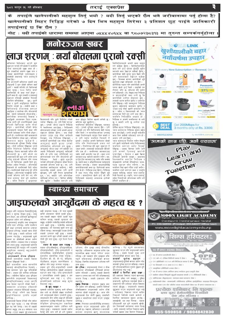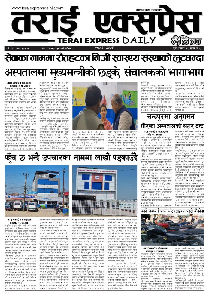 ई पेपर २०८१ फागुन १९ गतेको तराई एक्सप्रेस दैनिक तराई एक्सप्रेस दैनिक - March 3, 2025 RELATED ARTICLESMORE FROM AUTHOR २०७३ वैशाख ९ गतेको तराई एक्सप्रेस दैनिक २०८२ वैशाख ८ गतेको तराई एक्सप्रेस दैनिक २०७३ वैशाख ३ गतेको तराई एक्सप्रेस दैनिक ताजा अपडेट २०७३ वैशाख ९ गतेको तराई एक्सप्रेस दैनिक April 22, 2026 राजमार्ग कब्जा गर्नेको दिन गयो: सरकार ‘एक्सन मोड’मा April 21, 2026 काजको आडमा असुली धन्धा : प्रहरीभित्रै ‘नेटवर्क’ चल्दै April 21, 2026 ओभरसियरले उल्टै थर्काए स्थानीय April 21, 2026 आजको राशिफल April 21, 2026 धेरैले पढेको २०७३ वैशाख ९ गतेको तराई एक्सप्रेस दैनिक April 22, 2026 राजमार्ग कब्जा गर्नेको दिन गयो: सरकार ‘एक्सन मोड’मा April 21, 2026 काजको आडमा असुली धन्धा : प्रहरीभित्रै ‘नेटवर्क’ चल्दै April 21, 2026 ओभरसियरले उल्टै थर्काए स्थानीय April 21, 2026 आजको राशिफल April 21, 2026