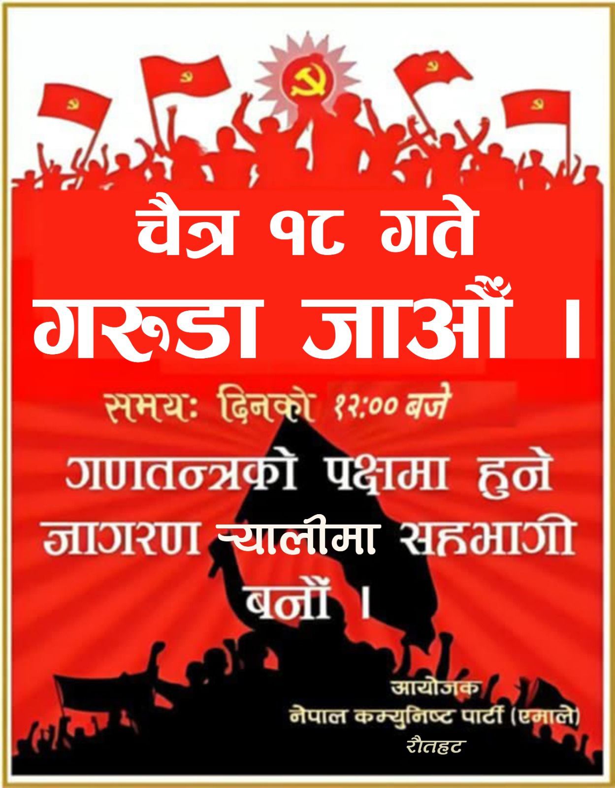 एमाले रौतहटका अध्यक्ष शचिदानन्द साहले एउटा पत्र जारी गर्दै पार्टीको केन्द्रीय सर्कुलर अनुसार गणतन्त्रको पक्षमा चैत १८ गते दिउँसो १२ बजेदेखि वृहत् ¥याली आयोजना गरिने जानकारी गराएका छन् ।