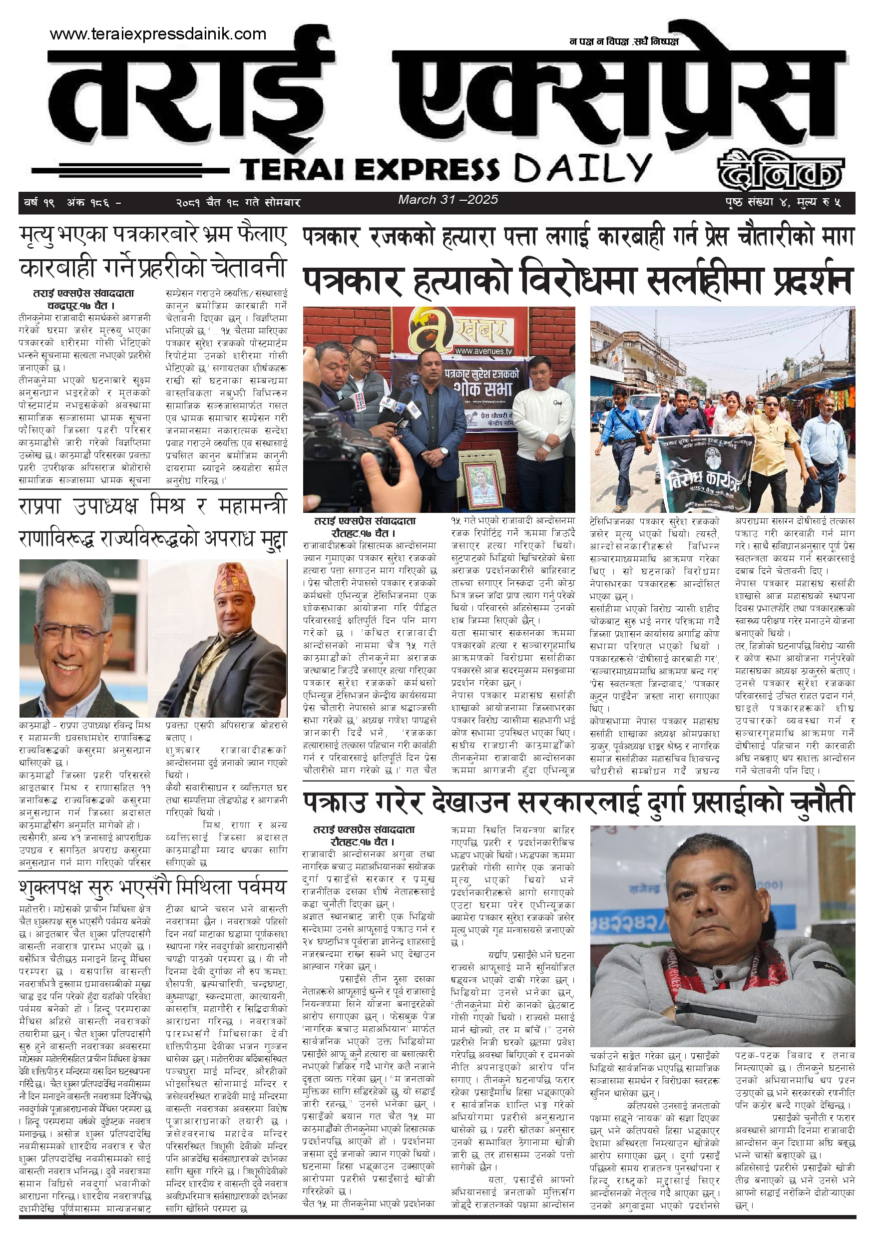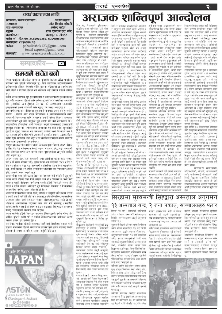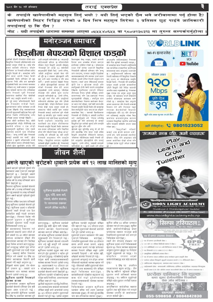 ई पेपर २०८१ चैत १८ गतेको तराई एक्सप्रेस दैनिक तराई एक्सप्रेस दैनिक - March 31, 2025 RELATED ARTICLESMORE FROM AUTHOR २०७३ वैशाख ९ गतेको तराई एक्सप्रेस दैनिक २०८२ वैशाख ८ गतेको तराई एक्सप्रेस दैनिक २०७३ वैशाख ३ गतेको तराई एक्सप्रेस दैनिक ताजा अपडेट जिल्ला धाउने दिन सकिने दाबी, व्यवहारमा कति सम्भव ? April 22, 2026 २६ दिनमै ढल्यो गृहमन्त्रीको कुर्सी, सुधन गुरुङ ‘लगानी काण्ड’मा आउट! April 22, 2026 २०७३ वैशाख ९ गतेको तराई एक्सप्रेस दैनिक April 22, 2026 राजमार्ग कब्जा गर्नेको दिन गयो: सरकार ‘एक्सन मोड’मा April 21, 2026 काजको आडमा असुली धन्धा : प्रहरीभित्रै ‘नेटवर्क’ चल्दै April 21, 2026 धेरैले पढेको जिल्ला धाउने दिन सकिने दाबी, व्यवहारमा कति सम्भव ? April 22, 2026 २६ दिनमै ढल्यो गृहमन्त्रीको कुर्सी, सुधन गुरुङ ‘लगानी काण्ड’मा आउट! April 22, 2026 २०७३ वैशाख ९ गतेको तराई एक्सप्रेस दैनिक April 22, 2026 राजमार्ग कब्जा गर्नेको दिन गयो: सरकार ‘एक्सन मोड’मा April 21, 2026 काजको आडमा असुली धन्धा : प्रहरीभित्रै ‘नेटवर्क’ चल्दै April 21, 2026
