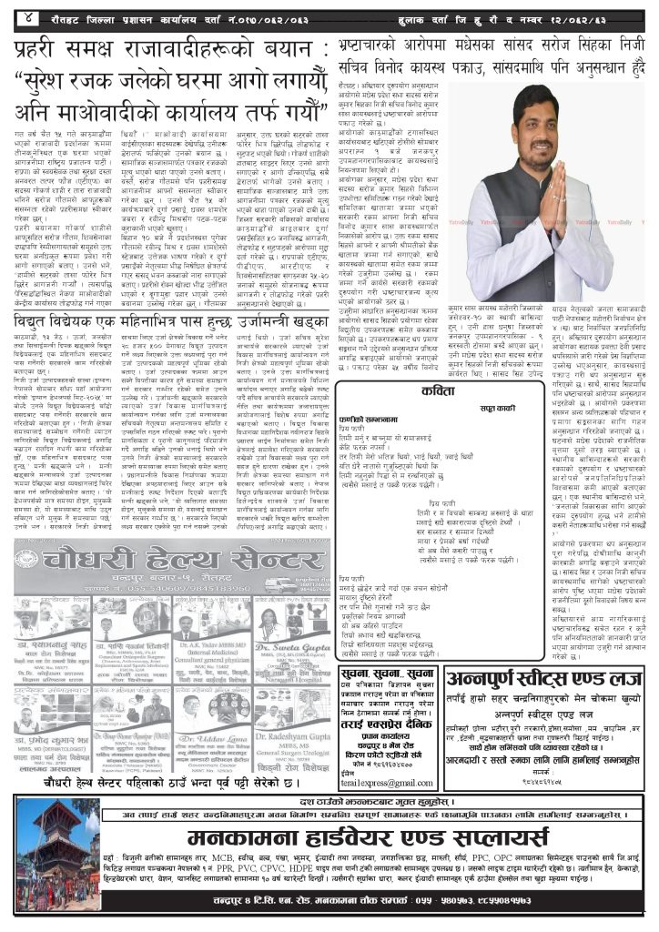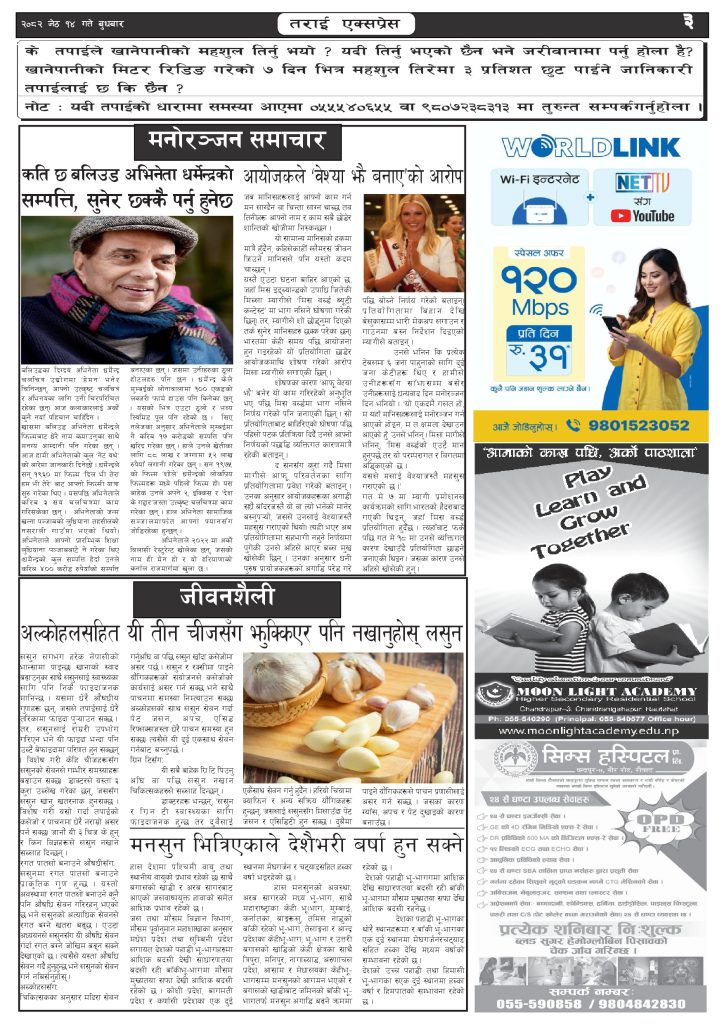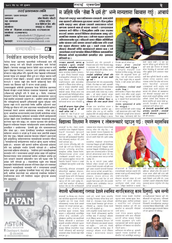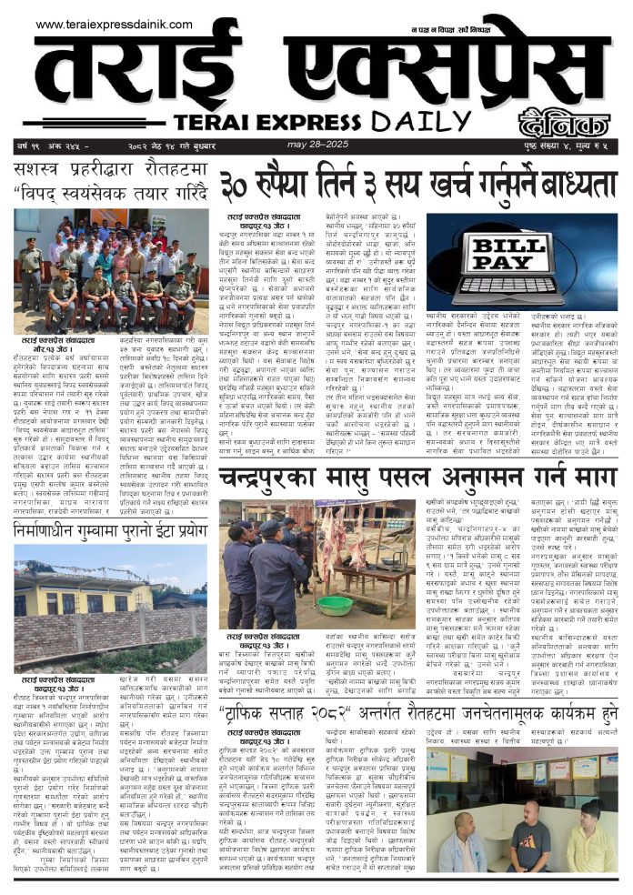 ई पेपर २०८२ जेठ १४ गतेको तराई एक्सप्रेस दैनिक तराई एक्सप्रेस दैनिक - May 28, 2025 RELATED ARTICLESMORE FROM AUTHOR २०७३ वैशाख ३ गतेको तराई एक्सप्रेस दैनिक २०८२ चैत ३० गतेको तराई एक्सप्रेस दैनिक २०८२ चैत २९ गतेको तराई एक्सप्रेस दैनिक ताजा अपडेट गौरमा अटो नियन्त्रण प्रयास असफल April 20, 2026 ‘जान्नेलाई छान्ने’ नारा नै धरापमा, रास्वपा मन्त्रीहरू एकपछि अर्को विवादमा April 20, 2026 “बत्ती गयो, सेवा गयो : कटहरियामा प्रशासनदेखि पानीसम्म ठप्प” April 20, 2026 सिमारक्षकलाई नै सास्ती, सरकारको नीतिप्रति आलमको चिन्ता April 18, 2026 चन्द्रपुरबाट बोकाचोर पक्राउ April 18, 2026 धेरैले पढेको गौरमा अटो नियन्त्रण प्रयास असफल April 20, 2026 ‘जान्नेलाई छान्ने’ नारा नै धरापमा, रास्वपा मन्त्रीहरू एकपछि अर्को विवादमा April 20, 2026 “बत्ती गयो, सेवा गयो : कटहरियामा प्रशासनदेखि पानीसम्म ठप्प” April 20, 2026 सिमारक्षकलाई नै सास्ती, सरकारको नीतिप्रति आलमको चिन्ता April 18, 2026 चन्द्रपुरबाट बोकाचोर पक्राउ April 18, 2026
