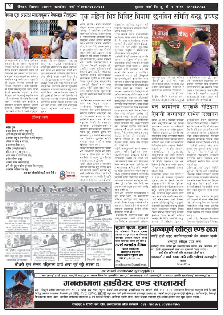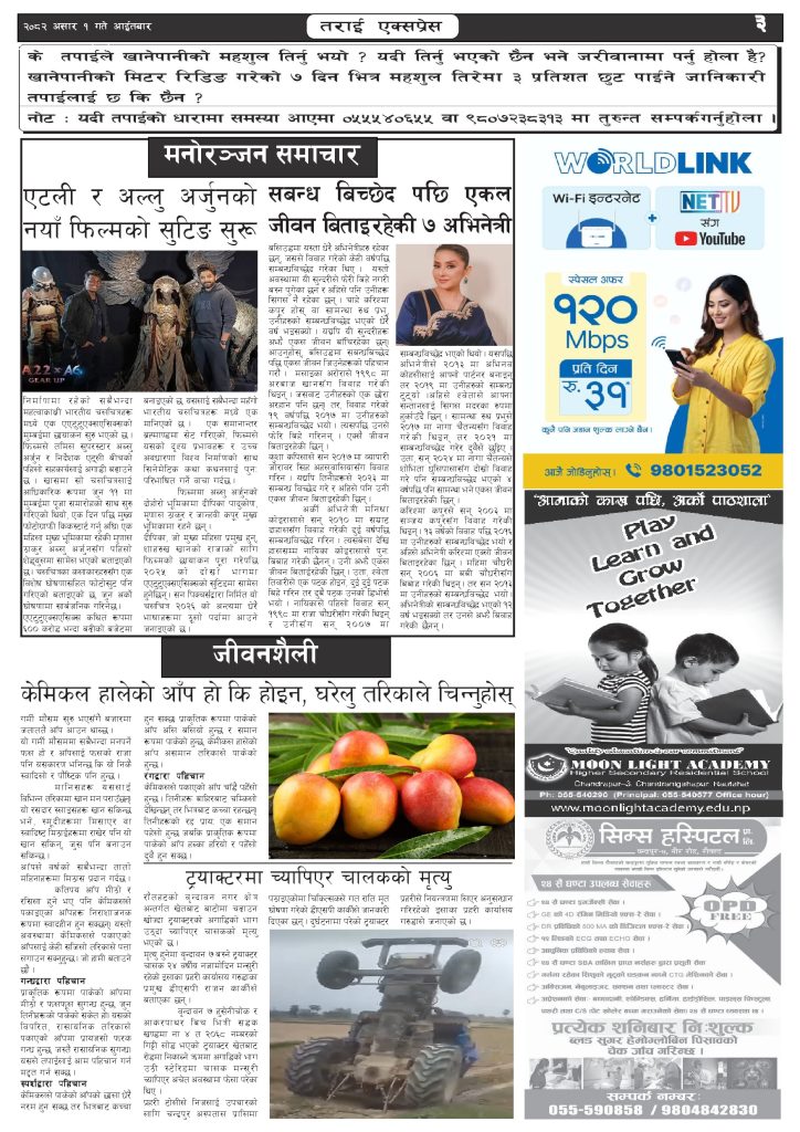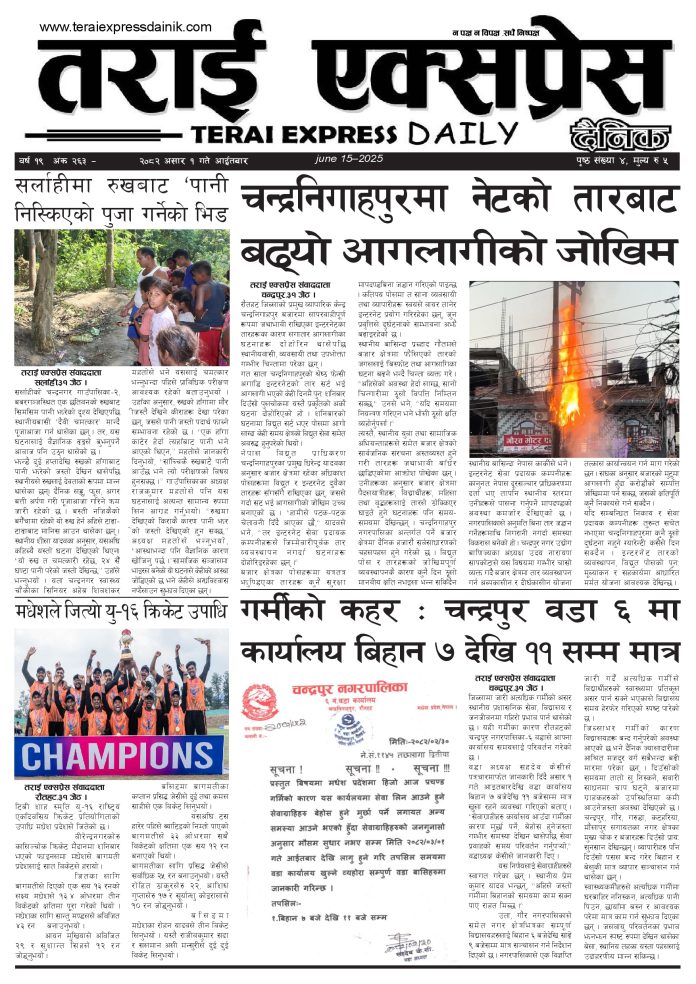 ई पेपर २०८२ असार १ गतेको तराई एक्सप्रेस दैनिक तराई एक्सप्रेस दैनिक - June 15, 2025 RELATED ARTICLESMORE FROM AUTHOR २०७३ वैशाख ३ गतेको तराई एक्सप्रेस दैनिक २०८२ चैत ३० गतेको तराई एक्सप्रेस दैनिक २०८२ चैत २९ गतेको तराई एक्सप्रेस दैनिक ताजा अपडेट गौरमा अटो नियन्त्रण प्रयास असफल April 20, 2026 ‘जान्नेलाई छान्ने’ नारा नै धरापमा, रास्वपा मन्त्रीहरू एकपछि अर्को विवादमा April 20, 2026 “बत्ती गयो, सेवा गयो : कटहरियामा प्रशासनदेखि पानीसम्म ठप्प” April 20, 2026 सिमारक्षकलाई नै सास्ती, सरकारको नीतिप्रति आलमको चिन्ता April 18, 2026 चन्द्रपुरबाट बोकाचोर पक्राउ April 18, 2026 धेरैले पढेको गौरमा अटो नियन्त्रण प्रयास असफल April 20, 2026 ‘जान्नेलाई छान्ने’ नारा नै धरापमा, रास्वपा मन्त्रीहरू एकपछि अर्को विवादमा April 20, 2026 “बत्ती गयो, सेवा गयो : कटहरियामा प्रशासनदेखि पानीसम्म ठप्प” April 20, 2026 सिमारक्षकलाई नै सास्ती, सरकारको नीतिप्रति आलमको चिन्ता April 18, 2026 चन्द्रपुरबाट बोकाचोर पक्राउ April 18, 2026
