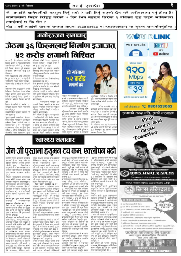 ई पेपर २०८२ असार ५ गतेको तराई एक्सप्रेस दैनिक तराई एक्सप्रेस दैनिक - June 19, 2025 RELATED ARTICLESMORE FROM AUTHOR २०७३ वैशाख ९ गतेको तराई एक्सप्रेस दैनिक २०८२ वैशाख ८ गतेको तराई एक्सप्रेस दैनिक २०७३ वैशाख ३ गतेको तराई एक्सप्रेस दैनिक ताजा अपडेट ४० करोड कागज मिलाएको आरोपले मौलापुर ततायो April 23, 2026 ‘सेफ गल्र्स’ परियोजनाअन्तर्गत सेवा प्रदायक लक्षित पाँच दिने तालिम सम्पन्न April 23, 2026 यातायात व्यवस्था कार्यालय गौरमा सेवाग्राहीलाई ठगी गरेको आरोपमा एक जना पक्राउ April 22, 2026 जिल्ला धाउने दिन सकिने दाबी, व्यवहारमा कति सम्भव ? April 22, 2026 २६ दिनमै ढल्यो गृहमन्त्रीको कुर्सी, सुधन गुरुङ ‘लगानी काण्ड’मा आउट! April 22, 2026 धेरैले पढेको ४० करोड कागज मिलाएको आरोपले मौलापुर ततायो April 23, 2026 ‘सेफ गल्र्स’ परियोजनाअन्तर्गत सेवा प्रदायक लक्षित पाँच दिने तालिम सम्पन्न April 23, 2026 यातायात व्यवस्था कार्यालय गौरमा सेवाग्राहीलाई ठगी गरेको आरोपमा एक जना पक्राउ April 22, 2026 जिल्ला धाउने दिन सकिने दाबी, व्यवहारमा कति सम्भव ? April 22, 2026 २६ दिनमै ढल्यो गृहमन्त्रीको कुर्सी, सुधन गुरुङ ‘लगानी काण्ड’मा आउट! April 22, 2026