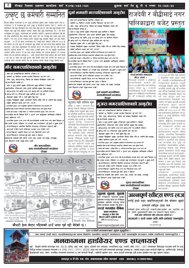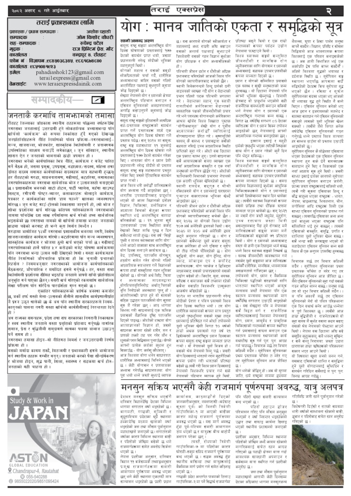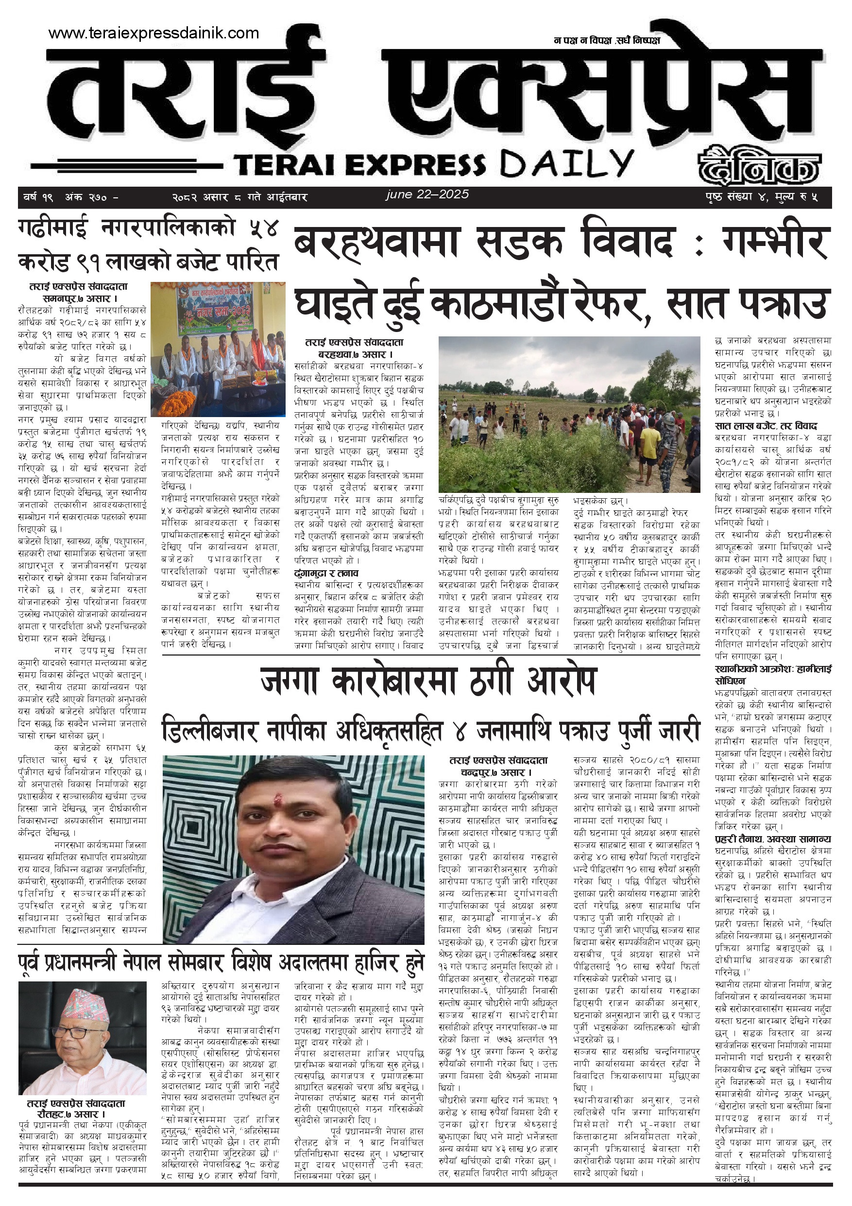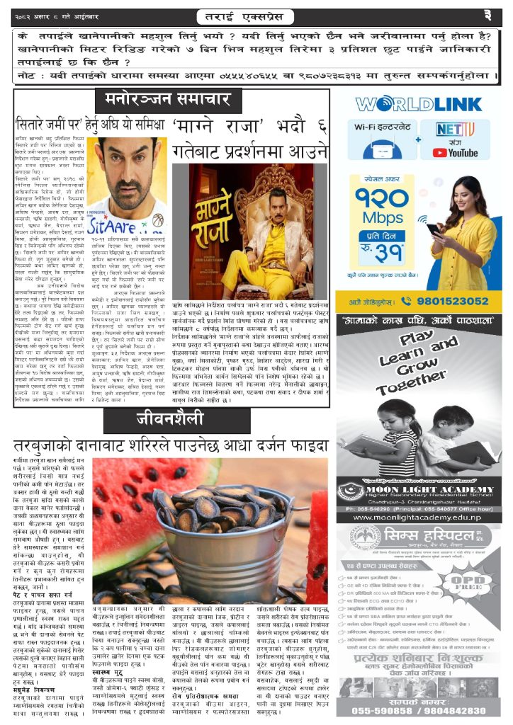 ई पेपर २०८२ असार ८ गतेको तराई एक्सप्रेस दैनिक तराई एक्सप्रेस दैनिक - June 22, 2025 RELATED ARTICLESMORE FROM AUTHOR २०७३ वैशाख ९ गतेको तराई एक्सप्रेस दैनिक २०८२ वैशाख ८ गतेको तराई एक्सप्रेस दैनिक २०७३ वैशाख ३ गतेको तराई एक्सप्रेस दैनिक ताजा अपडेट ४० करोड कागज मिलाएको आरोपले मौलापुर ततायो April 23, 2026 ‘सेफ गल्र्स’ परियोजनाअन्तर्गत सेवा प्रदायक लक्षित पाँच दिने तालिम सम्पन्न April 23, 2026 यातायात व्यवस्था कार्यालय गौरमा सेवाग्राहीलाई ठगी गरेको आरोपमा एक जना पक्राउ April 22, 2026 जिल्ला धाउने दिन सकिने दाबी, व्यवहारमा कति सम्भव ? April 22, 2026 २६ दिनमै ढल्यो गृहमन्त्रीको कुर्सी, सुधन गुरुङ ‘लगानी काण्ड’मा आउट! April 22, 2026 धेरैले पढेको ४० करोड कागज मिलाएको आरोपले मौलापुर ततायो April 23, 2026 ‘सेफ गल्र्स’ परियोजनाअन्तर्गत सेवा प्रदायक लक्षित पाँच दिने तालिम सम्पन्न April 23, 2026 यातायात व्यवस्था कार्यालय गौरमा सेवाग्राहीलाई ठगी गरेको आरोपमा एक जना पक्राउ April 22, 2026 जिल्ला धाउने दिन सकिने दाबी, व्यवहारमा कति सम्भव ? April 22, 2026 २६ दिनमै ढल्यो गृहमन्त्रीको कुर्सी, सुधन गुरुङ ‘लगानी काण्ड’मा आउट! April 22, 2026