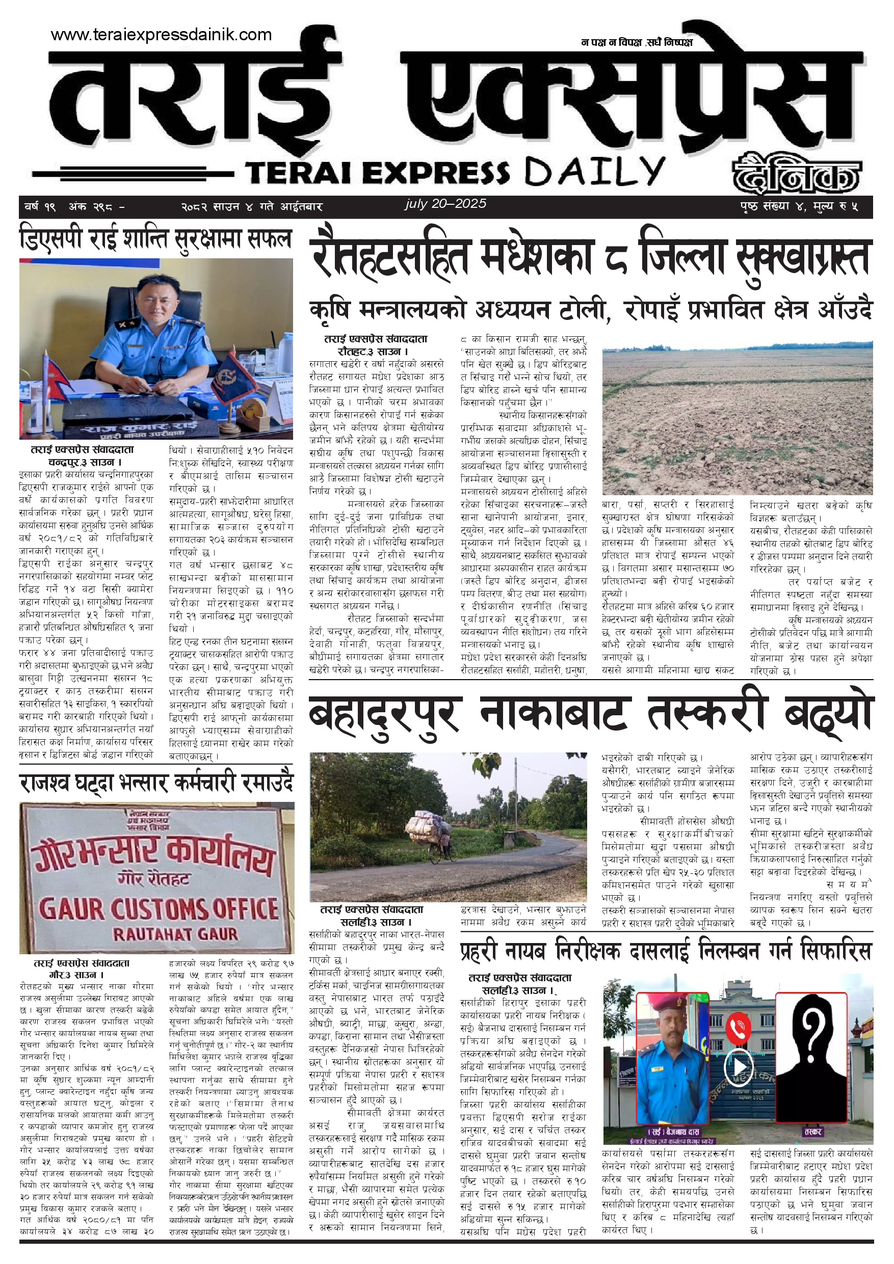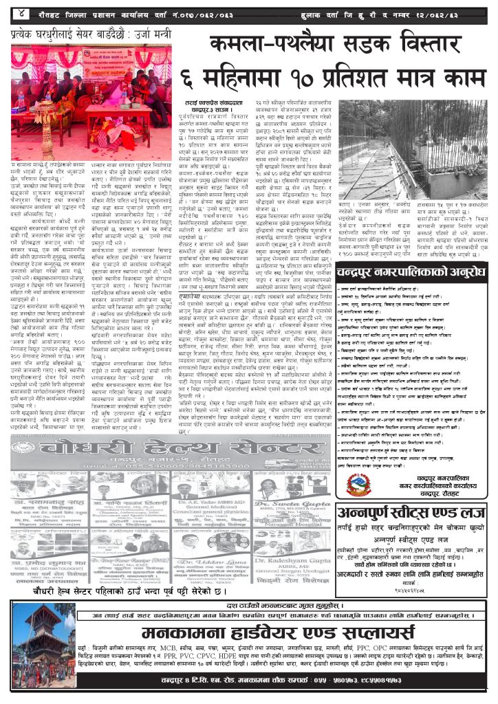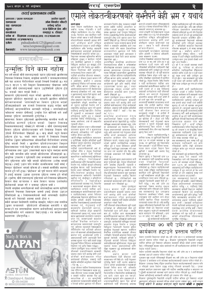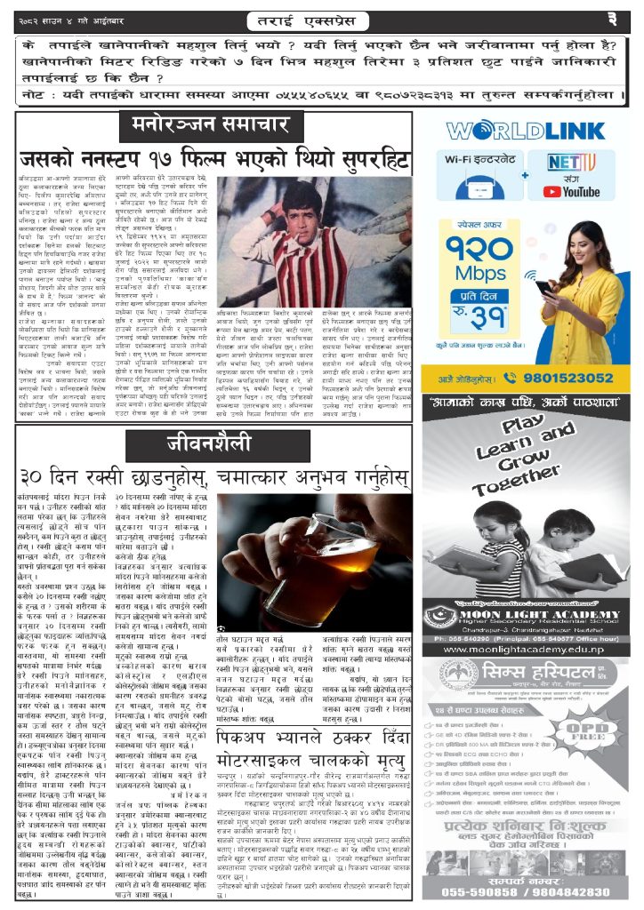 ई पेपर २०८२ साउन ४ गतेको तराई एक्सप्रेस दैनिक तराई एक्सप्रेस दैनिक - July 20, 2025 RELATED ARTICLESMORE FROM AUTHOR २०७३ वैशाख ९ गतेको तराई एक्सप्रेस दैनिक २०८२ वैशाख ८ गतेको तराई एक्सप्रेस दैनिक २०७३ वैशाख ३ गतेको तराई एक्सप्रेस दैनिक ताजा अपडेट ४० करोड कागज मिलाएको आरोपले मौलापुर ततायो April 23, 2026 ‘सेफ गल्र्स’ परियोजनाअन्तर्गत सेवा प्रदायक लक्षित पाँच दिने तालिम सम्पन्न April 23, 2026 यातायात व्यवस्था कार्यालय गौरमा सेवाग्राहीलाई ठगी गरेको आरोपमा एक जना पक्राउ April 22, 2026 जिल्ला धाउने दिन सकिने दाबी, व्यवहारमा कति सम्भव ? April 22, 2026 २६ दिनमै ढल्यो गृहमन्त्रीको कुर्सी, सुधन गुरुङ ‘लगानी काण्ड’मा आउट! April 22, 2026 धेरैले पढेको ४० करोड कागज मिलाएको आरोपले मौलापुर ततायो April 23, 2026 ‘सेफ गल्र्स’ परियोजनाअन्तर्गत सेवा प्रदायक लक्षित पाँच दिने तालिम सम्पन्न April 23, 2026 यातायात व्यवस्था कार्यालय गौरमा सेवाग्राहीलाई ठगी गरेको आरोपमा एक जना पक्राउ April 22, 2026 जिल्ला धाउने दिन सकिने दाबी, व्यवहारमा कति सम्भव ? April 22, 2026 २६ दिनमै ढल्यो गृहमन्त्रीको कुर्सी, सुधन गुरुङ ‘लगानी काण्ड’मा आउट! April 22, 2026
