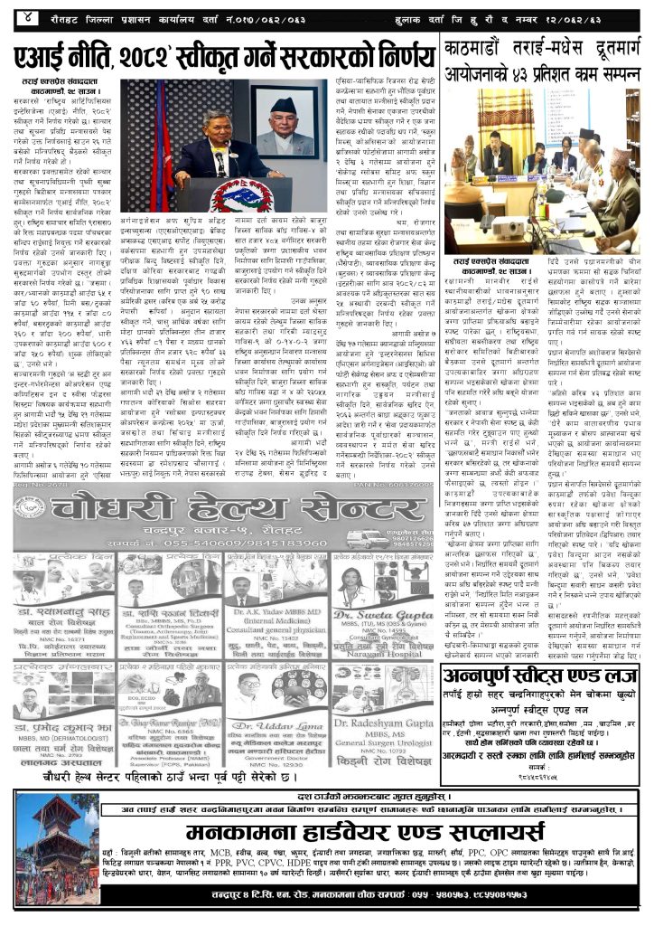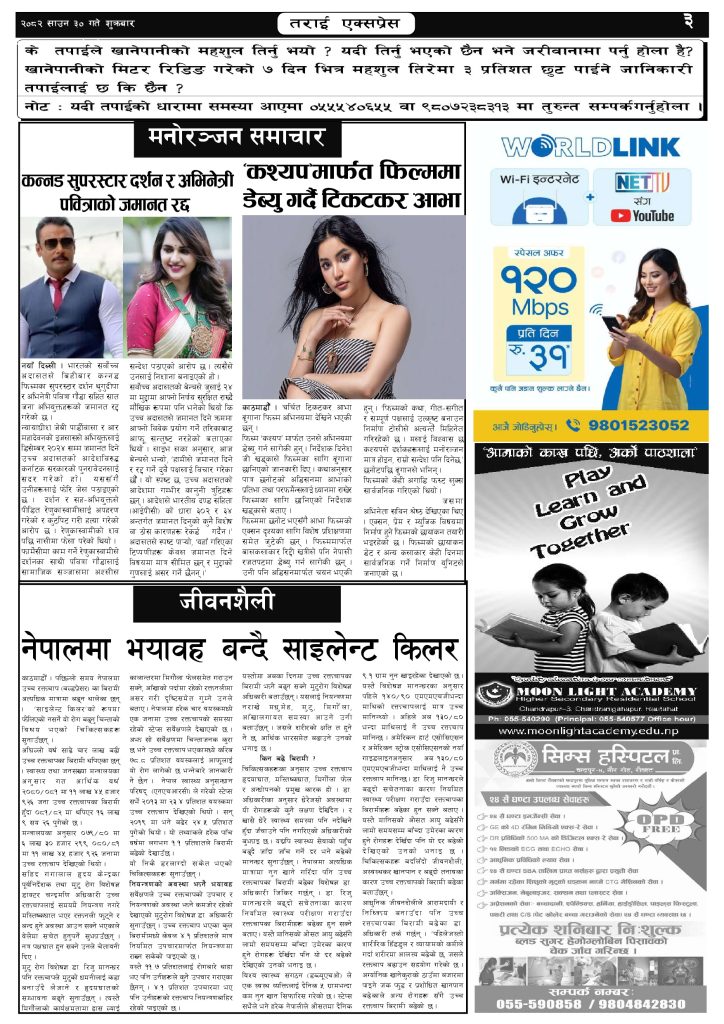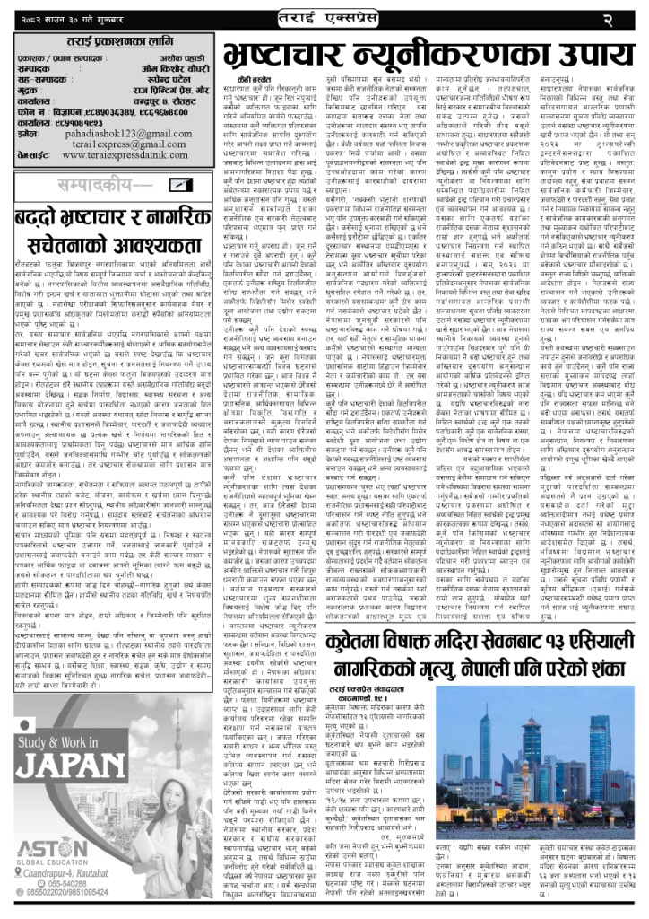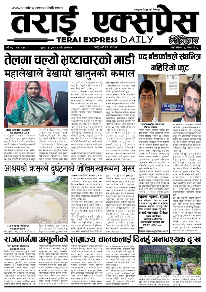 ई पेपर २०८२ साउन ३० गतेको तराई एक्सप्रेस दैनिक तराई एक्सप्रेस दैनिक - August 15, 2025 RELATED ARTICLESMORE FROM AUTHOR २०७३ वैशाख ९ गतेको तराई एक्सप्रेस दैनिक २०८२ वैशाख ८ गतेको तराई एक्सप्रेस दैनिक २०७३ वैशाख ३ गतेको तराई एक्सप्रेस दैनिक ताजा अपडेट ४० करोड कागज मिलाएको आरोपले मौलापुर ततायो April 23, 2026 ‘सेफ गल्र्स’ परियोजनाअन्तर्गत सेवा प्रदायक लक्षित पाँच दिने तालिम सम्पन्न April 23, 2026 यातायात व्यवस्था कार्यालय गौरमा सेवाग्राहीलाई ठगी गरेको आरोपमा एक जना पक्राउ April 22, 2026 जिल्ला धाउने दिन सकिने दाबी, व्यवहारमा कति सम्भव ? April 22, 2026 २६ दिनमै ढल्यो गृहमन्त्रीको कुर्सी, सुधन गुरुङ ‘लगानी काण्ड’मा आउट! April 22, 2026 धेरैले पढेको ४० करोड कागज मिलाएको आरोपले मौलापुर ततायो April 23, 2026 ‘सेफ गल्र्स’ परियोजनाअन्तर्गत सेवा प्रदायक लक्षित पाँच दिने तालिम सम्पन्न April 23, 2026 यातायात व्यवस्था कार्यालय गौरमा सेवाग्राहीलाई ठगी गरेको आरोपमा एक जना पक्राउ April 22, 2026 जिल्ला धाउने दिन सकिने दाबी, व्यवहारमा कति सम्भव ? April 22, 2026 २६ दिनमै ढल्यो गृहमन्त्रीको कुर्सी, सुधन गुरुङ ‘लगानी काण्ड’मा आउट! April 22, 2026